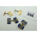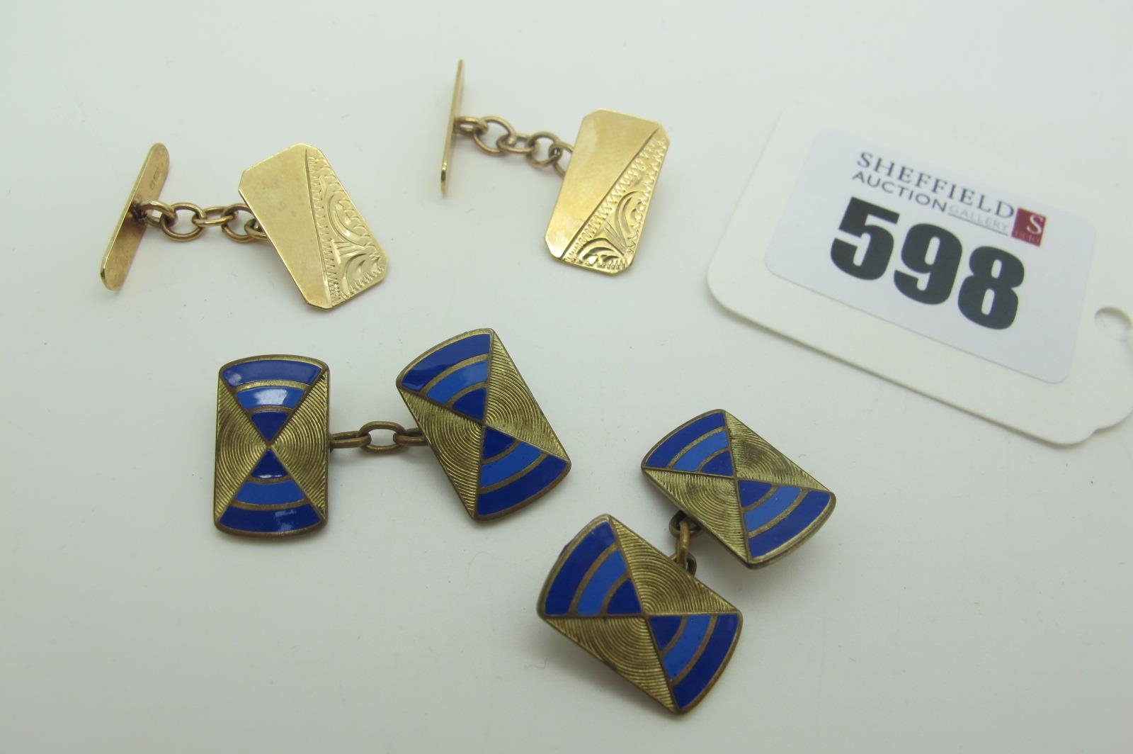 A Pair of 9ct Gold Cufflinks, with part engraved decoration, on chain connections (3.2grams); together with a further pair of cufflinks, with enamel detail.