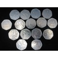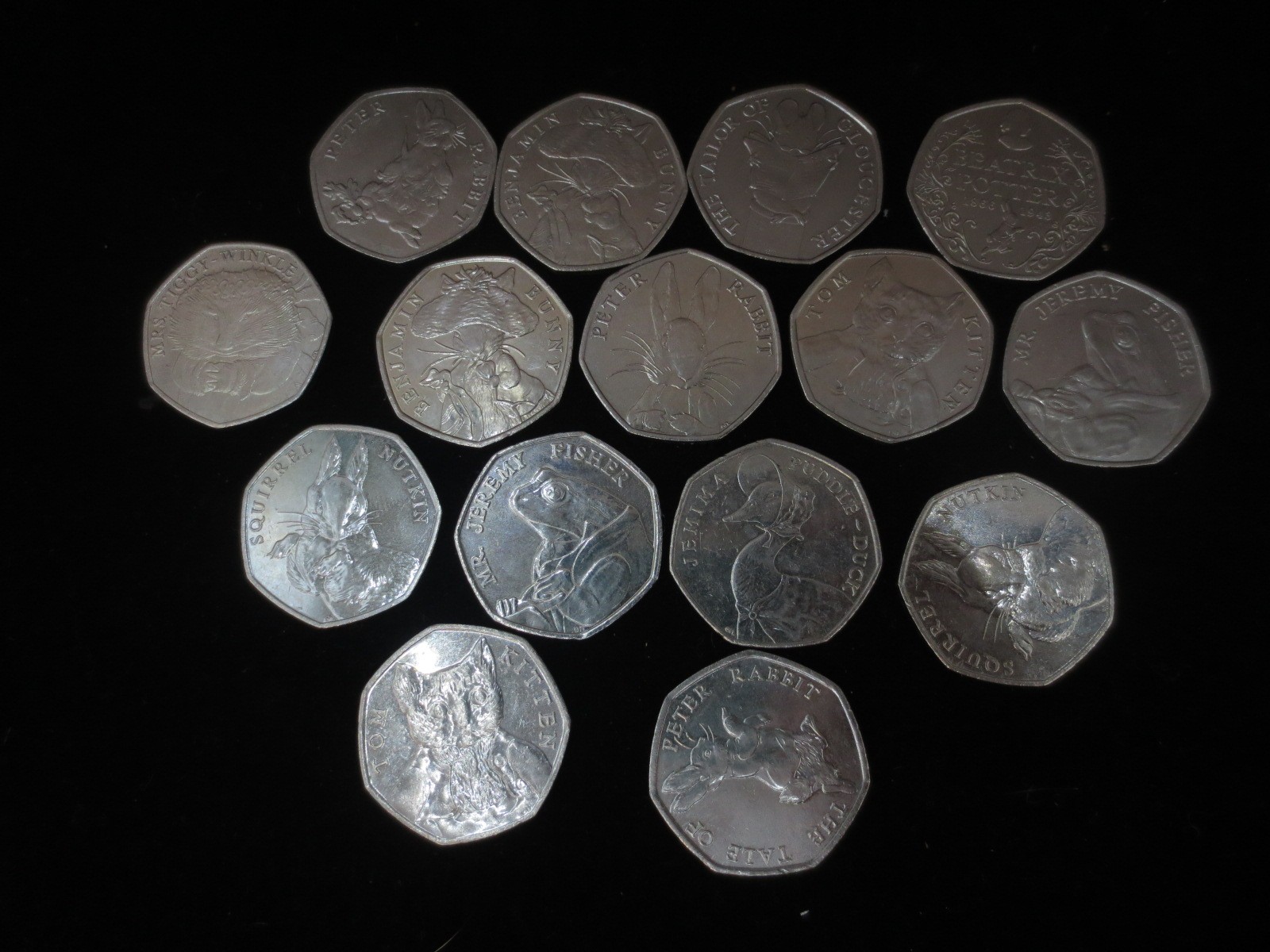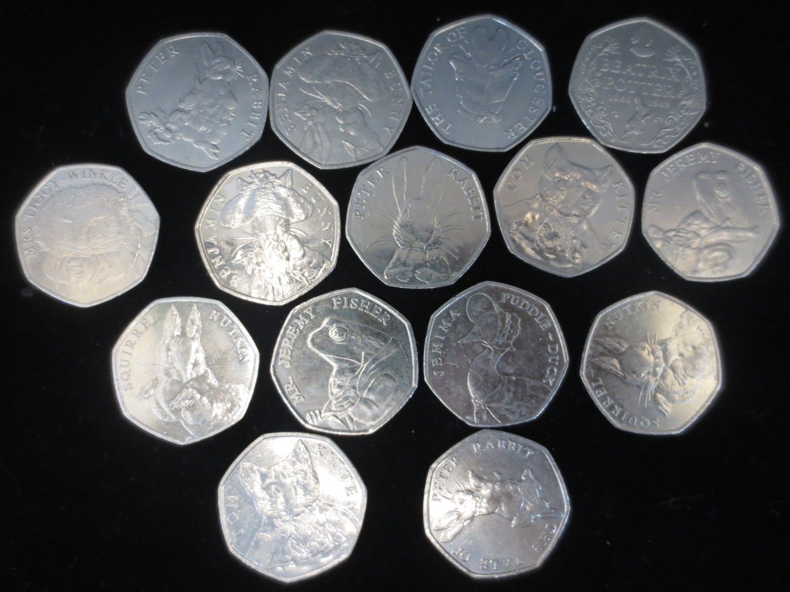 Fifteen Beatrix Potter fifty pence coins 2016-2018, together with a small quantity of mixed coins including