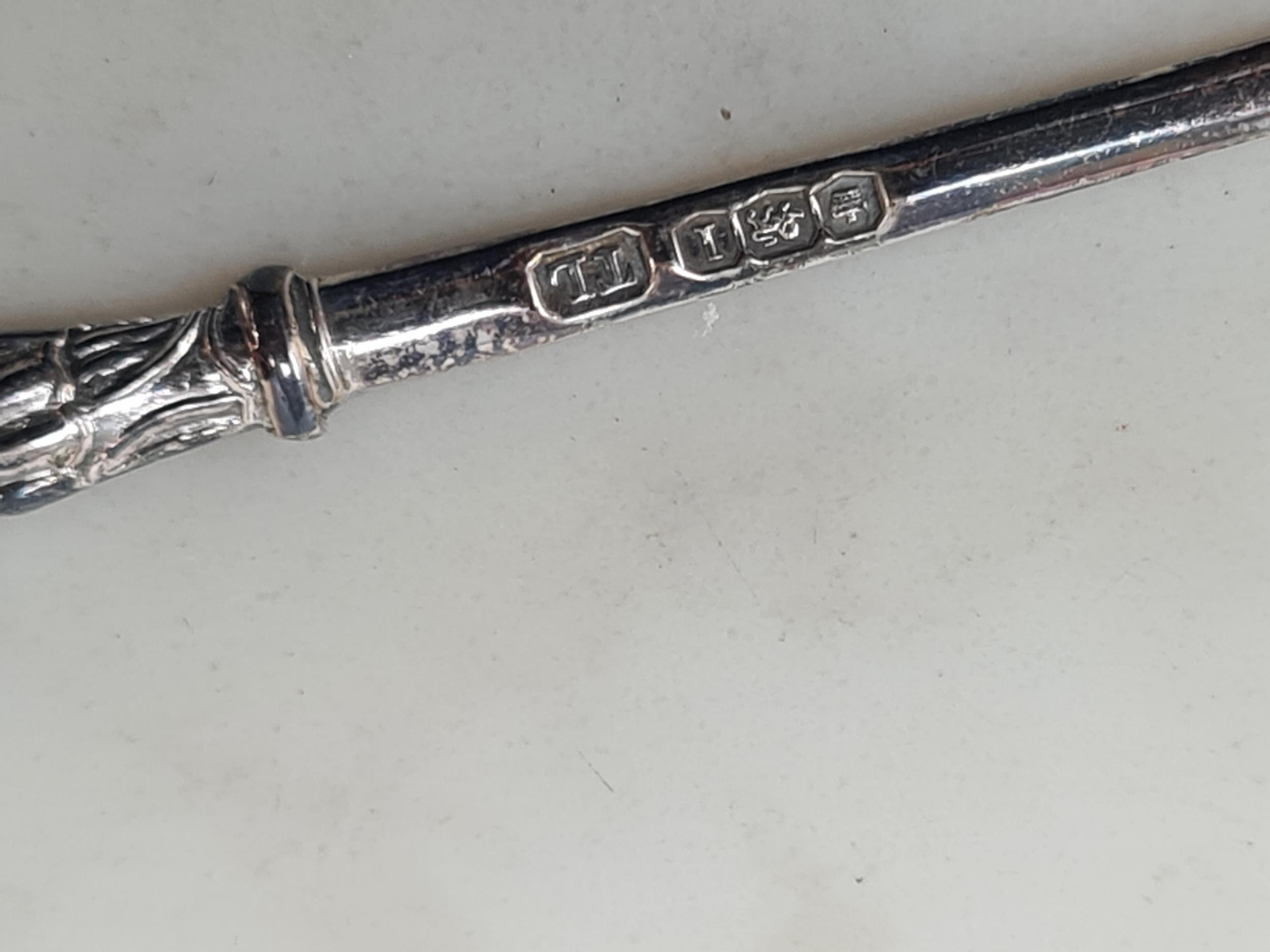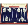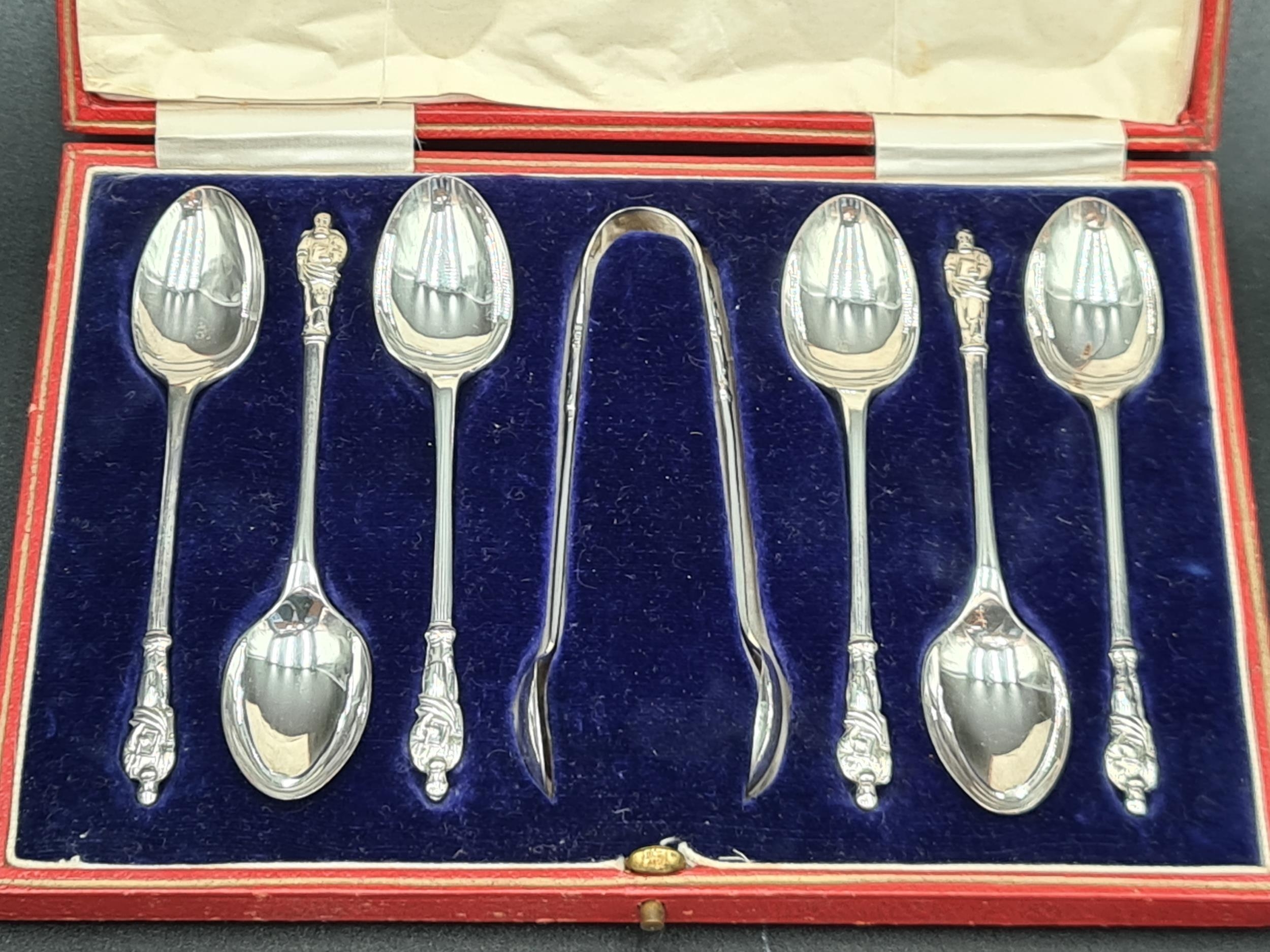 Six George V silver apostle handled Teaspoons and Sugar Tongs, Sheffield 1928, in case, 92gms