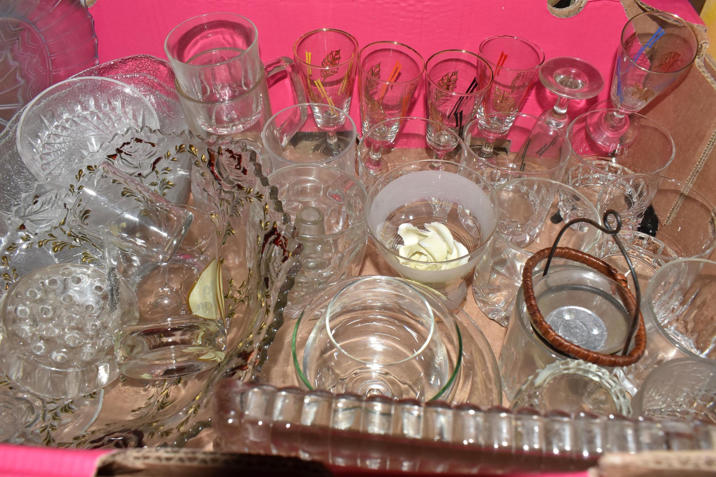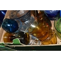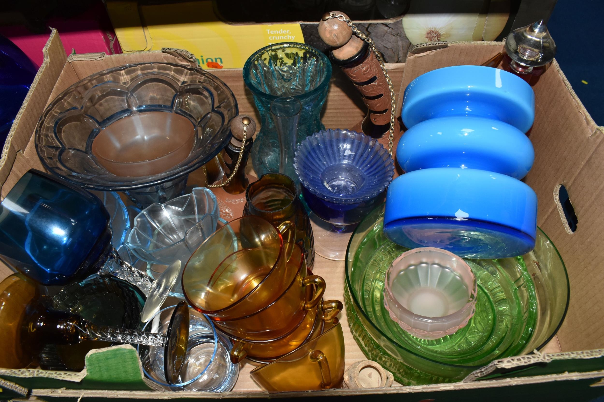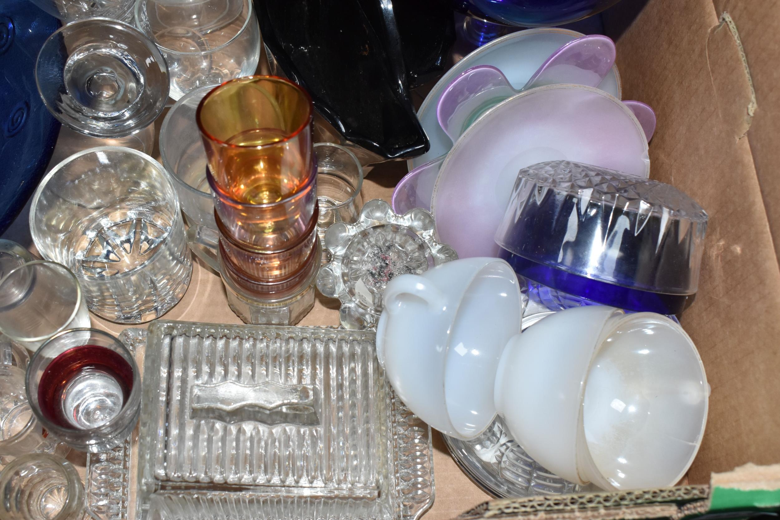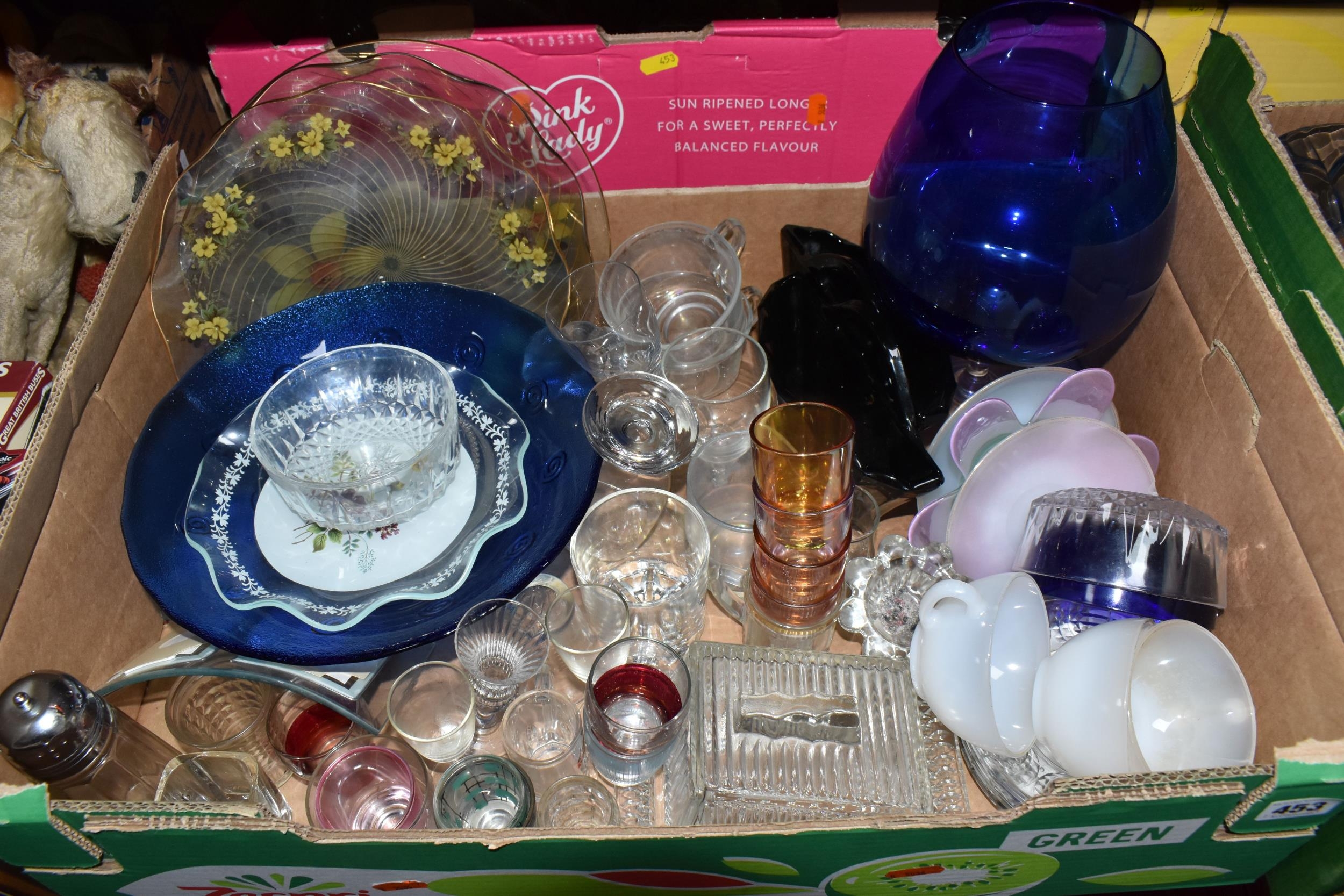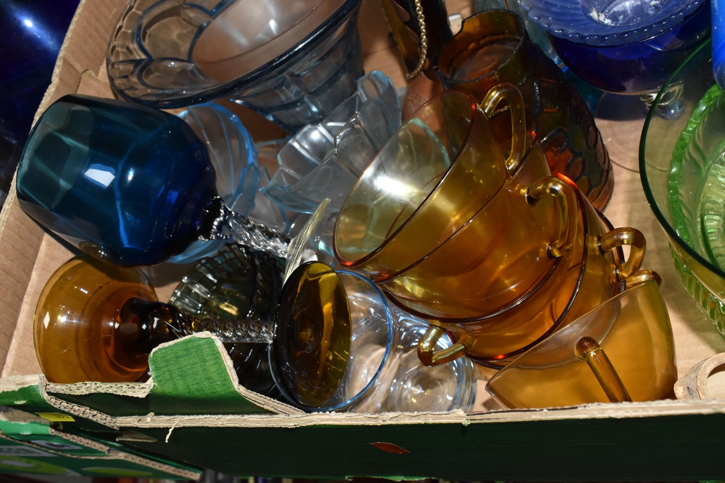 FOUR BOXES OF MIXED GLASSWARE to include six amber 'Verco' tea cups, four blue art deco style dessert dishes, a large ribbed blue decorative vase, three 'Arcopal' smoked tart dishes, four green fruit dishes, two green fruit bowls (cracked and chipped), a group of mixed shot glasses, two boxes of clear glass comprising a cake stand, dessert bowls, a group of six printed aperitif glasses, wine glasses, plates etc, (4 boxes) (s.d)