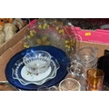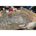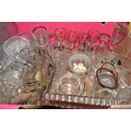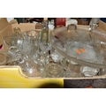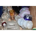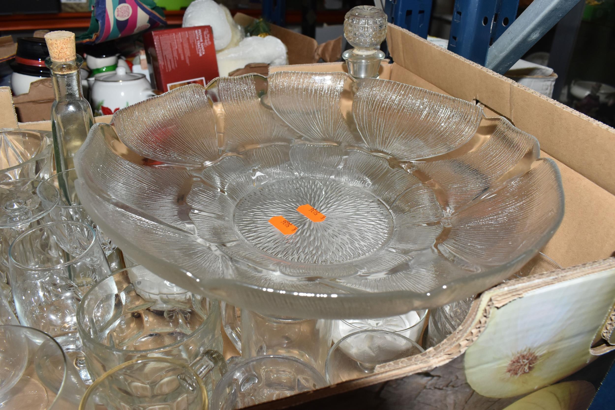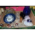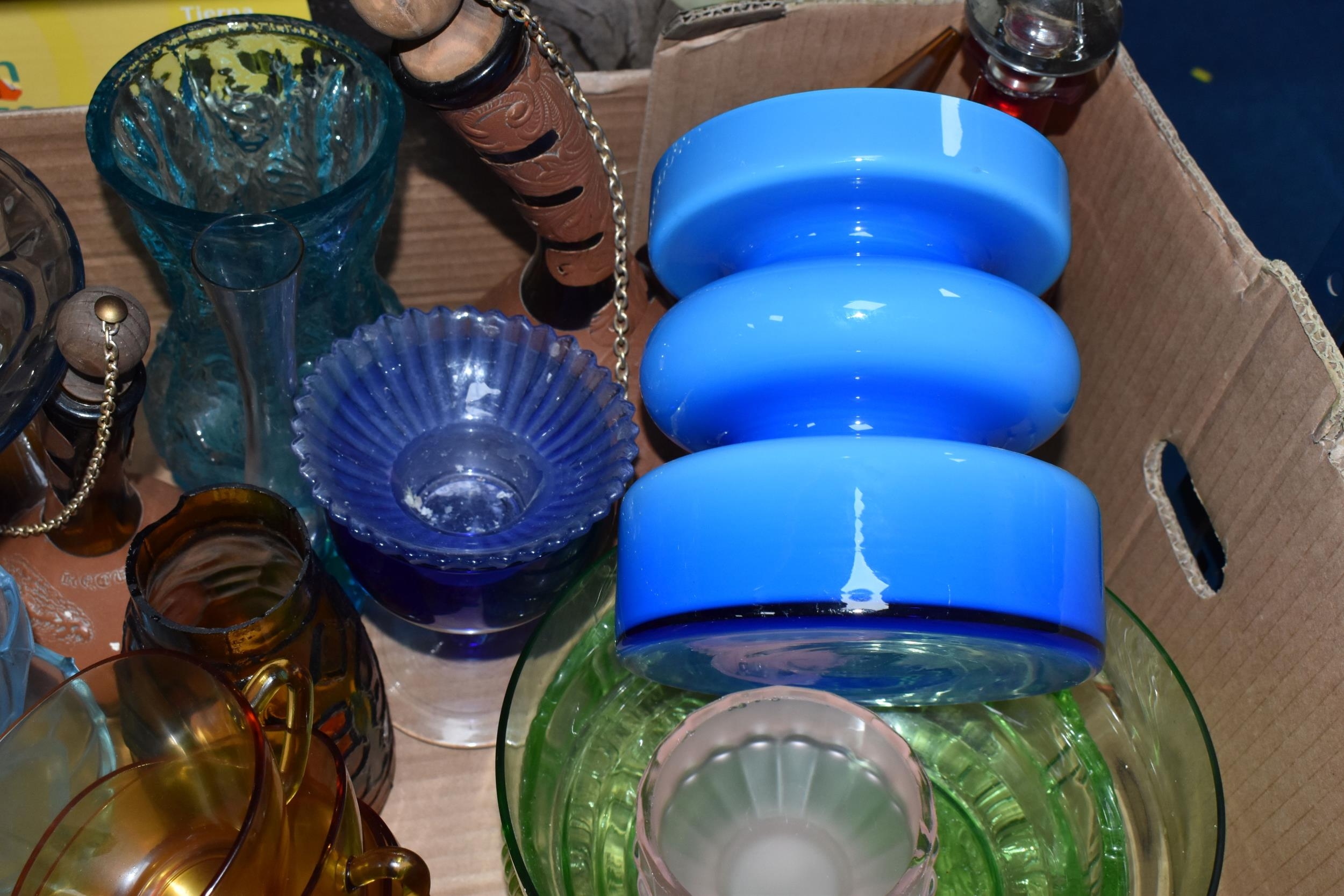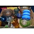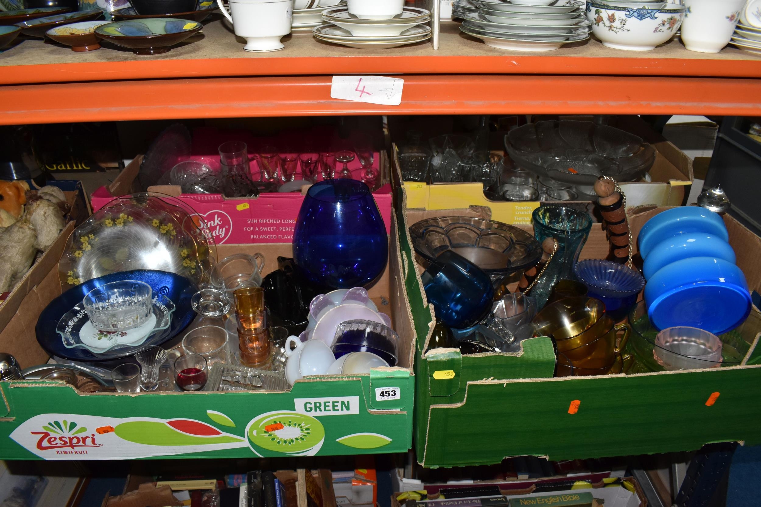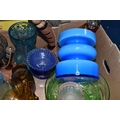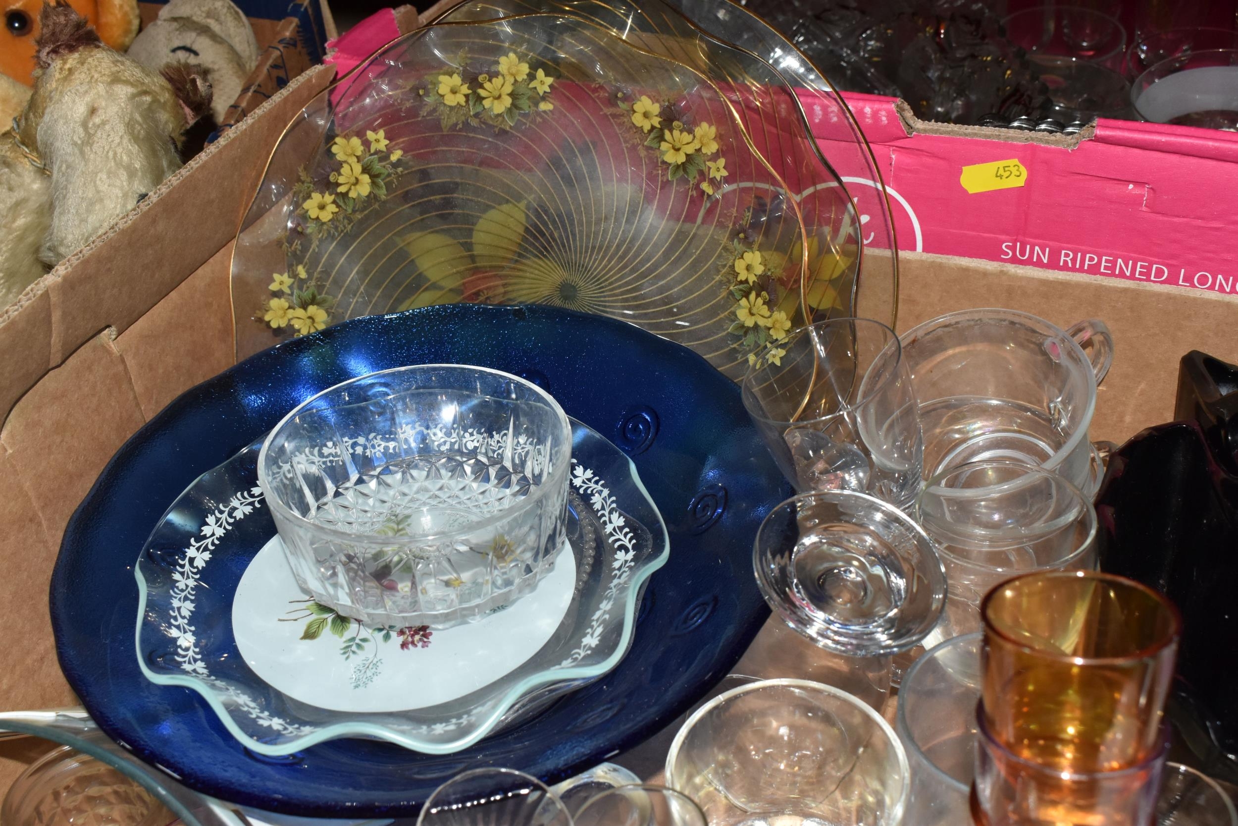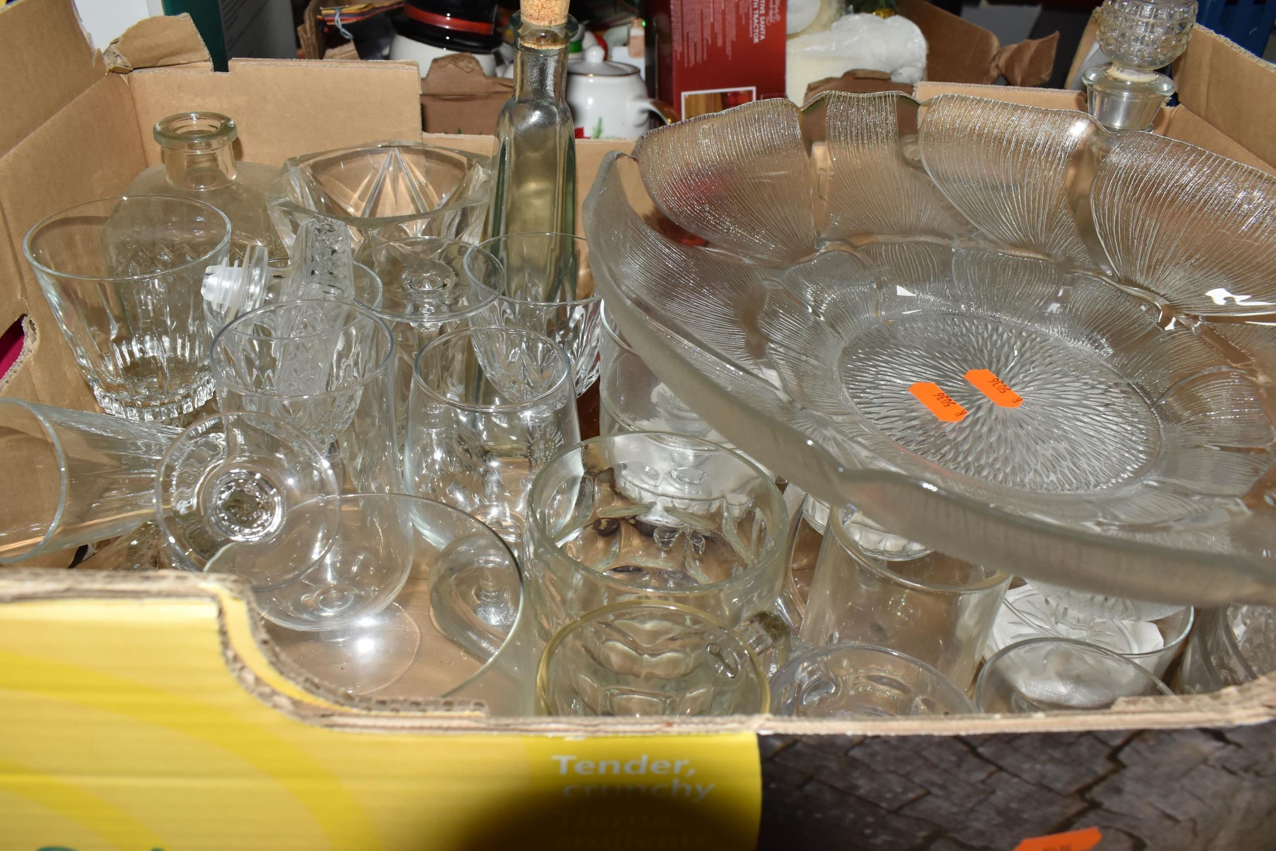 FOUR BOXES OF MIXED GLASSWARE to include six amber 'Verco' tea cups, four blue art deco style dessert dishes, a large ribbed blue decorative vase, three 'Arcopal' smoked tart dishes, four green fruit dishes, two green fruit bowls (cracked and chipped), a group of mixed shot glasses, two boxes of clear glass comprising a cake stand, dessert bowls, a group of six printed aperitif glasses, wine glasses, plates etc, (4 boxes) (s.d)