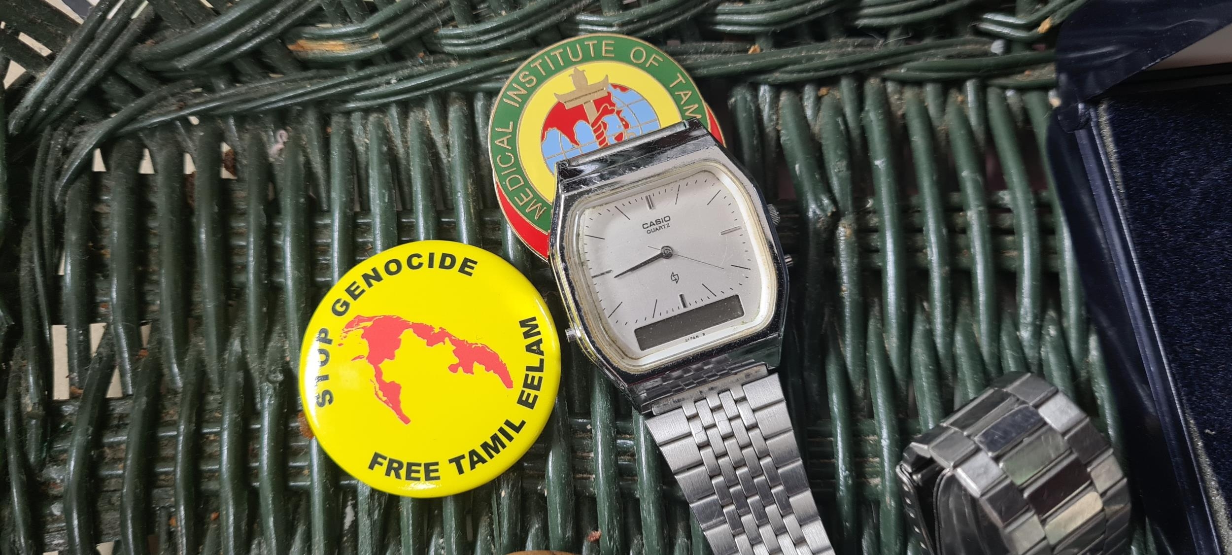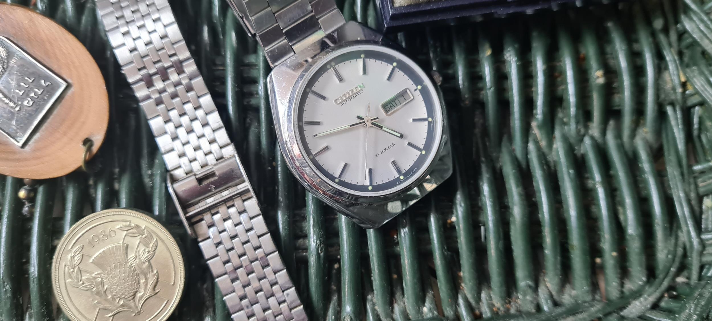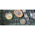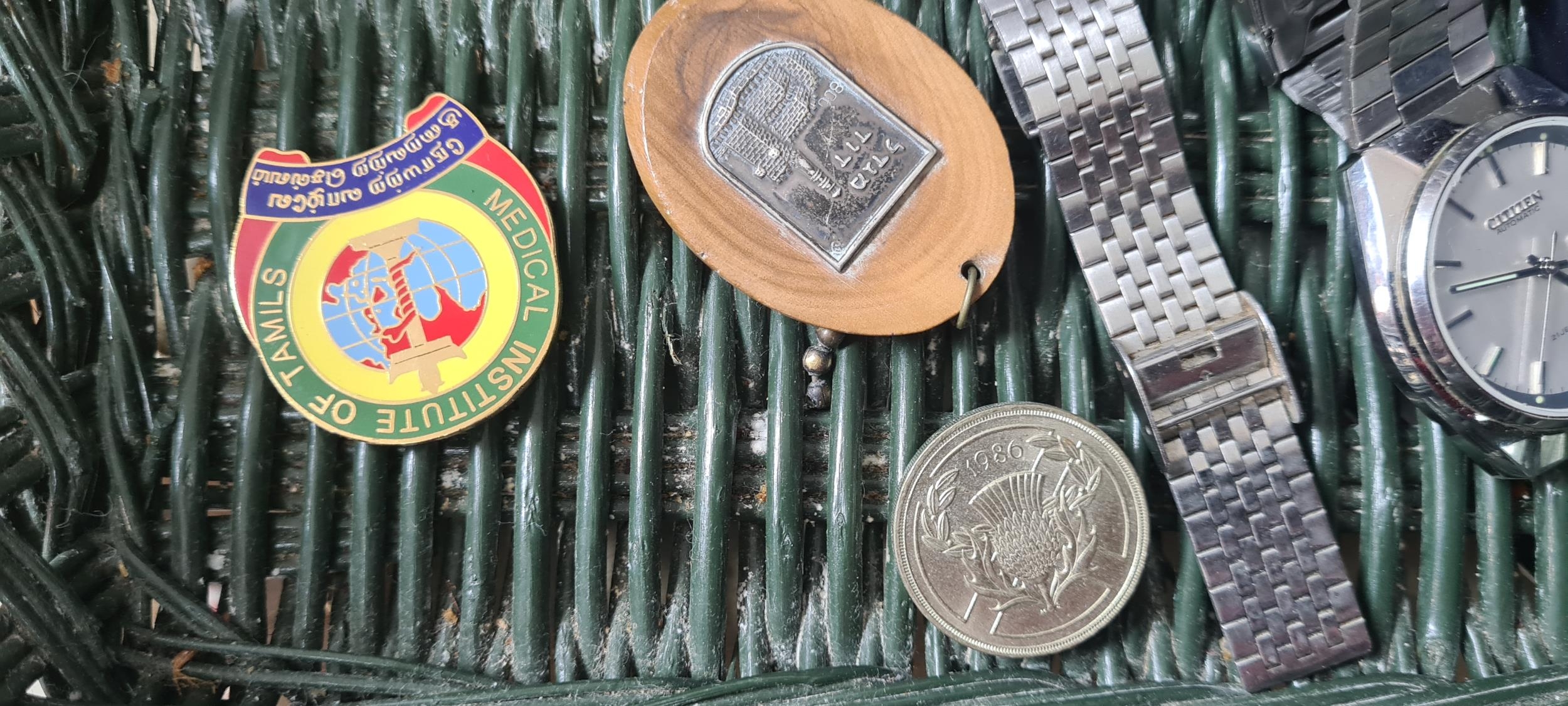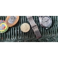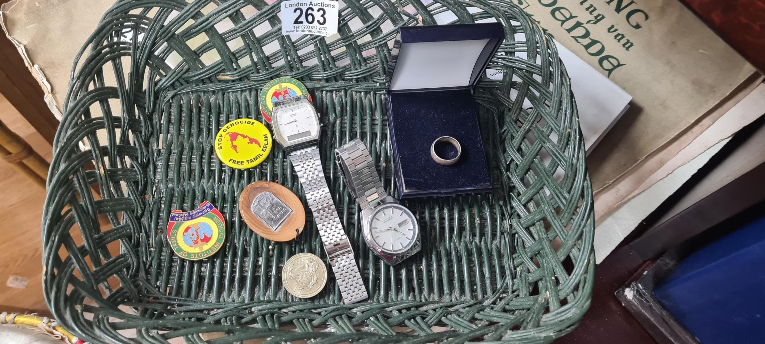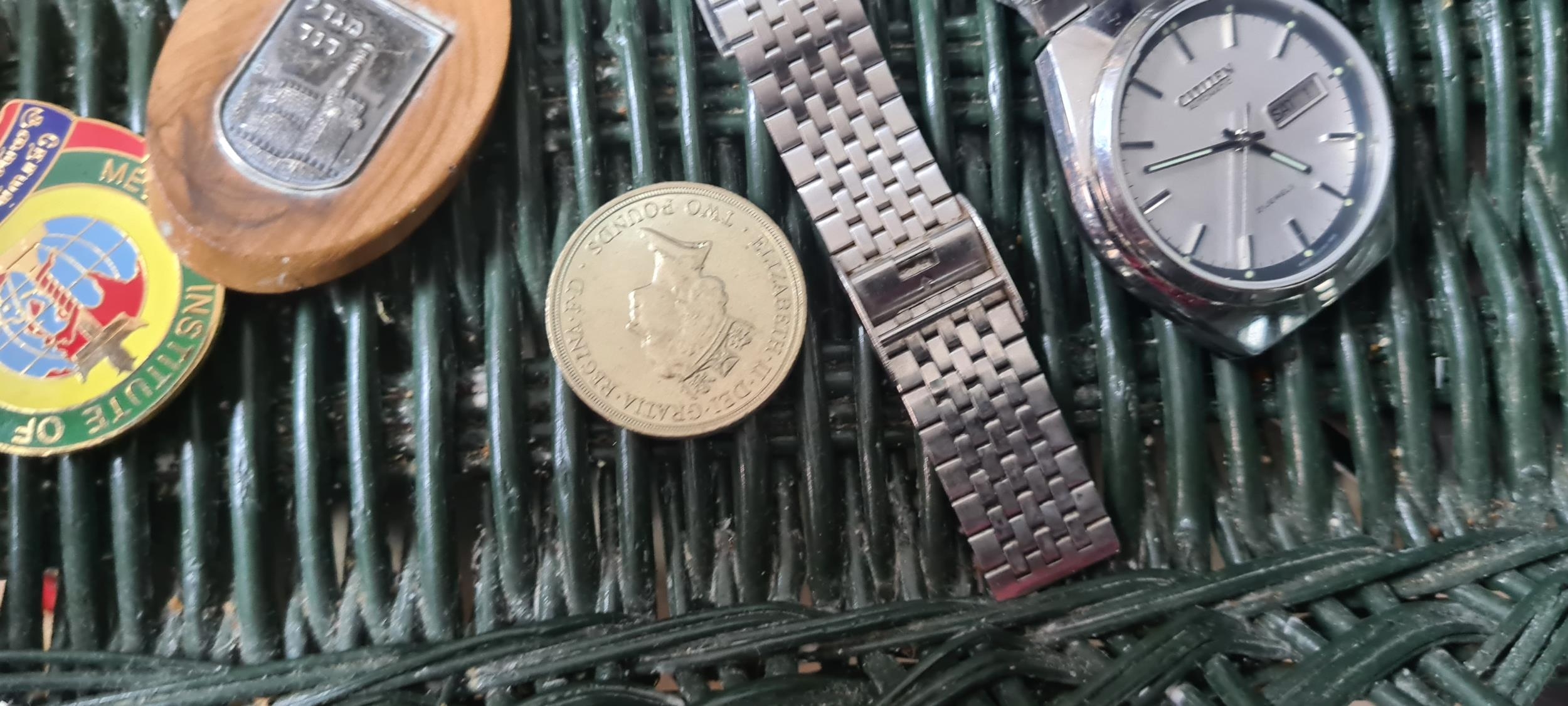 Mixed Lot Containing Old Badges, old £2 coin, silver ring, silver keyring, Citizen Watch Working, a casio watch etc