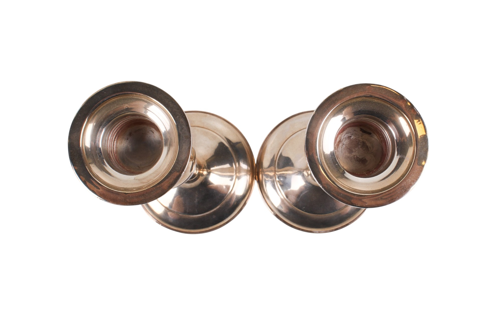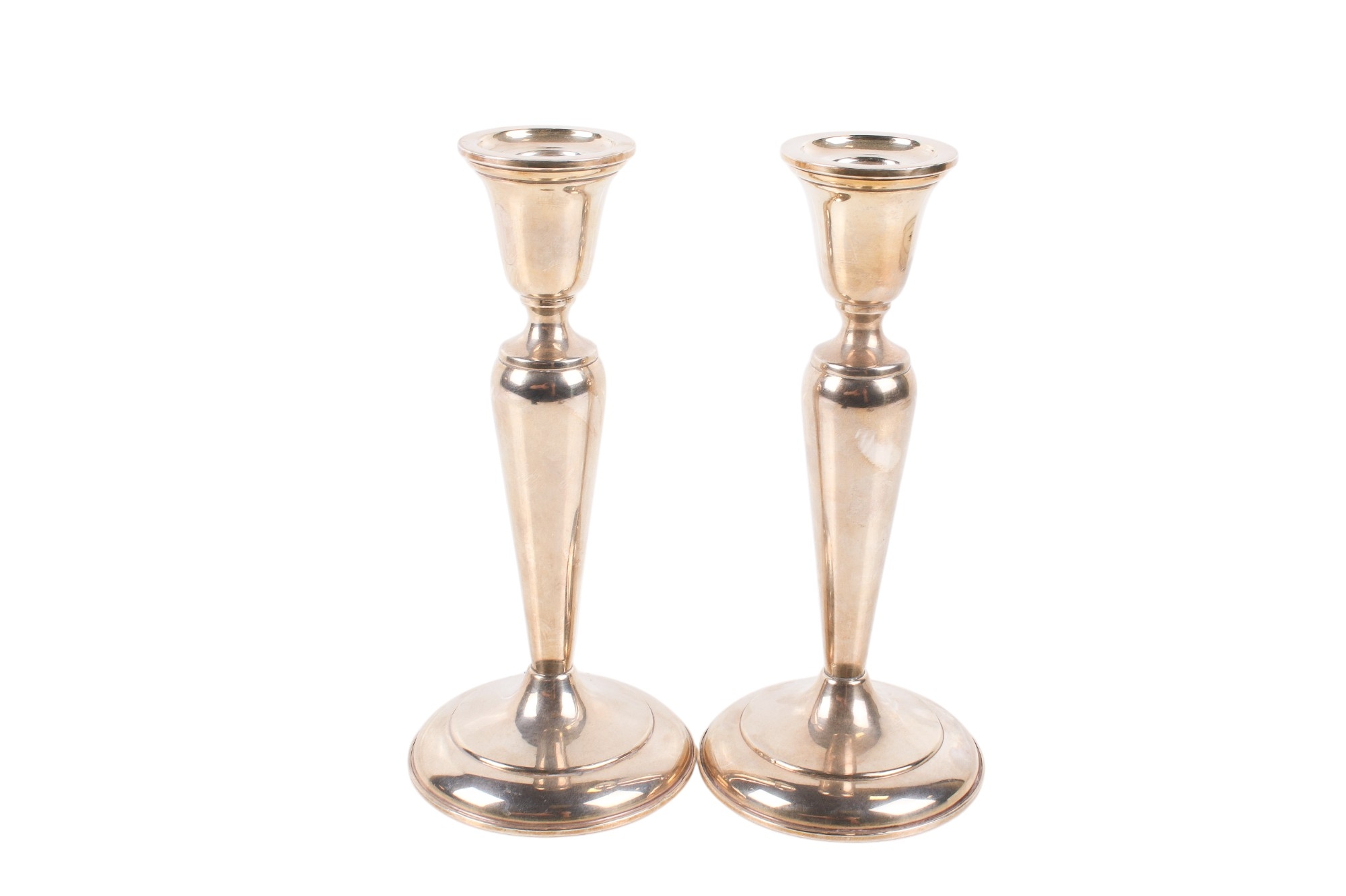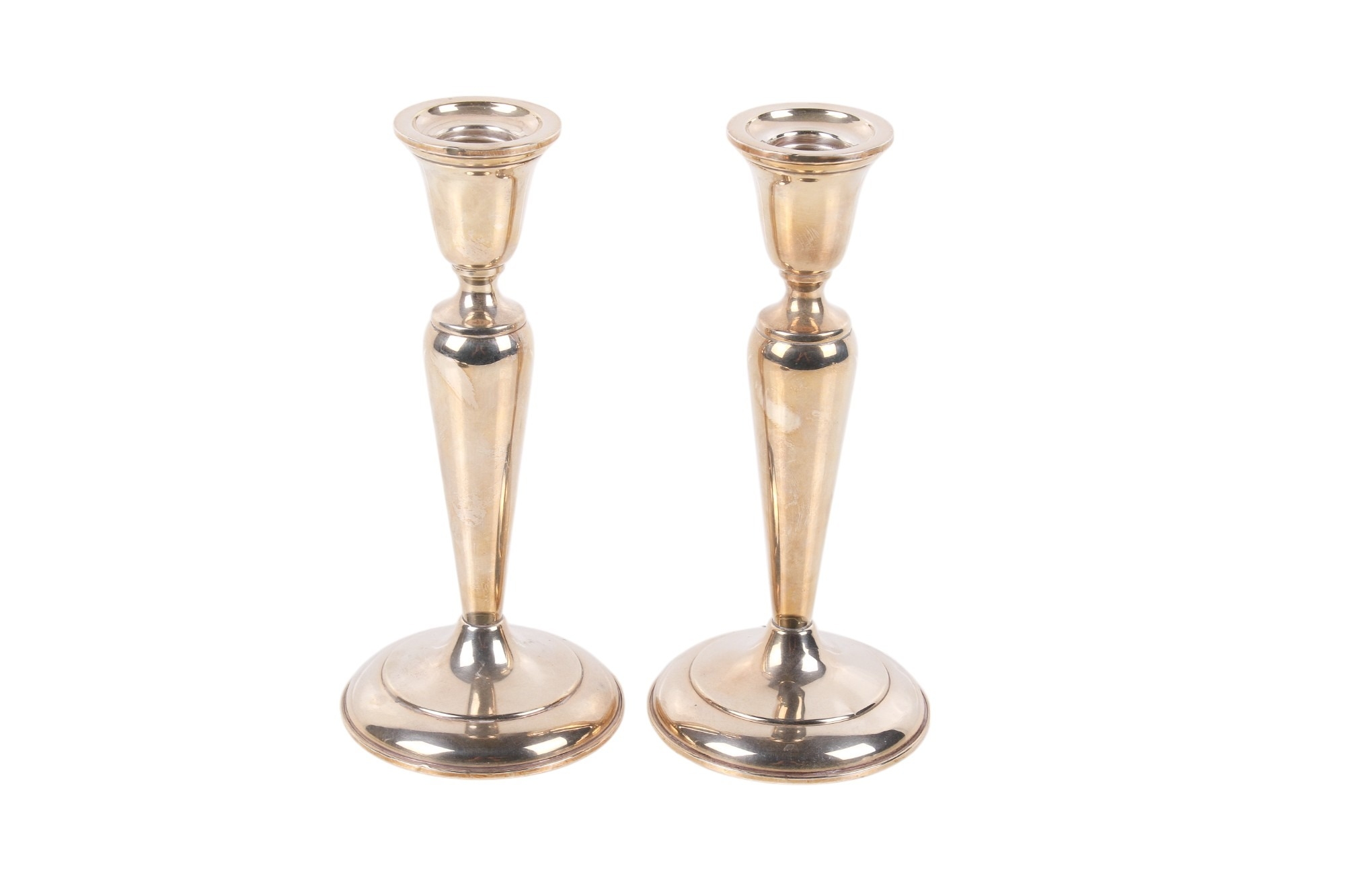 A pair of Cartier silver candlesticks. Weighted, of classical form on a spread foot. Marked 'Cartier sterling weighted' to the base, H18cm, gross weight 579.2g.