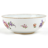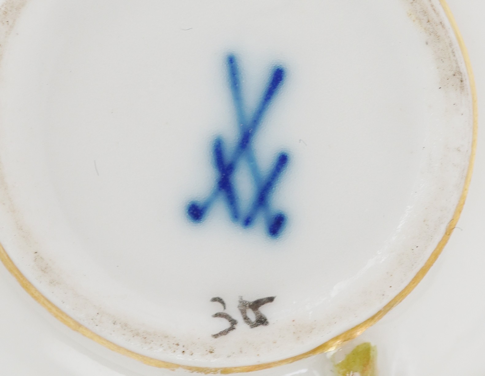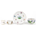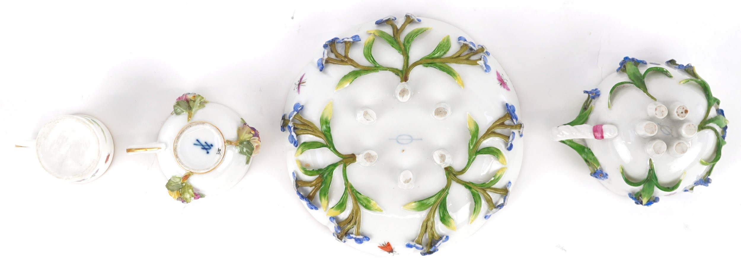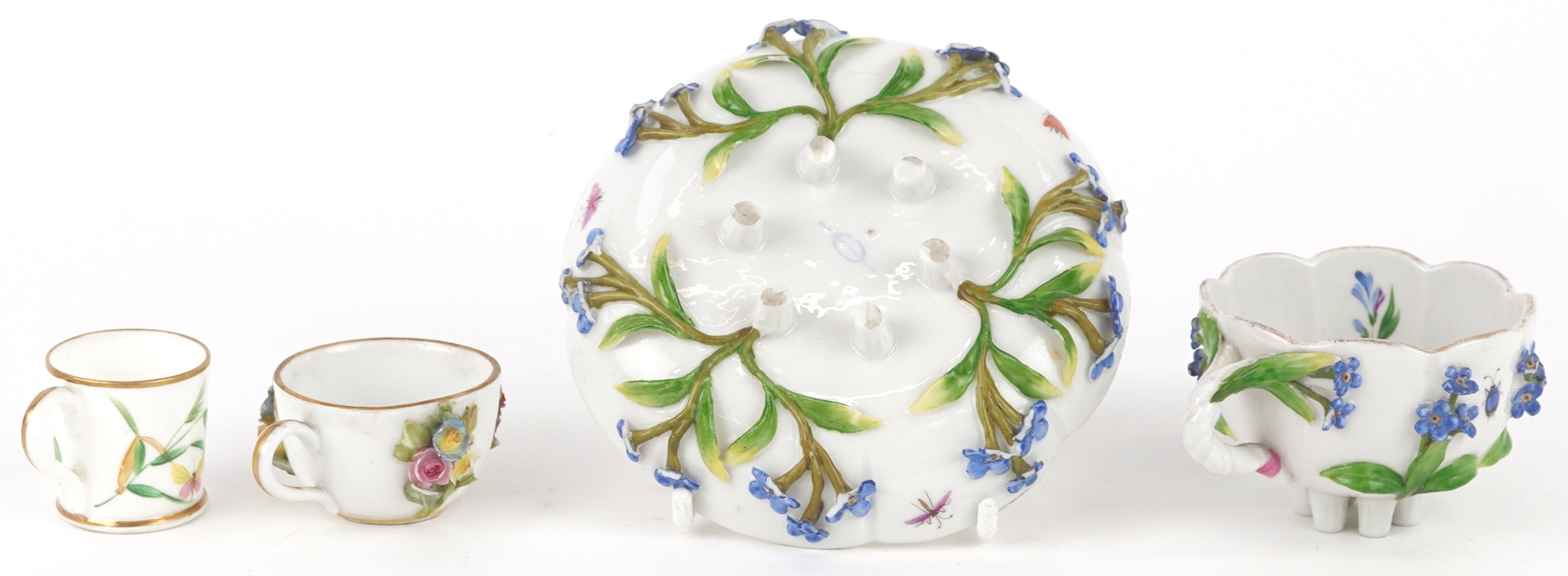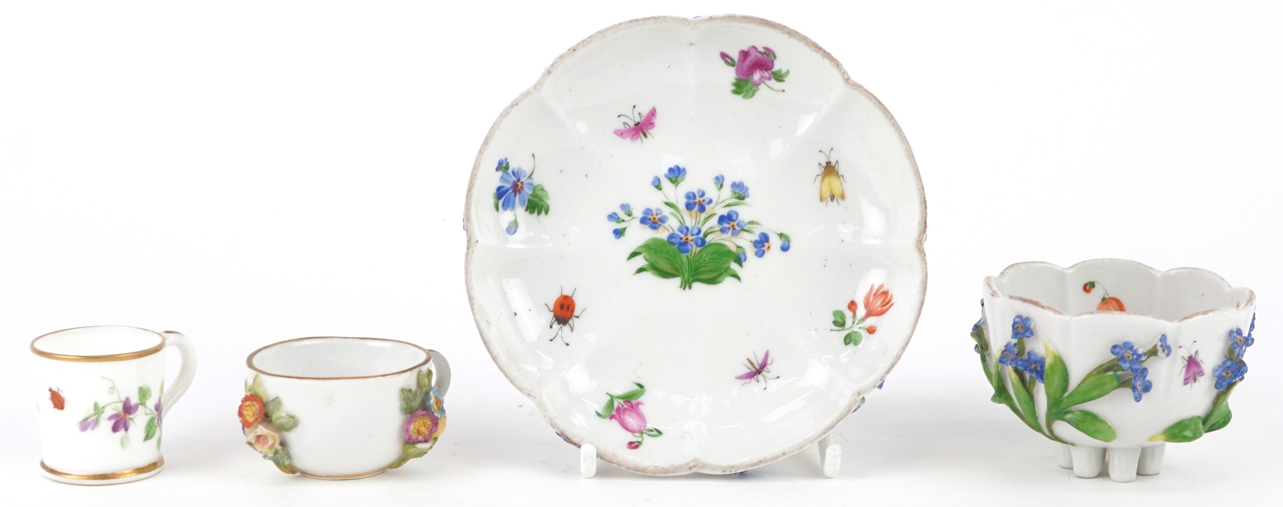 A Meissen porcelain cup and saucer decorated with flowers together with a similar diminutive cup and similar porcelain mug, the largest 11cm in diameter.