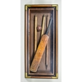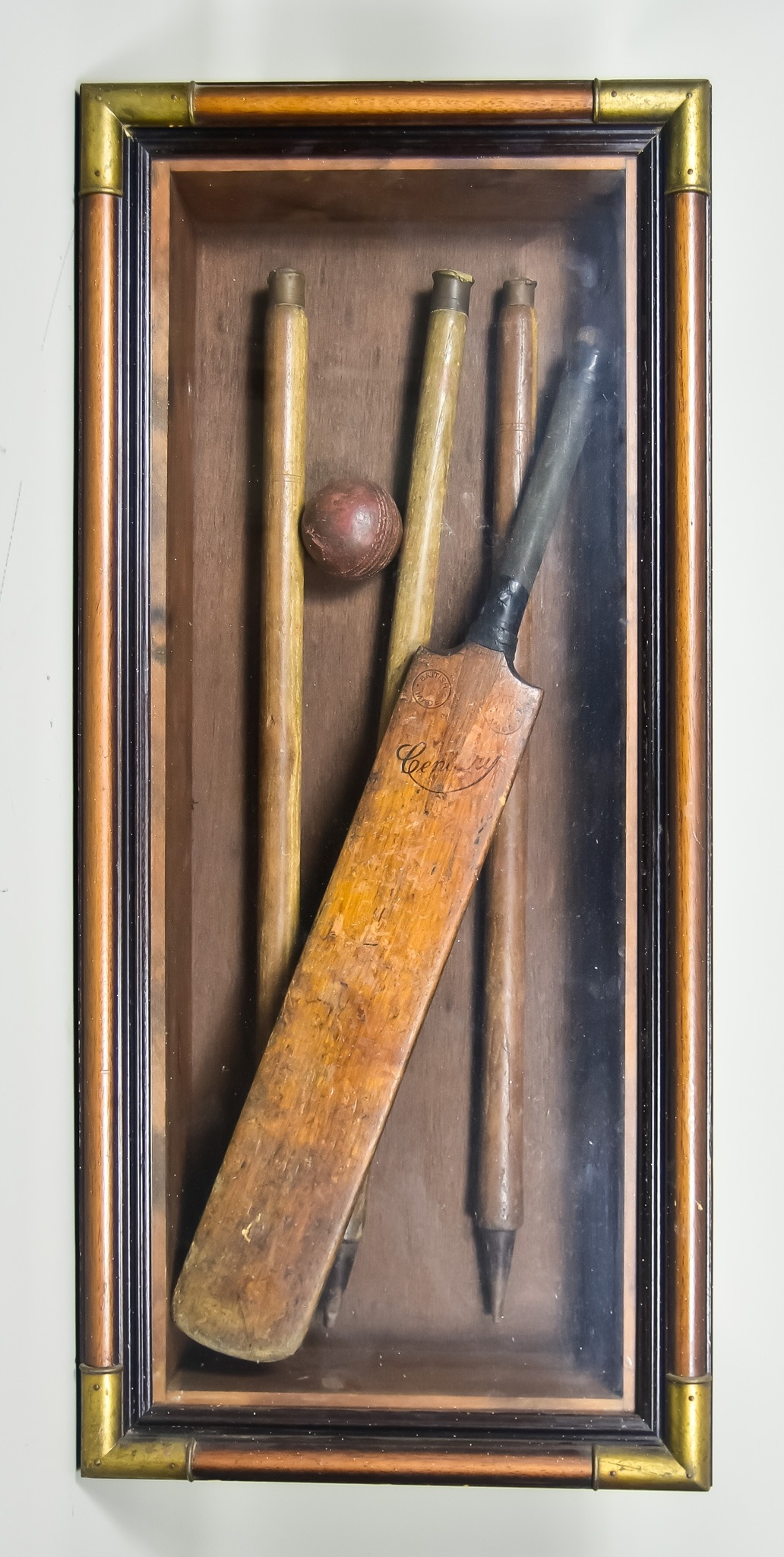 A Display Box of Cricketing Interest, Early 20th Century, comprising - bat, ball and three stumps, the bat marked 'Century, British made', fixed in a glazed wall cabinet with brass corners, 36.75ins x 16.25ins overall