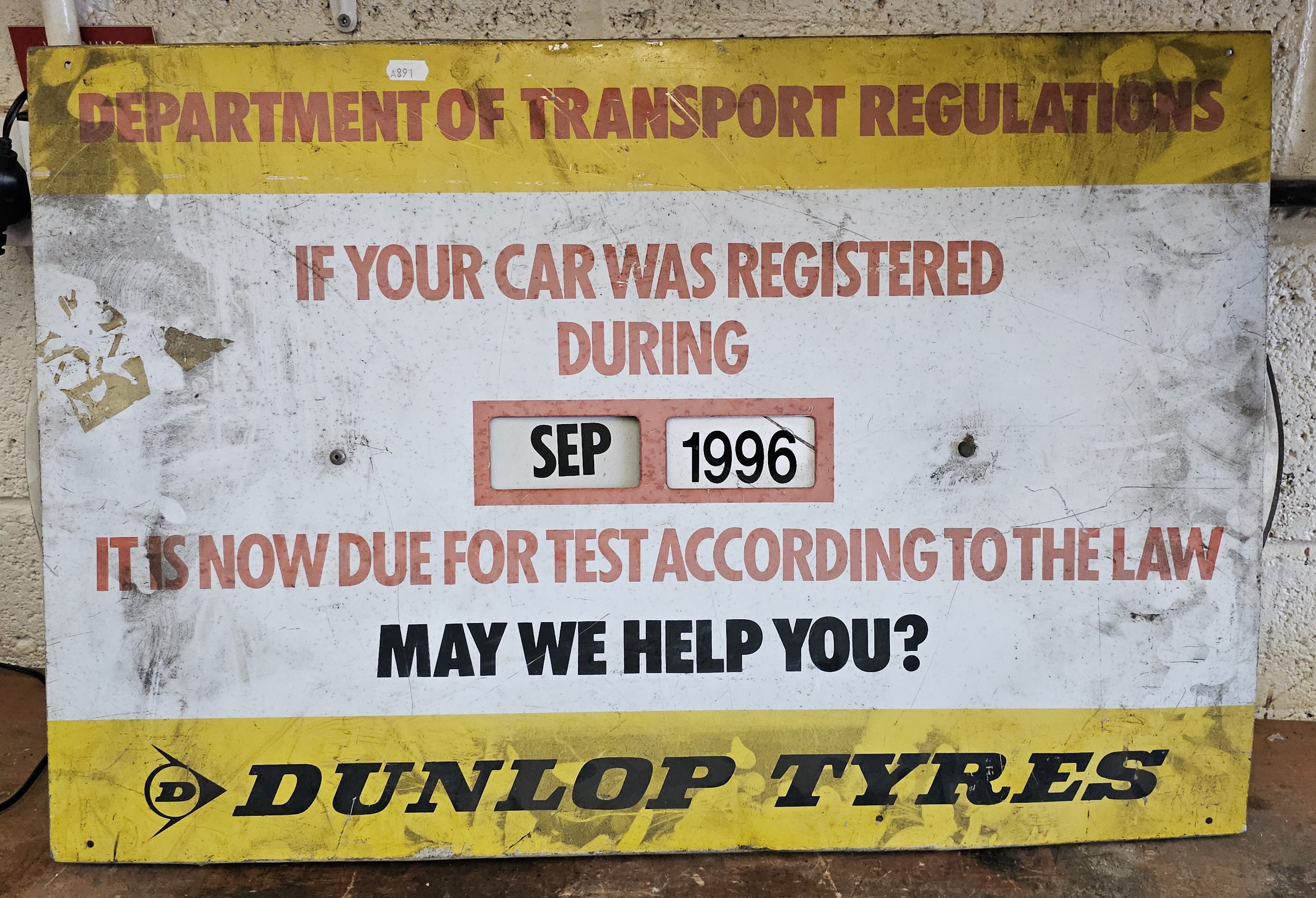 A Dunlop Tyres D. of T. alloy sign, 51 x 77cm