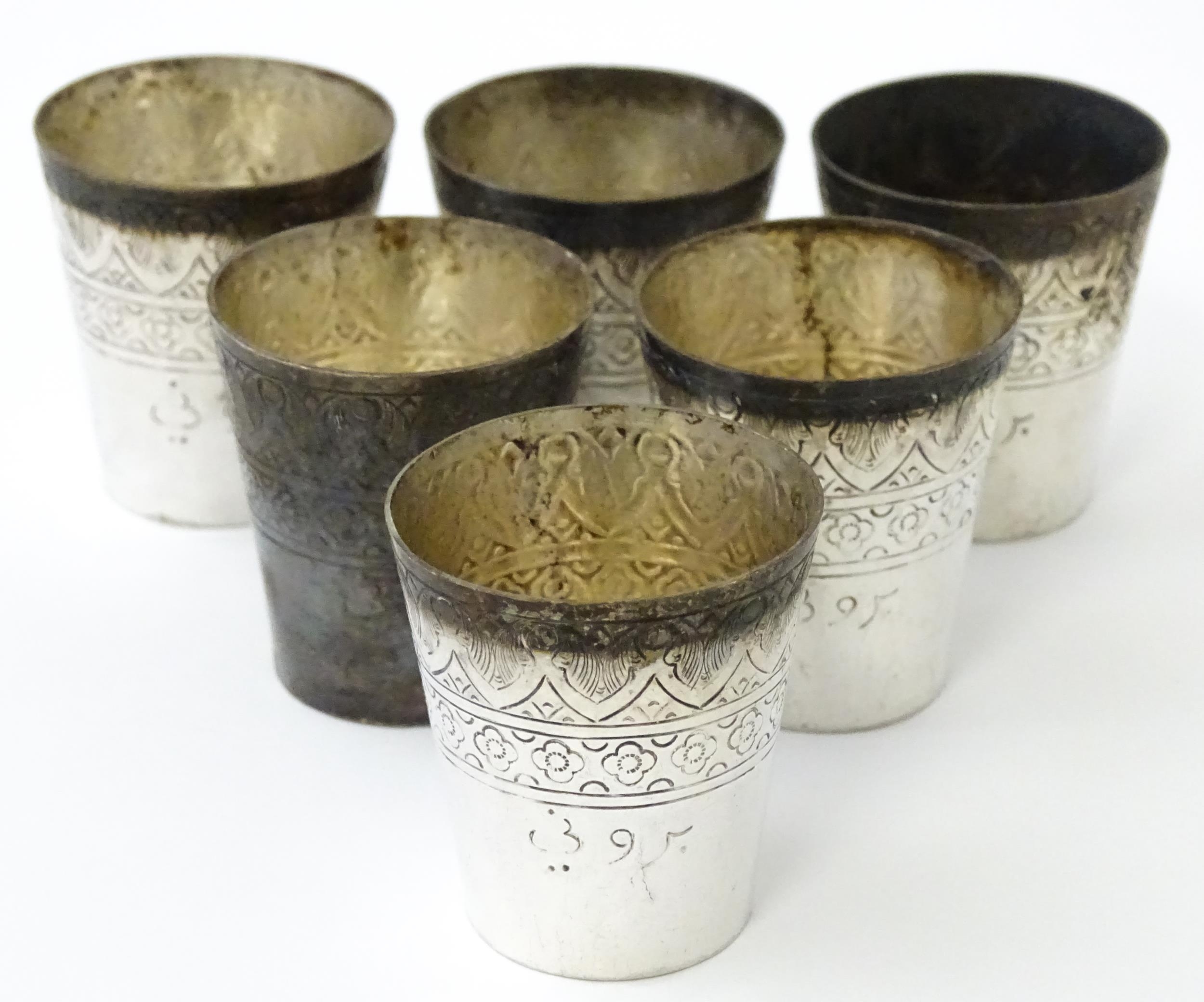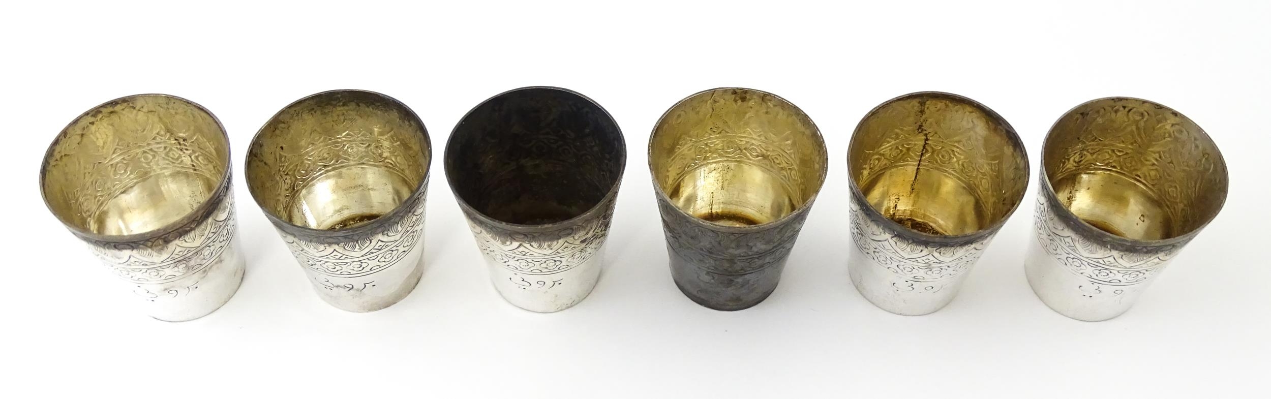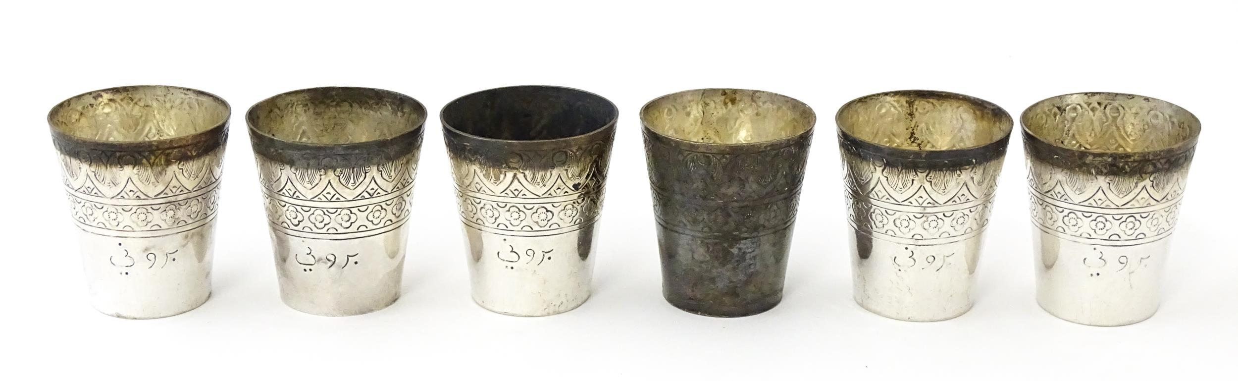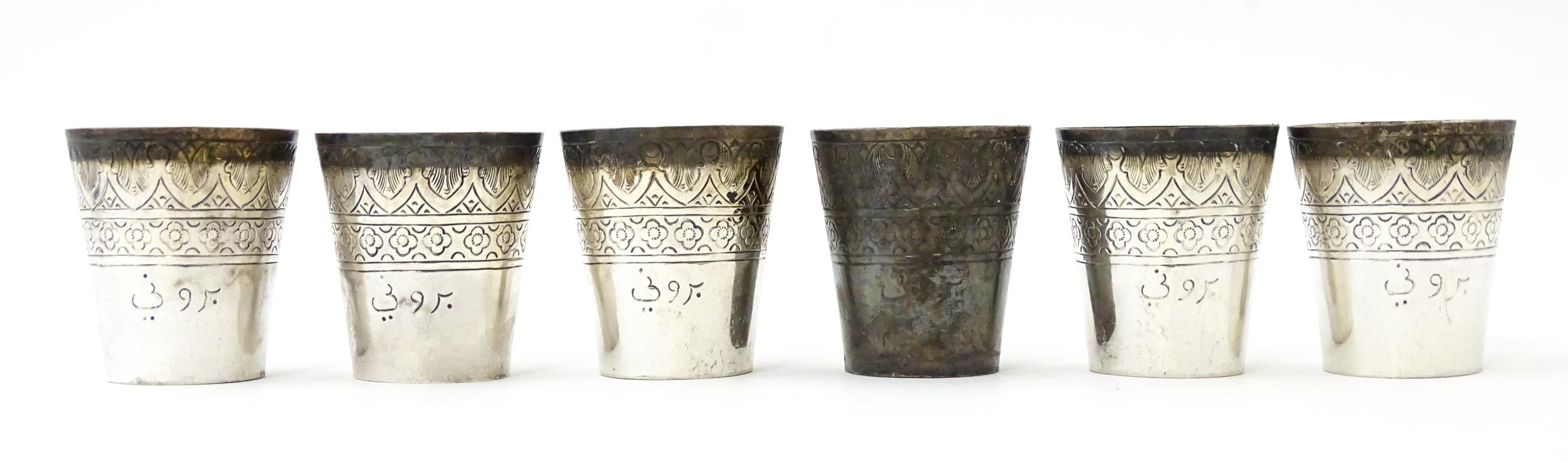 A set of six white metal tot cups with engraved decoration and Persian style script. Approx 1 1/2" high (6)