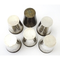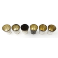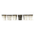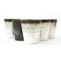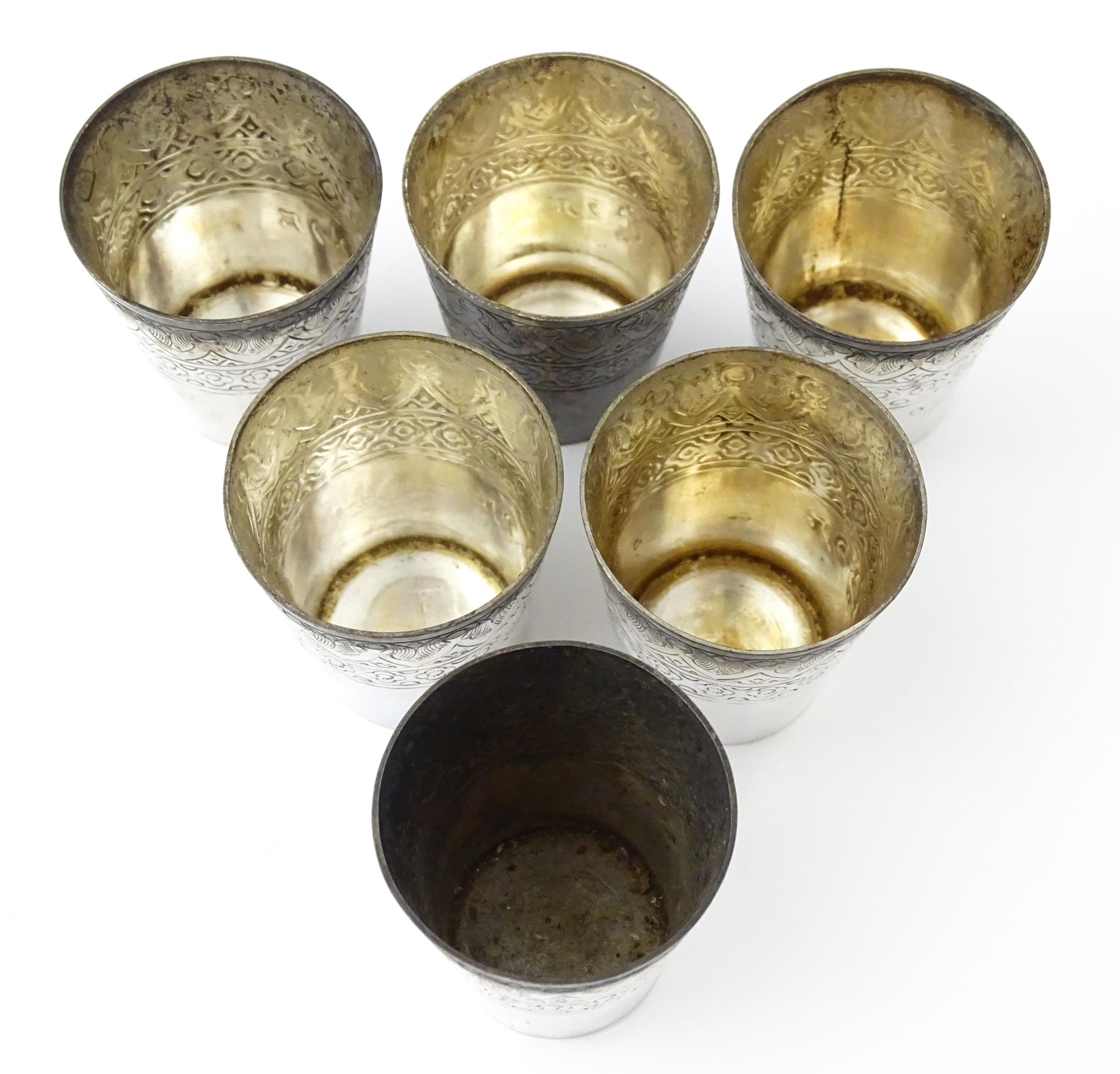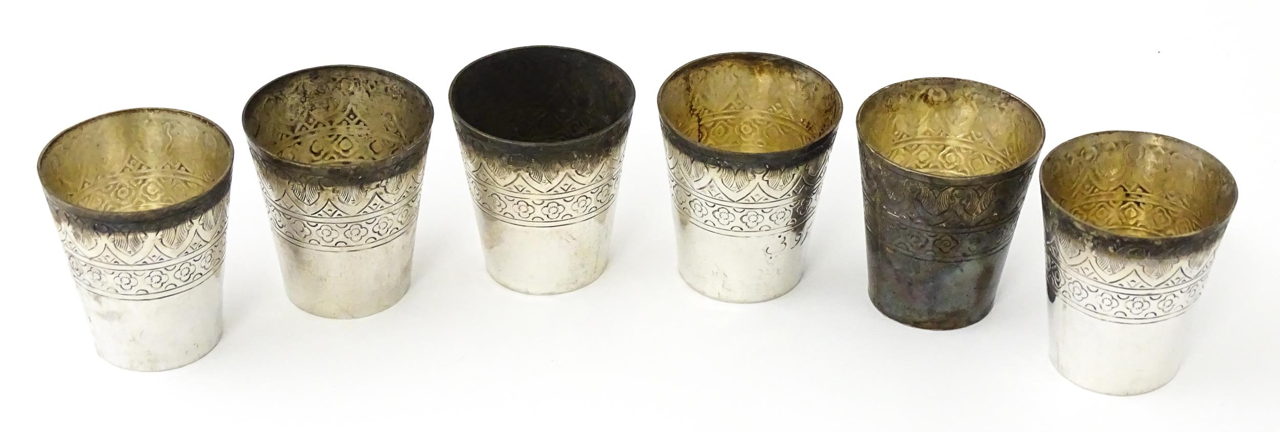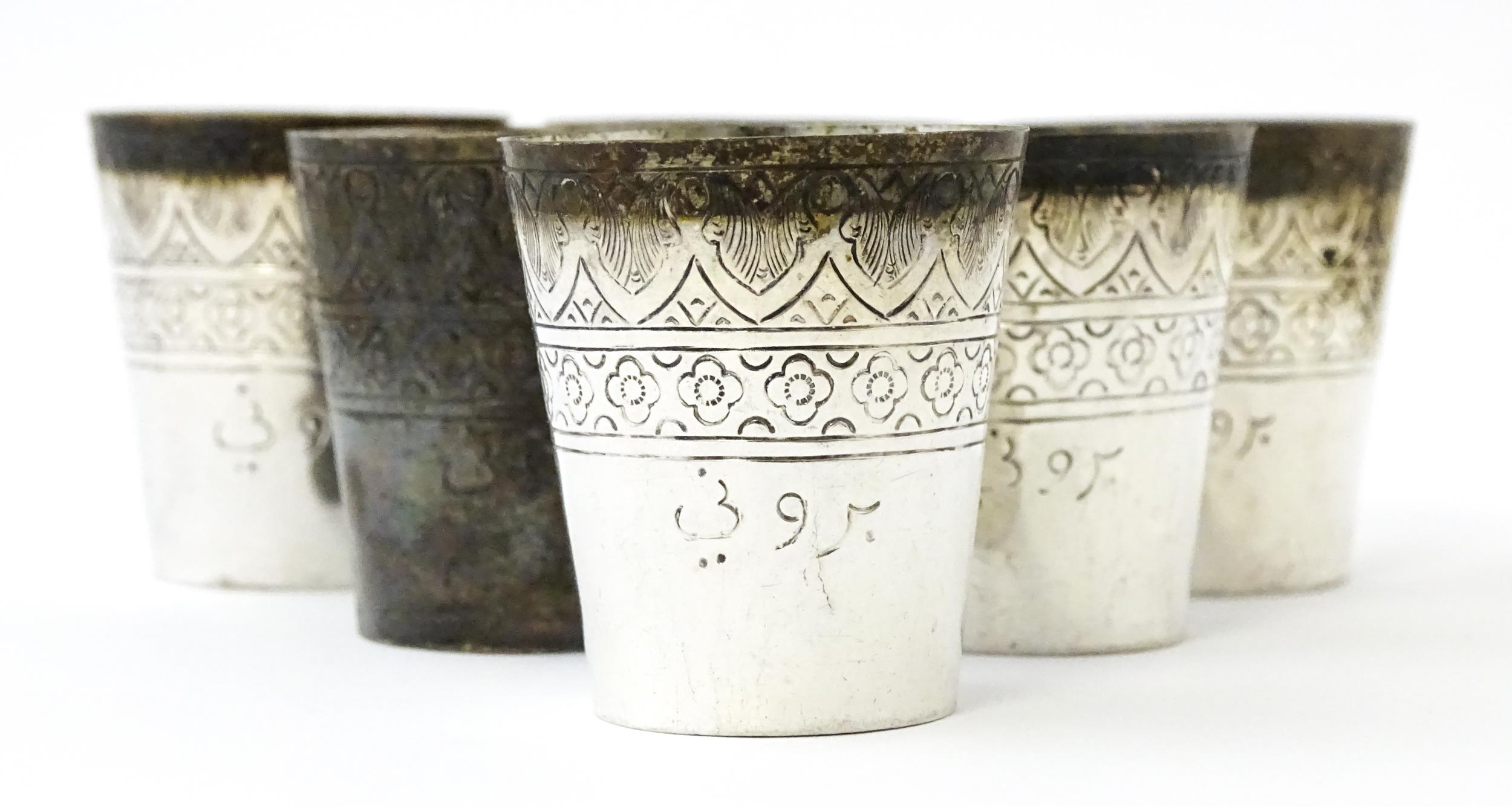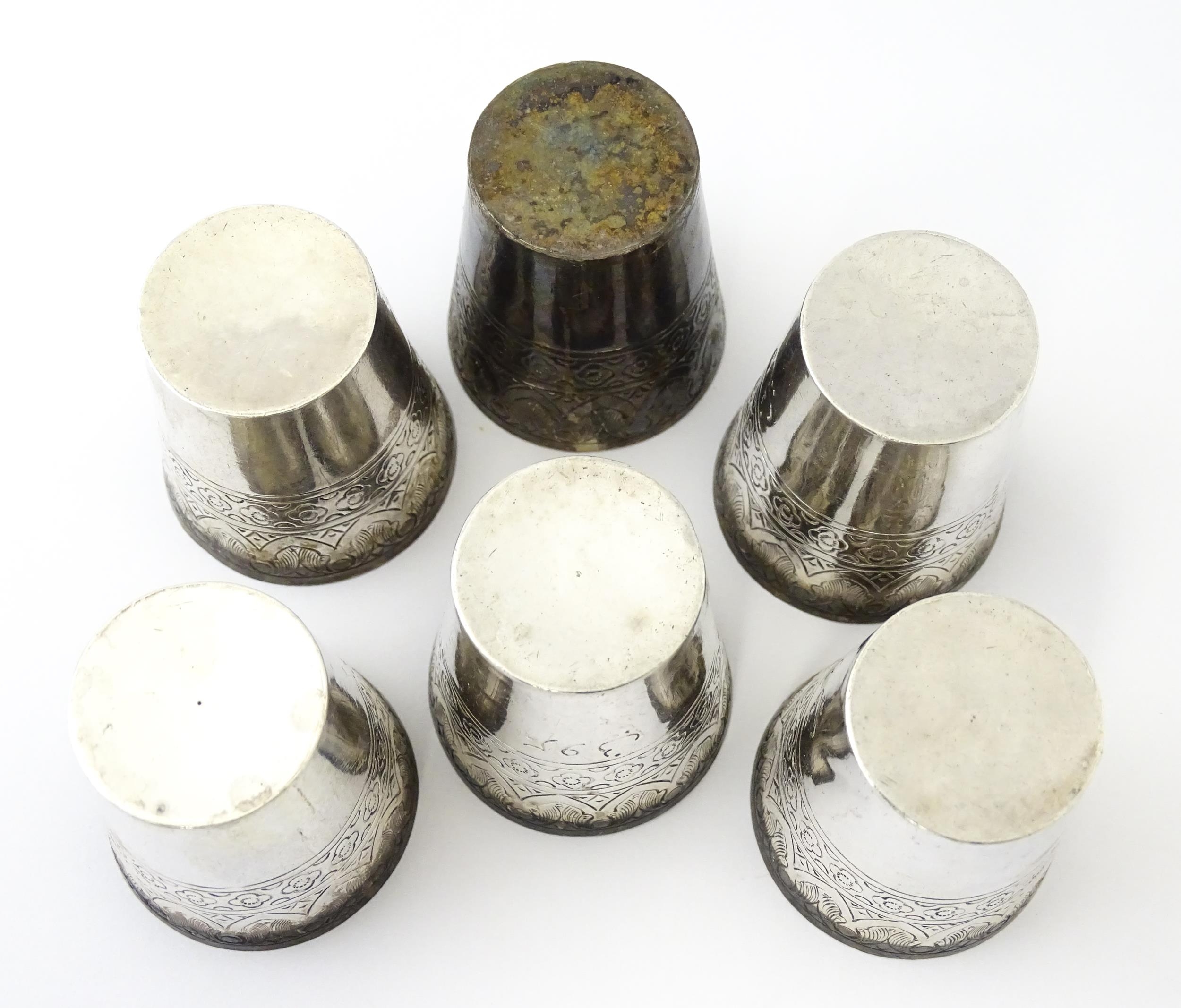 A set of six white metal tot cups with engraved decoration and Persian style script. Approx 1 1/2" high (6)