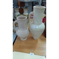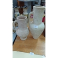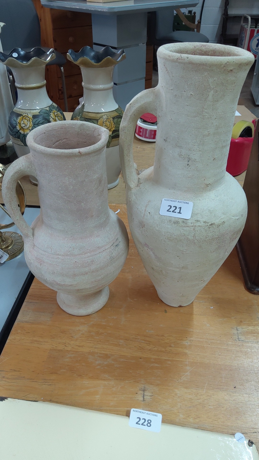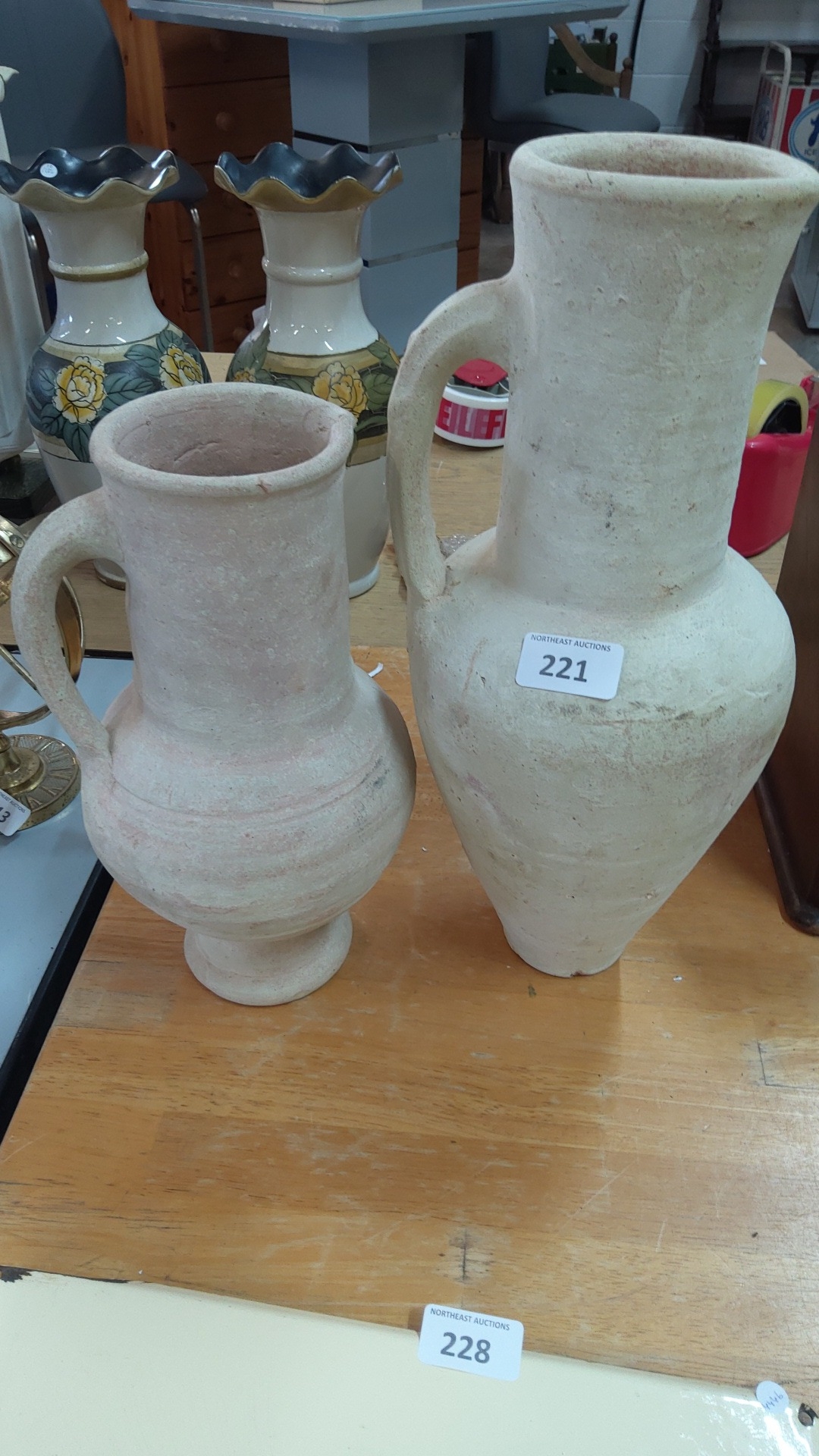 A pair of pottery ewers, each of baluster form with strap handle and broad mouth, the surfaces left unglazed; comprising one smaller pedestal example and one taller ovoid example.