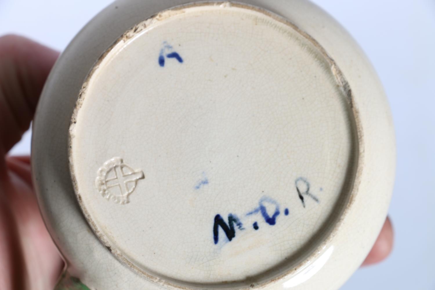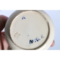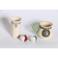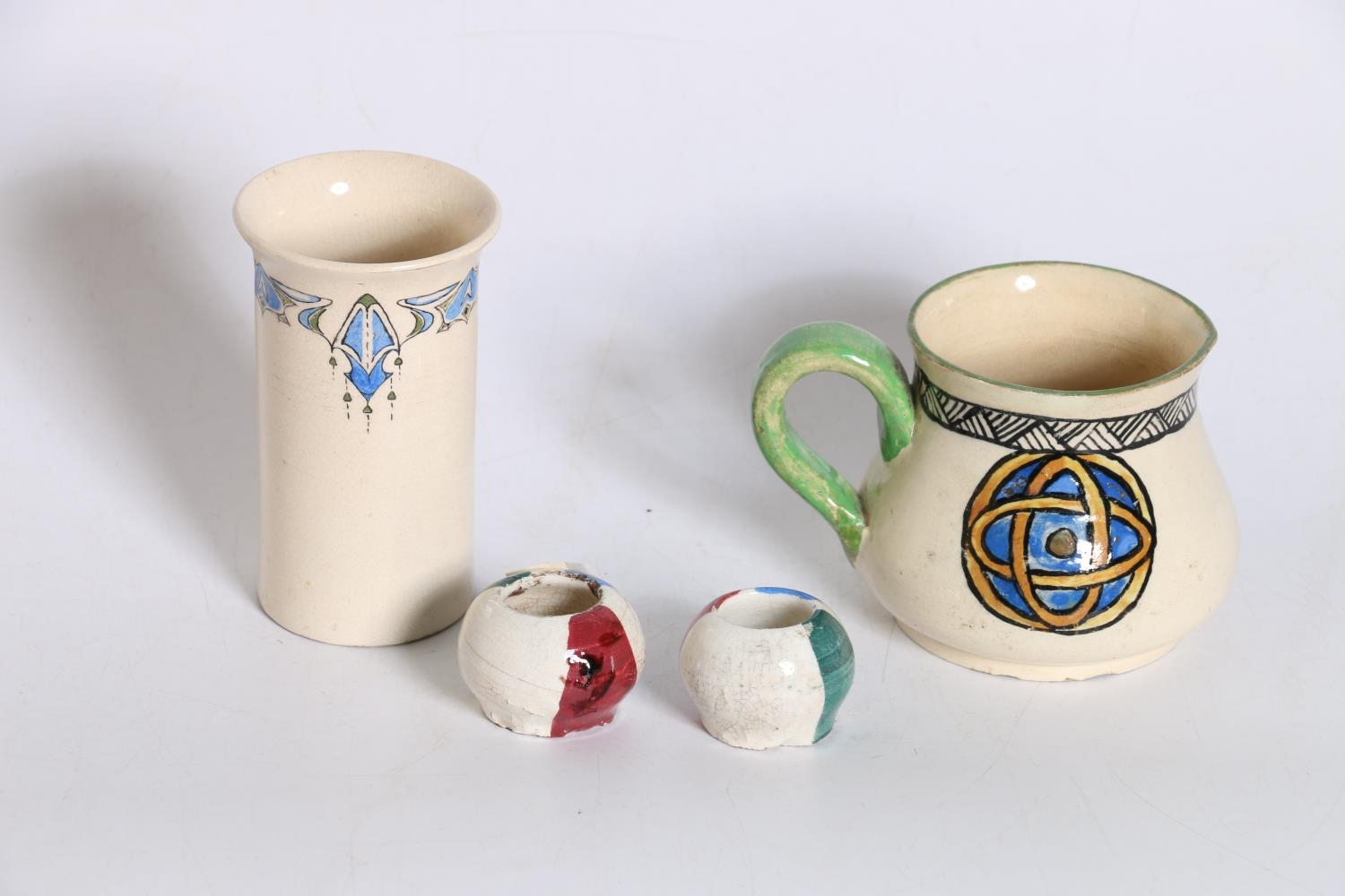 Holyrood Pottery jug with Celtic Knot decoration, signed to base with initials M.D.R., 8cm tall, a Holyrood Pottery column vase, 10cm tall and a pair of salts. (4)
