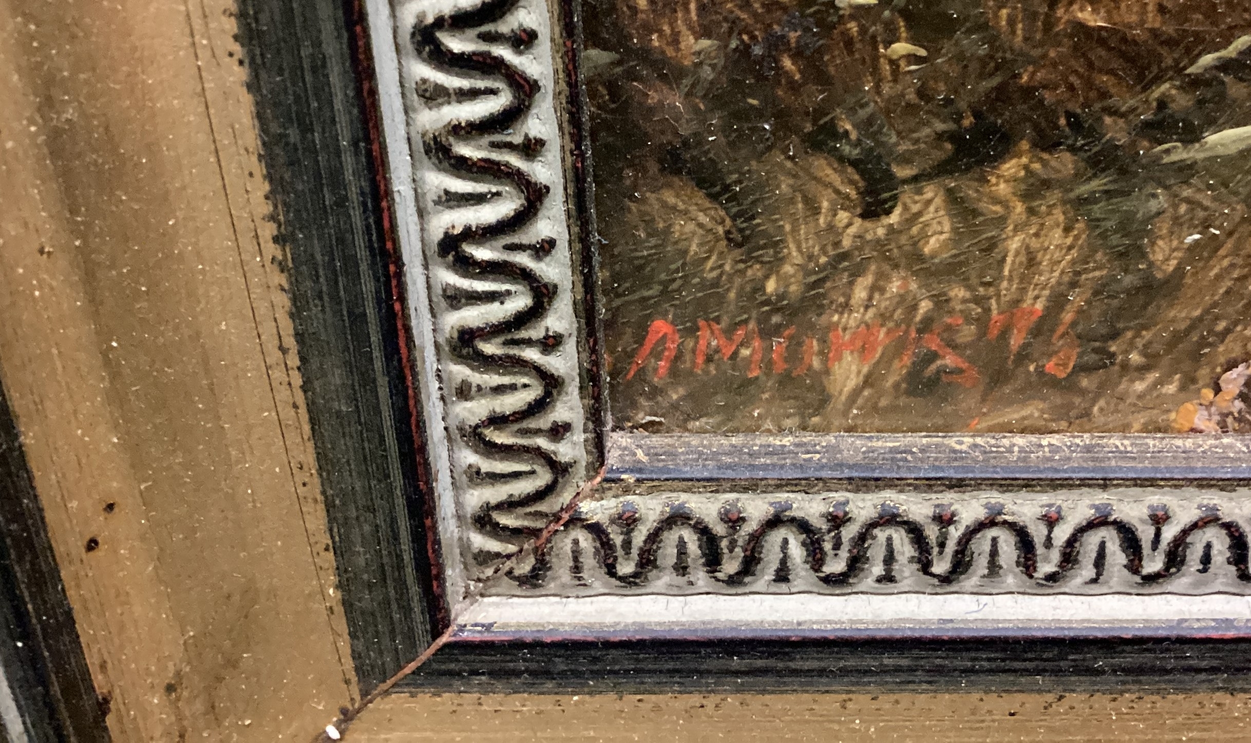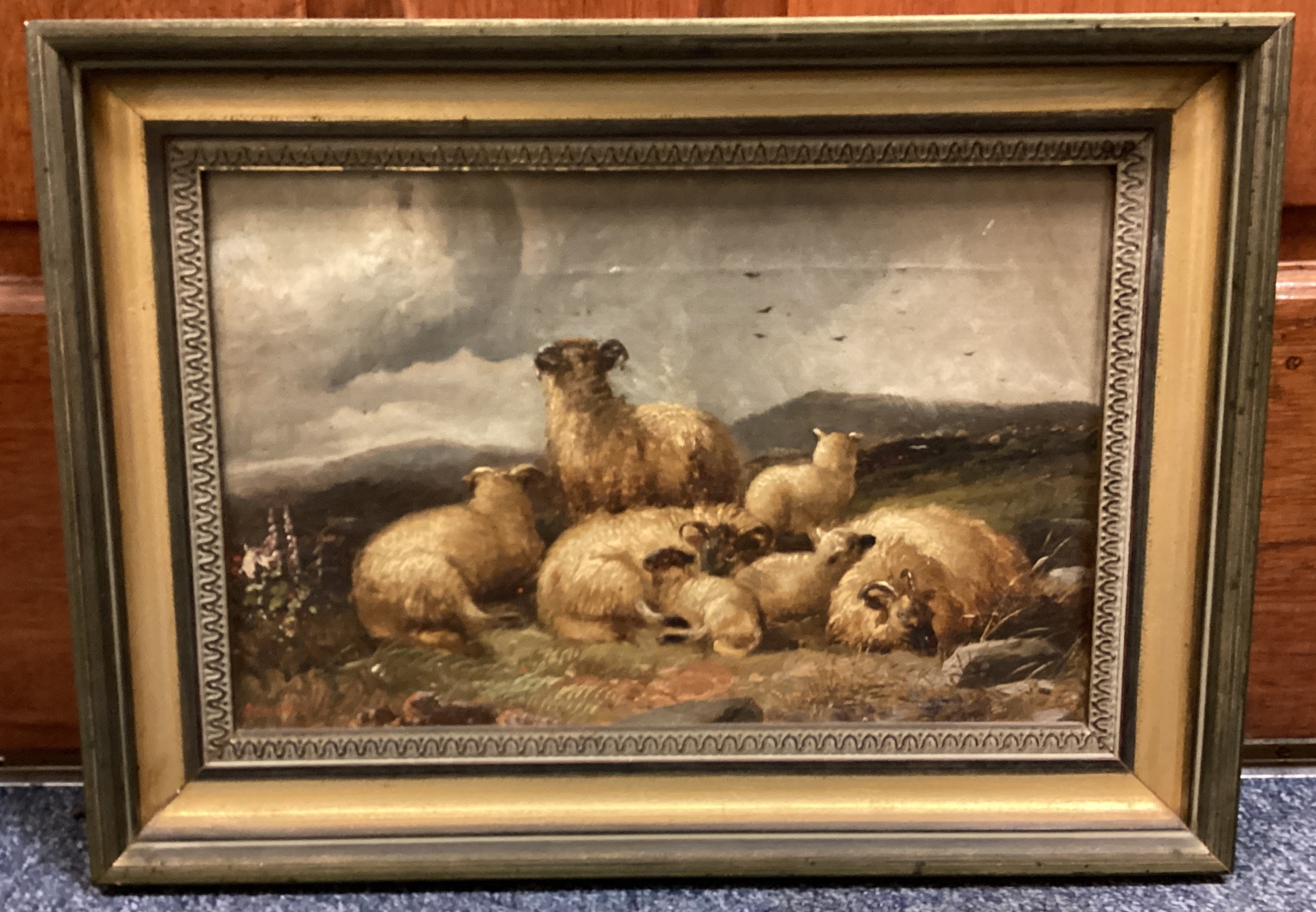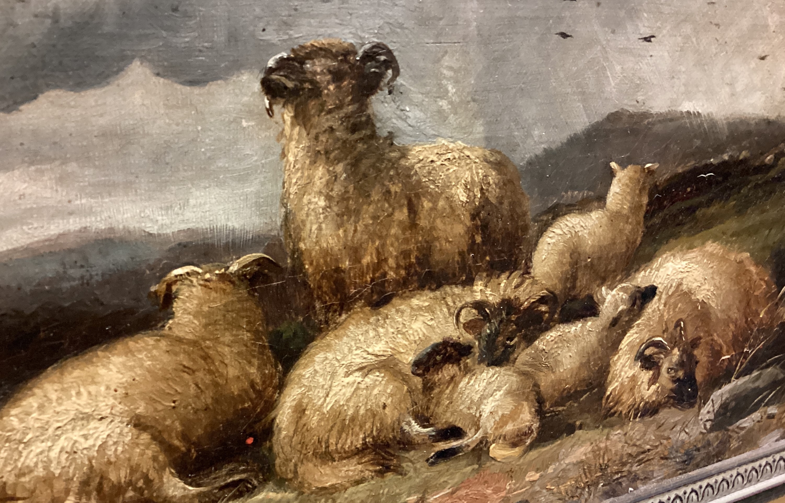 ALFRED MORRIS: (British, fl. 1853 - 1873): A framed oil on canvas depicting sheep in a Highland landscape. Signed to bottom left. Approx. 29 cm x 19 cm (ss). Est. £200 - £300.
