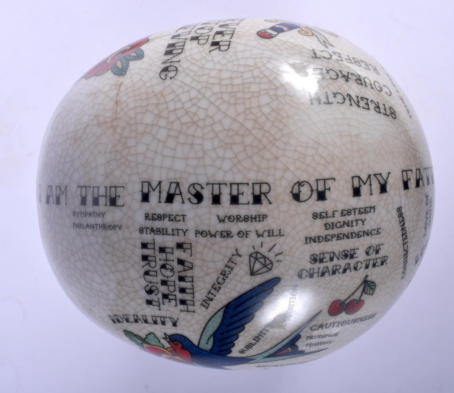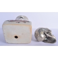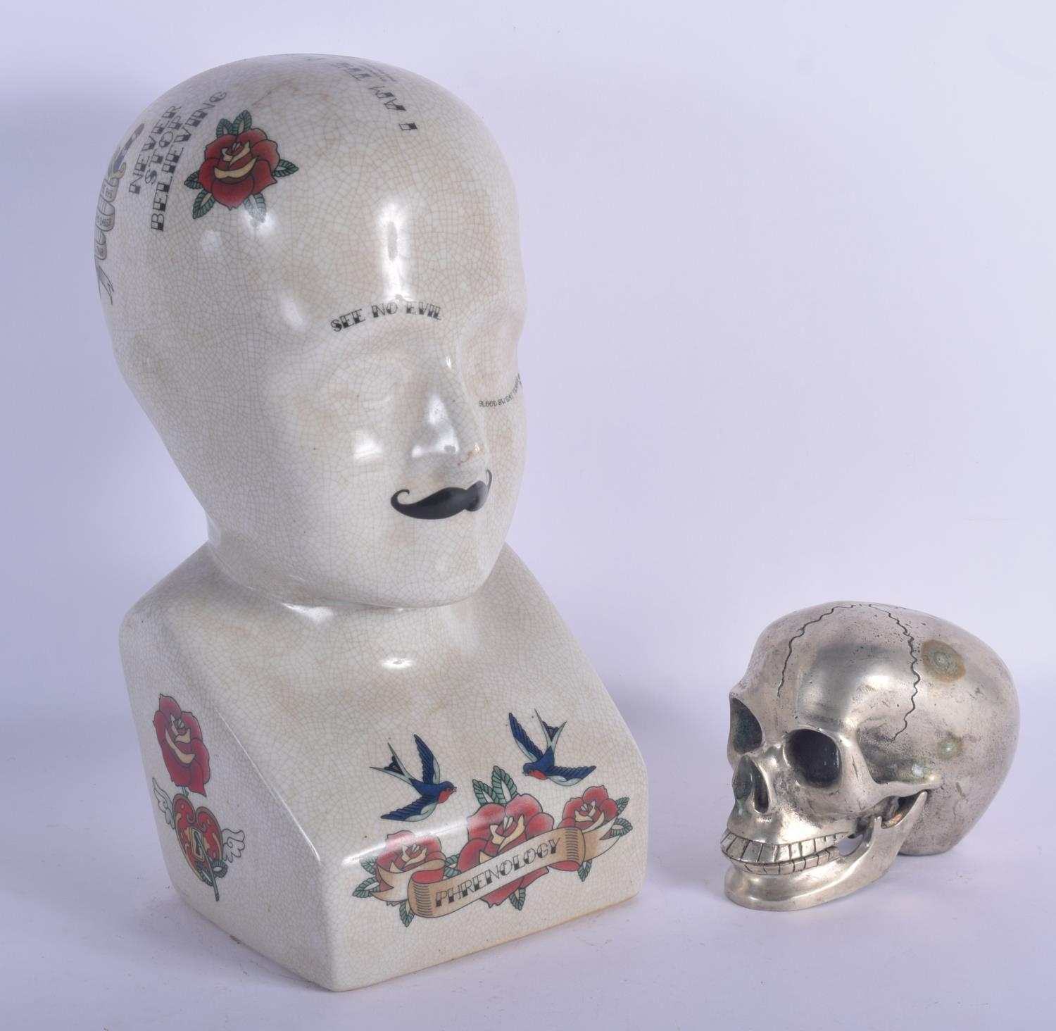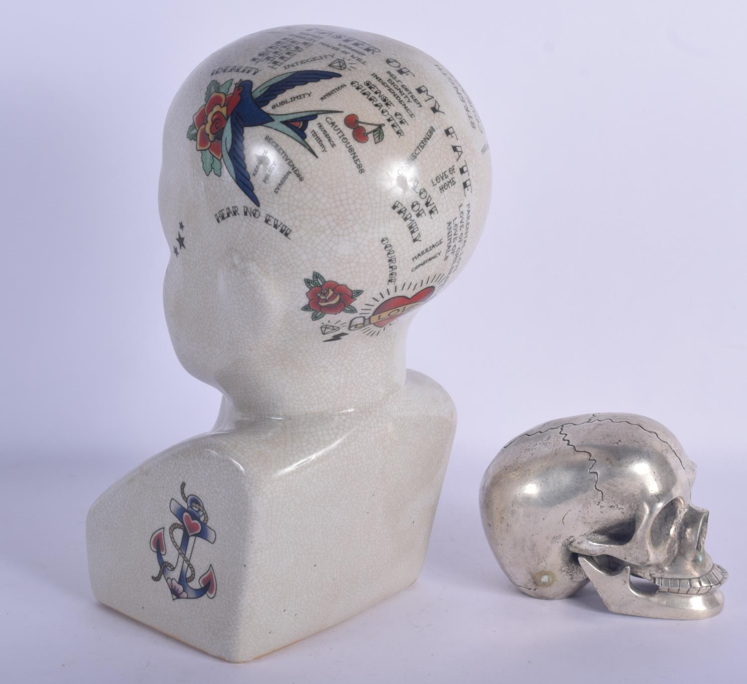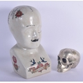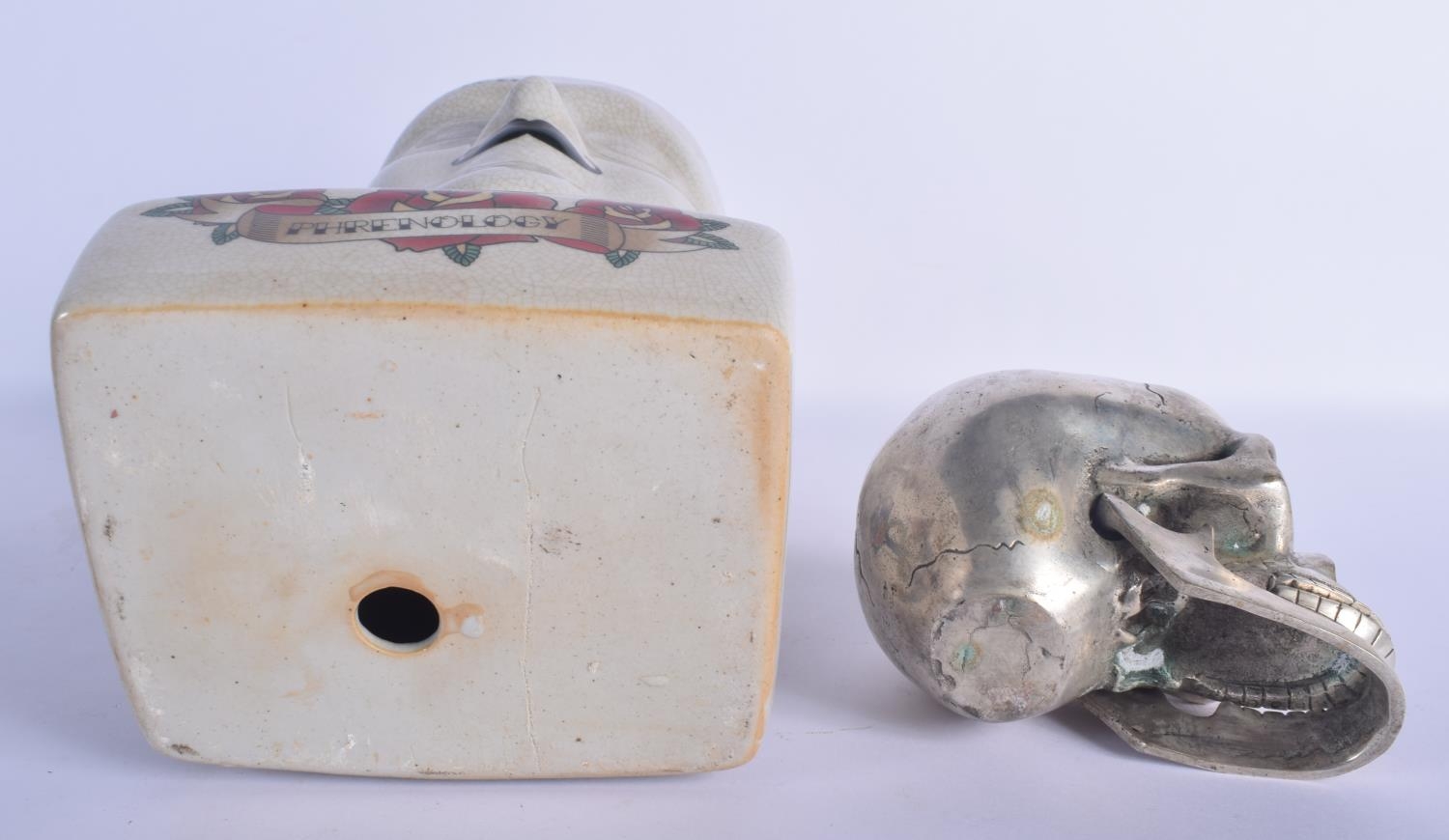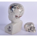 A CONTEMPORARY POTTERY PHRENOLOGY HEAD together with a silvered bronze model of a skull. Largest 30 cm x 11 cm. (2)