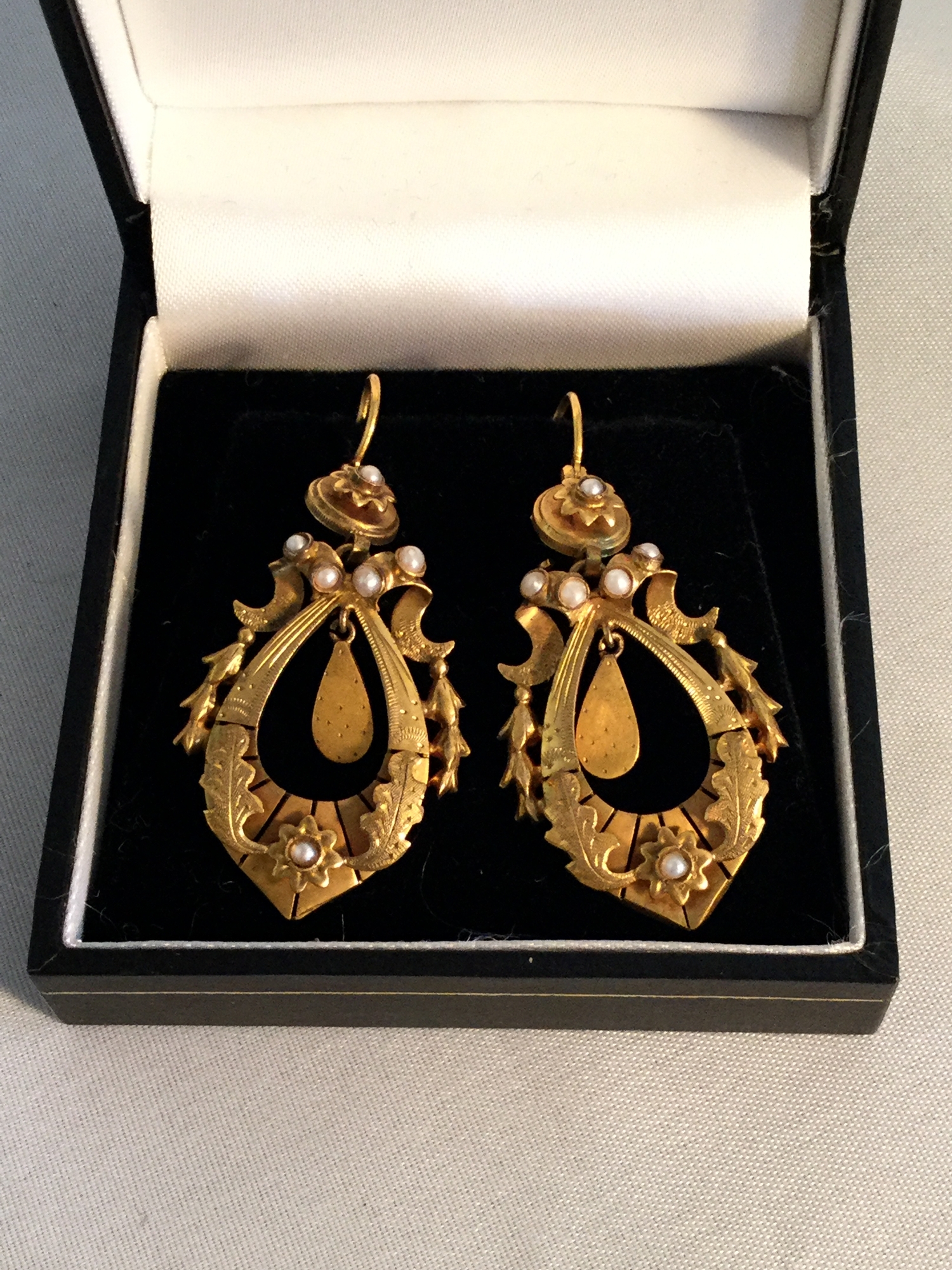 each circular boss set with a pearl suspending an openwork frame with foliate decoration and set with similar pearls -