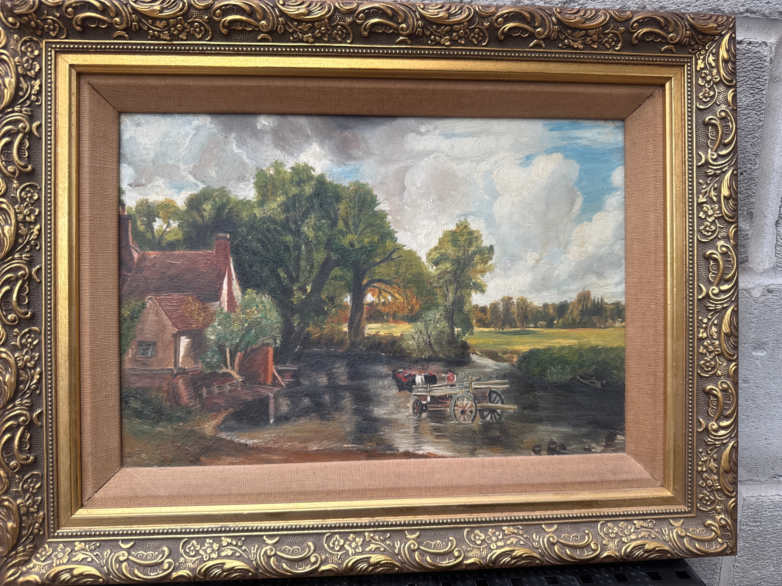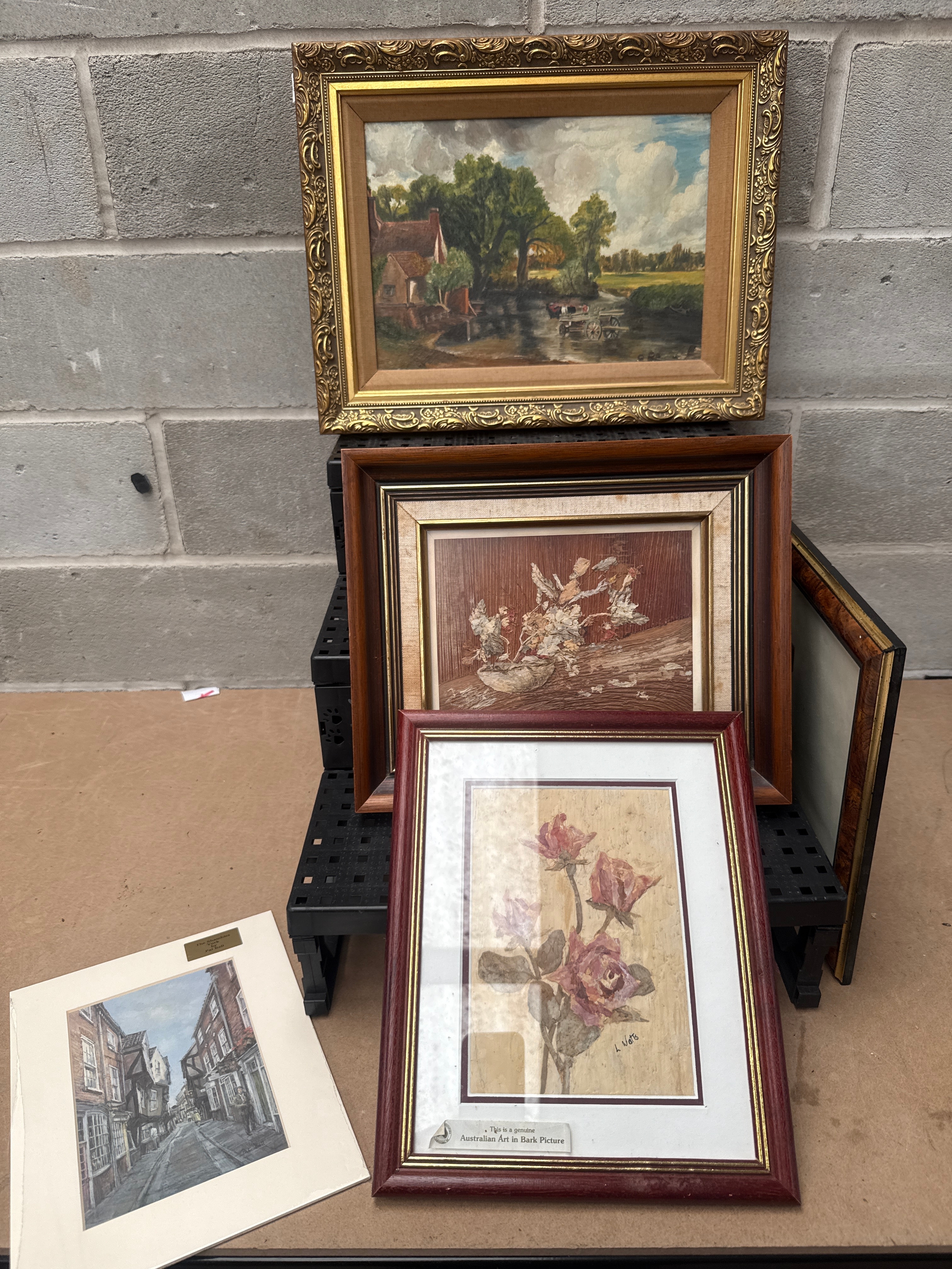 2 Framed Australian Pictures On Bark, Small Oil Copy Of “Hay Wain” 15 X 12” Etc