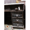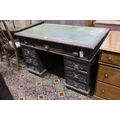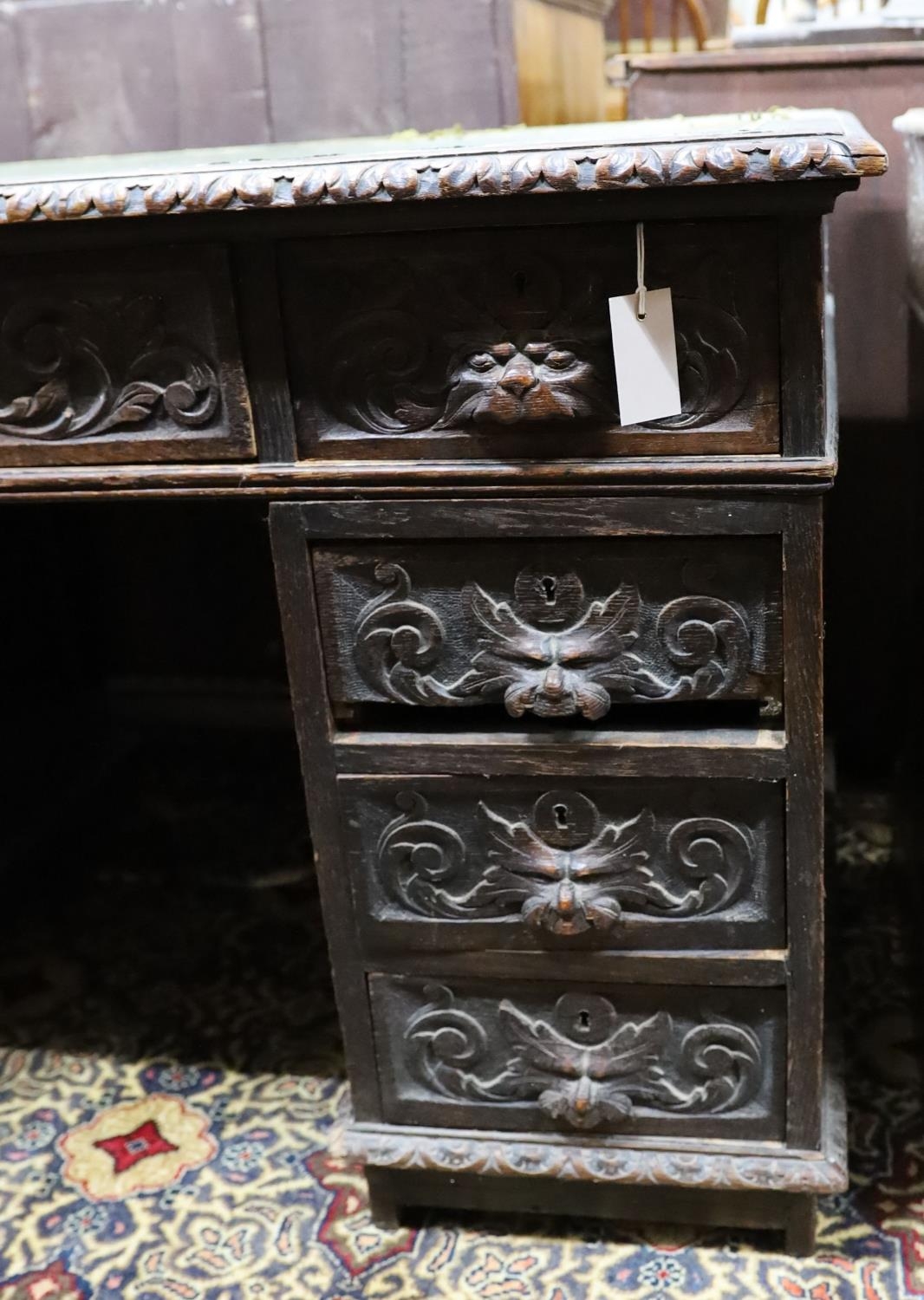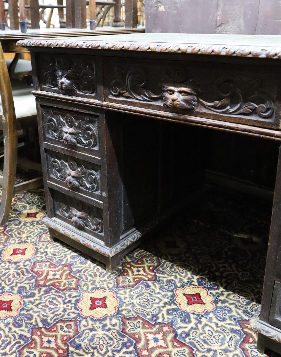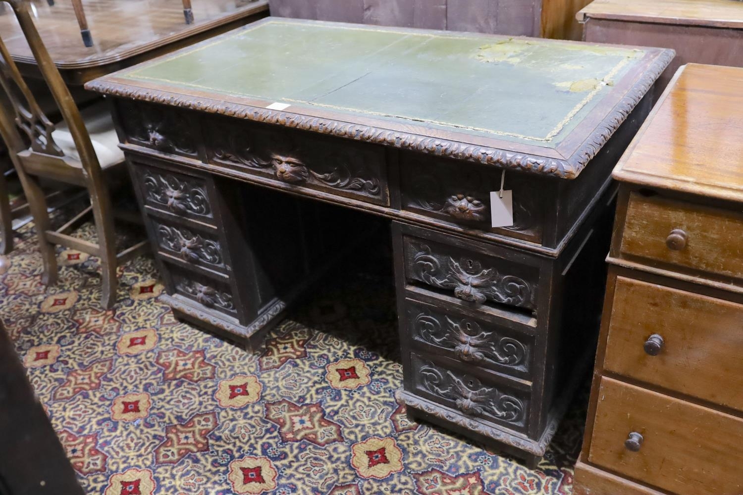 A late Victorian carved oak pedestal desk, length 121cm, depth 70cm, height 75cm