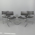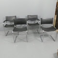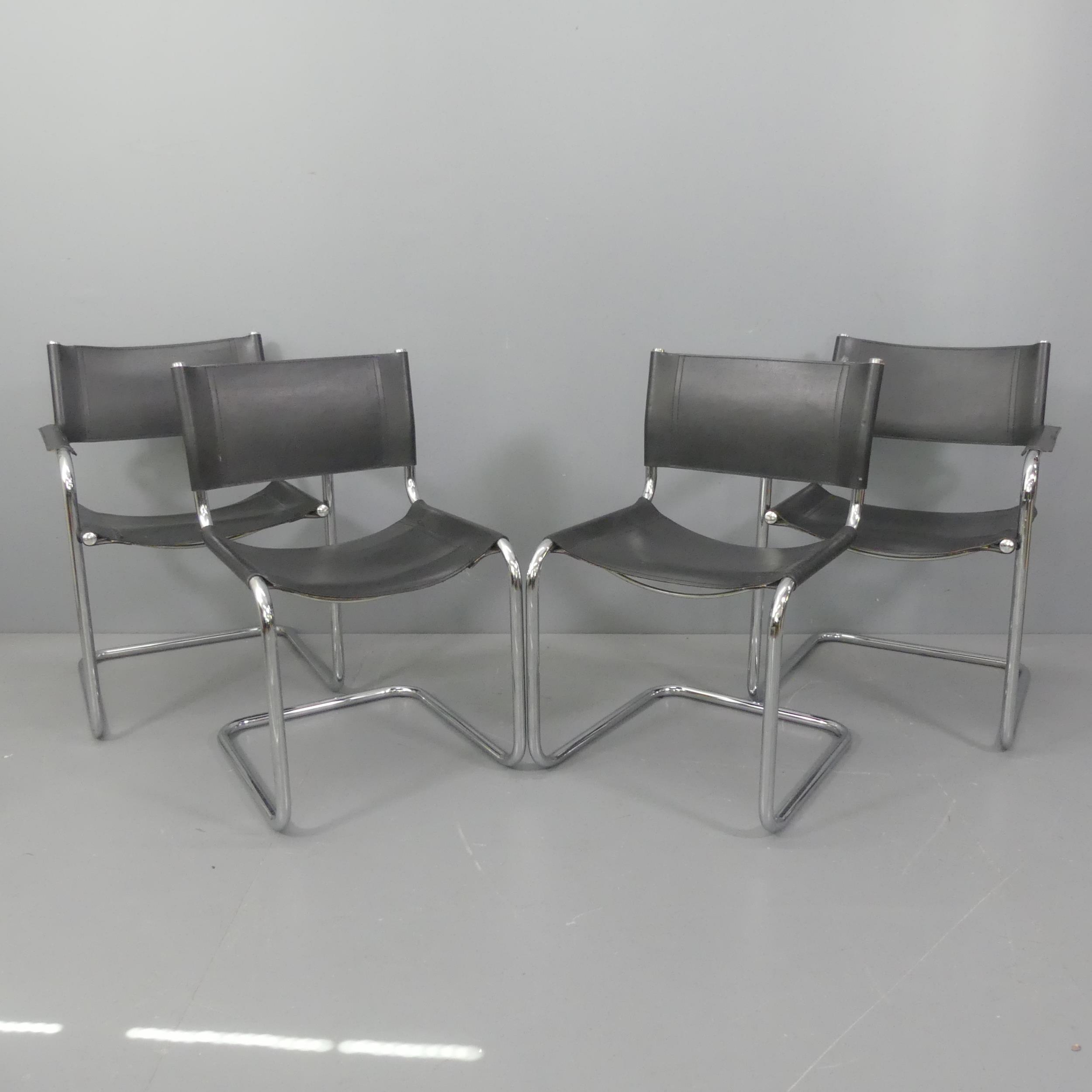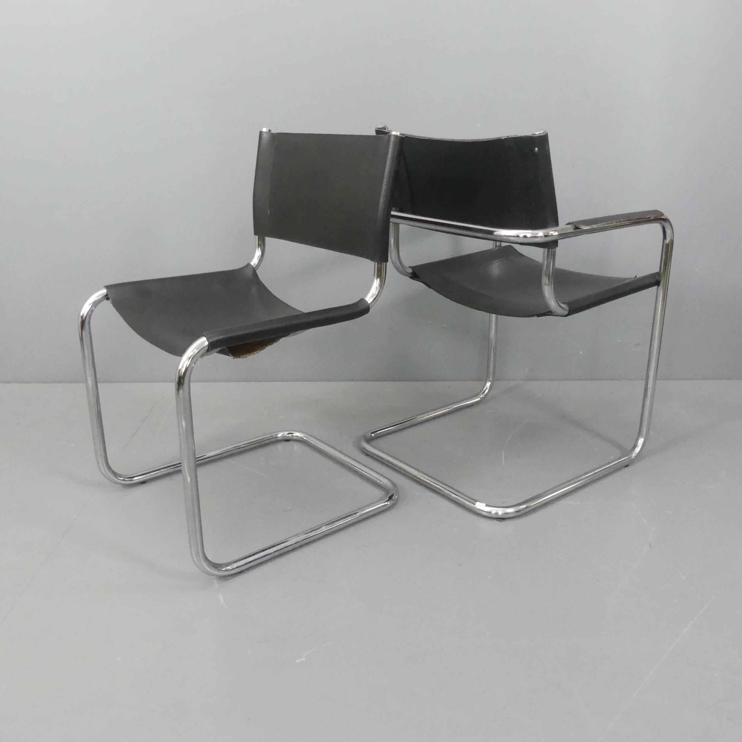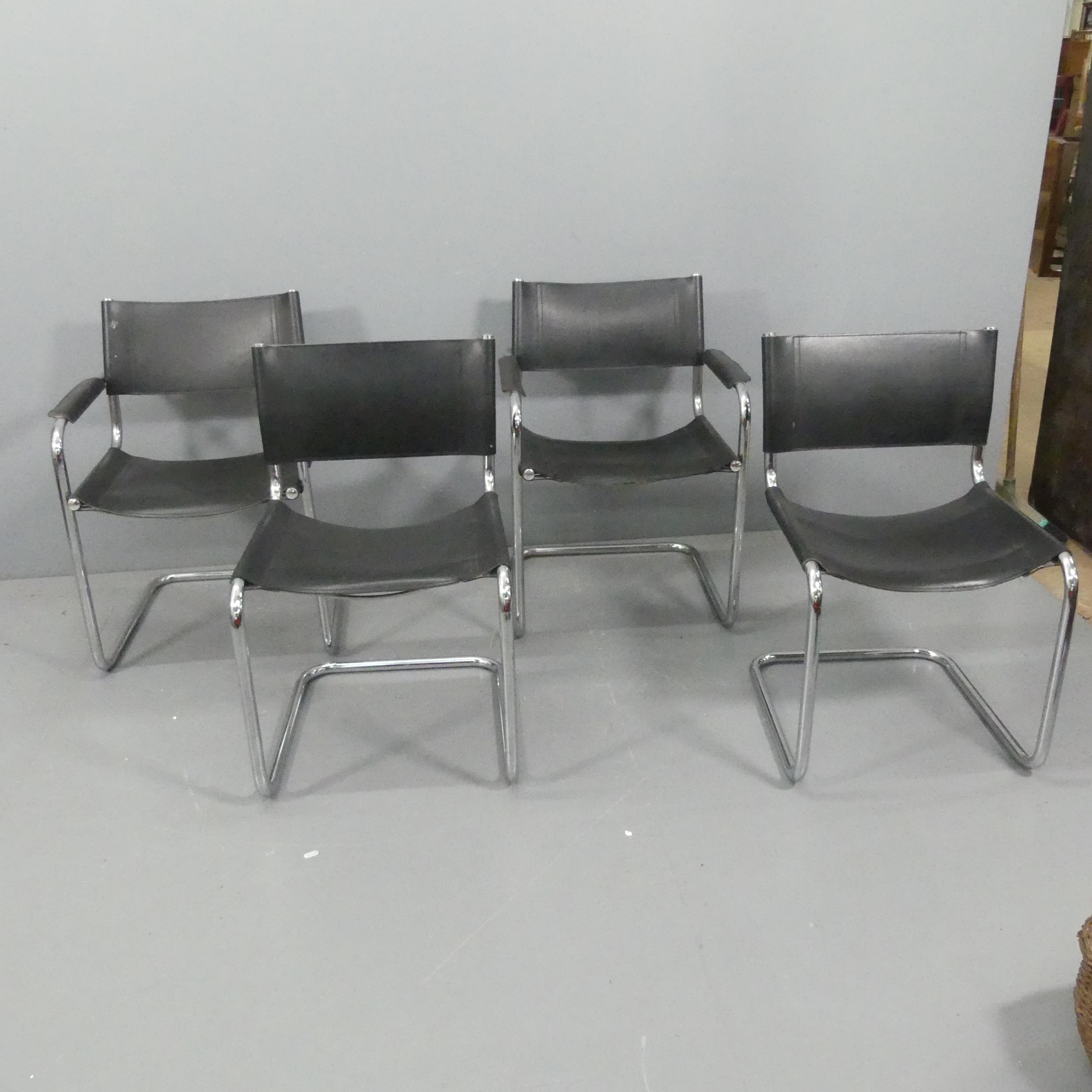 A set of four Mart Stam Bauhaus style cantilever chairs in tubular chrome steel and leather, comprising 2 with arms and 2 without arms