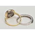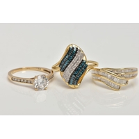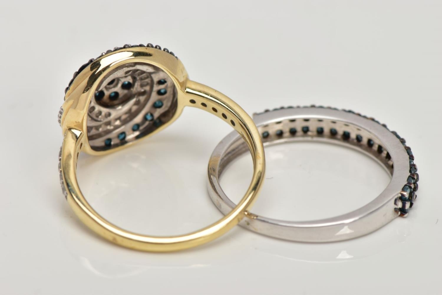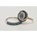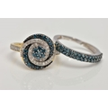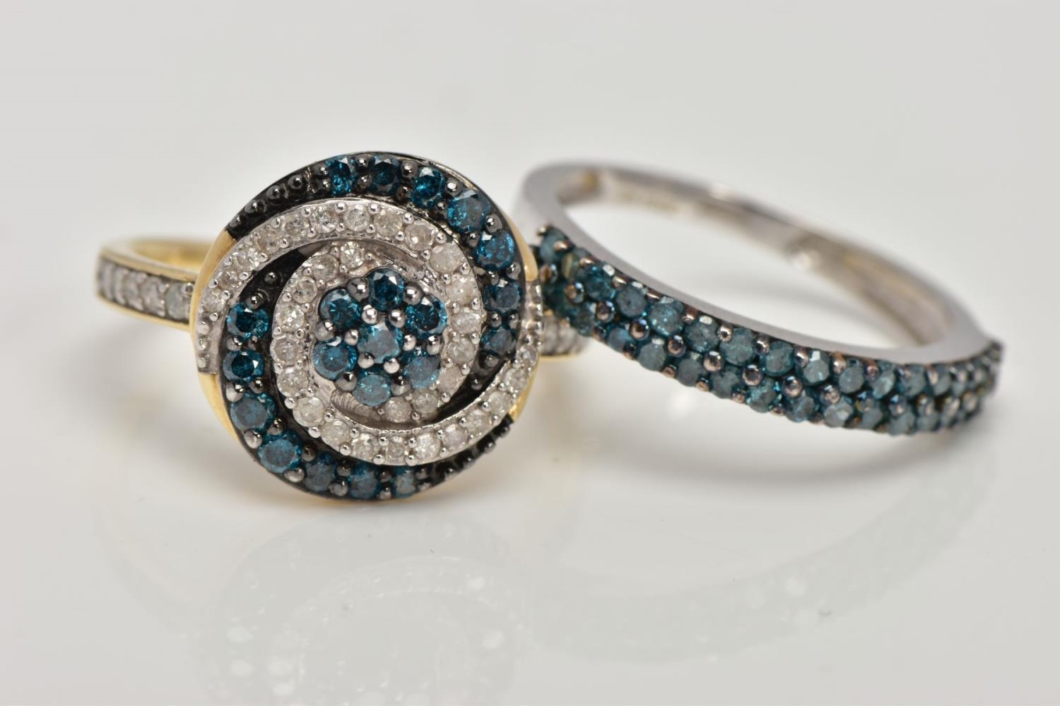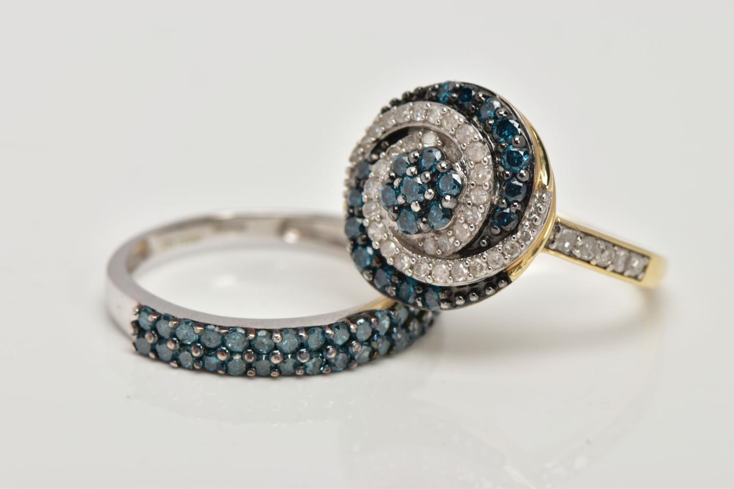 TWO 9CT GOLD DIAMOND RINGS, the first a brilliant cut treated blue diamond and single cut diamond cluster ring, with single cut diamonds to the shoulders, total estimated diamond weight 0.75ct, the second designed as two rows of treated blue single cut diamonds, total estimated diamond weight 0.34ct, both with 9ct hallmarks, both ring size N, approximate gross weight 5 grams (condition report: very good condition, diamonds are poor quality)
