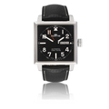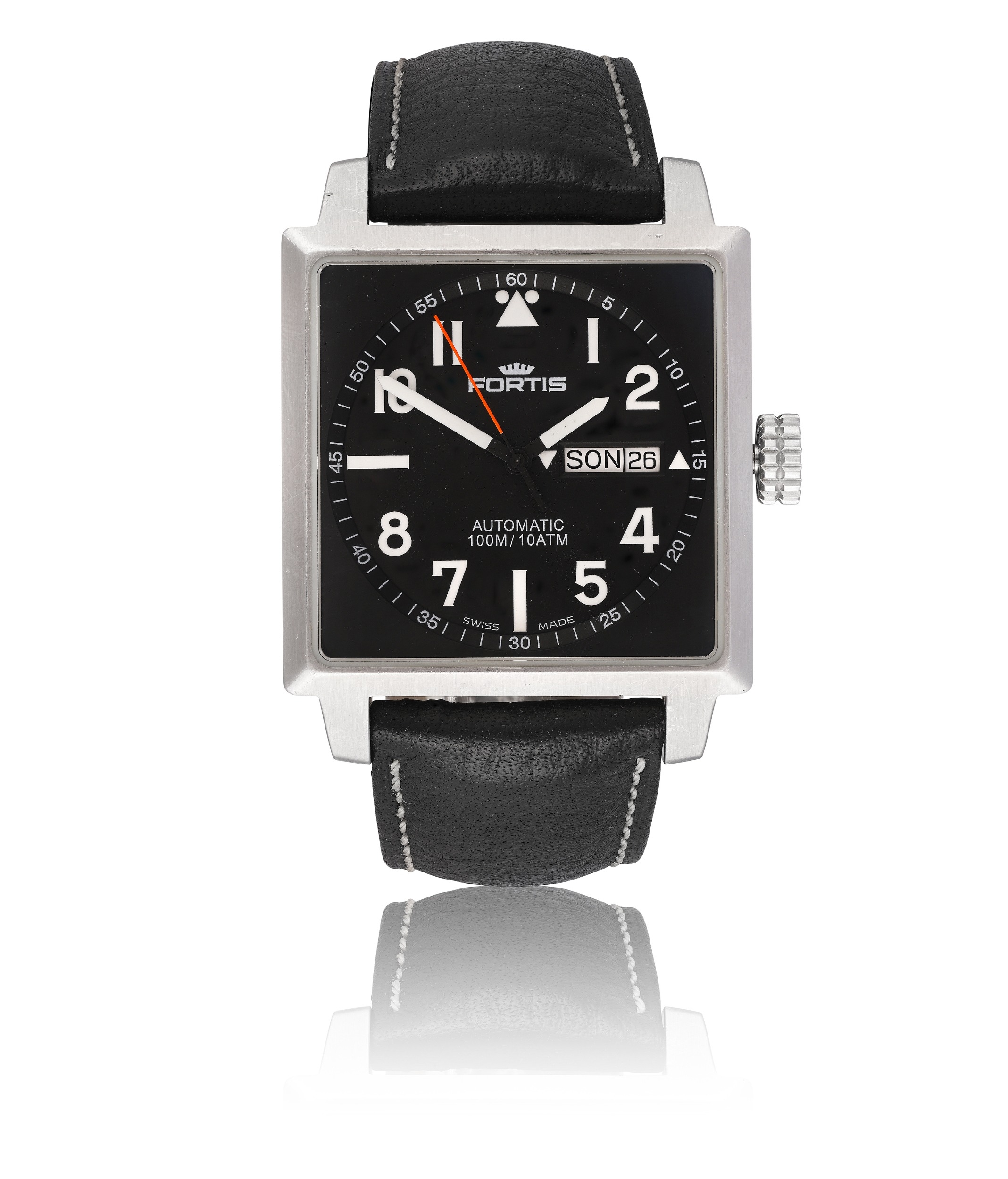 FORTIS REF 653.10.158, SQUARE WRISTWATCH, STAINLESS STEEL A stainless steel automatic wristwatch with day and date. Year: Circa 2000s Dial: Black dial with applied baton indexes, outer minute track, day and date apertures at 3 o'clock, luminous hands Movement: Automatic, ETA calibre 2836-2, signed Fortis Case: Stainless steel square case, snap-on caseback, No 2137 Size: 38 x 38 mm approx. Gross Weight: 115 g approx. Bracelet/Strap: Later black leather strap with Fortis stainless steel folding clasp Accessories: Box and papers