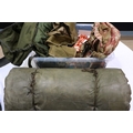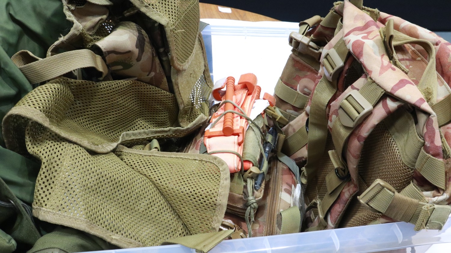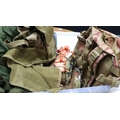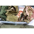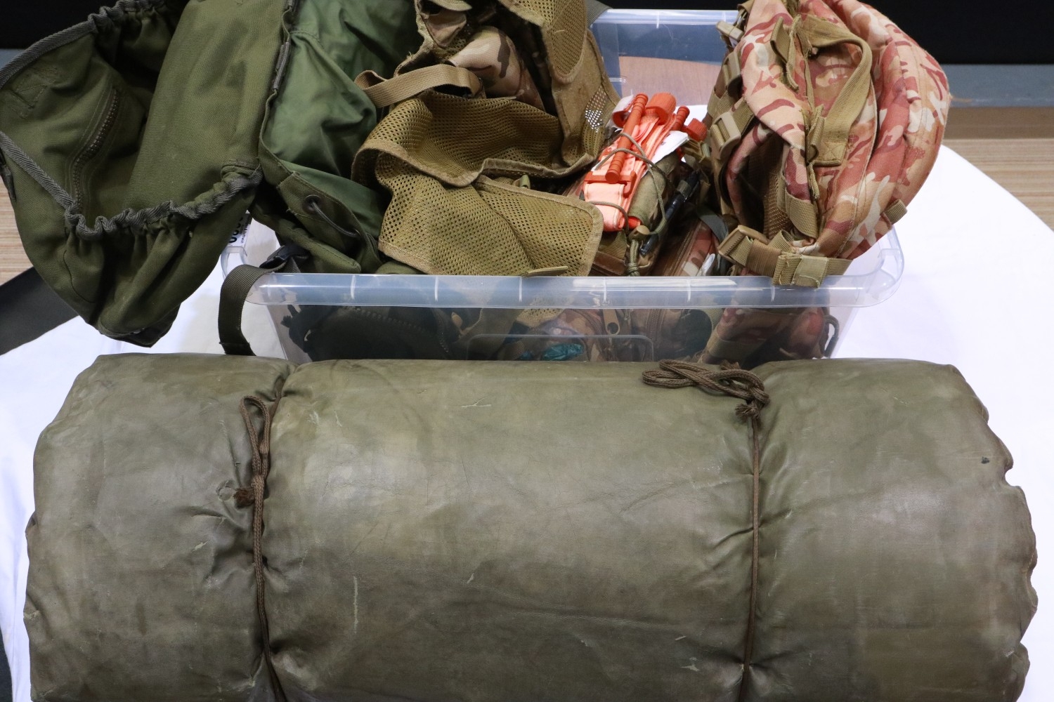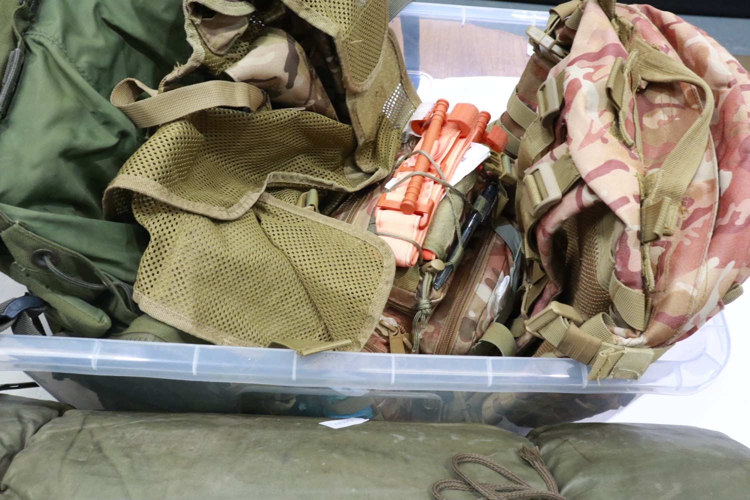 Shelf of mixed military style survival equipment to include roll-up field bed, rucksacks, survival kit etc. Not available for in-house P&P