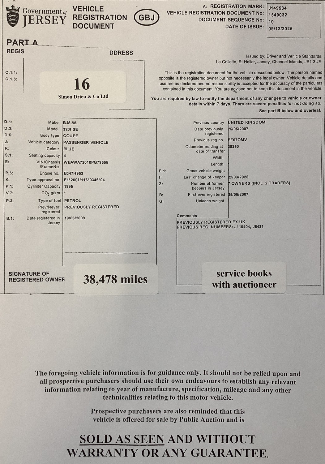 A 2007 BMW 320i SE 2.0 coupe J149534 (petrol/manual), odometer reading 38,478 miles