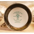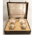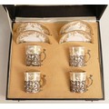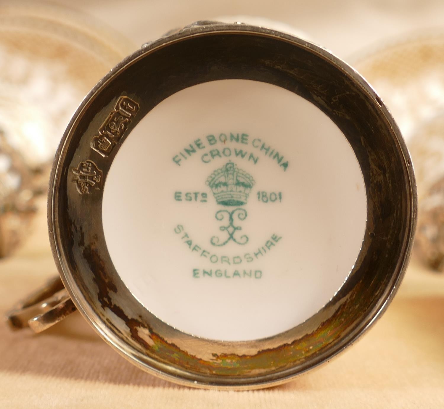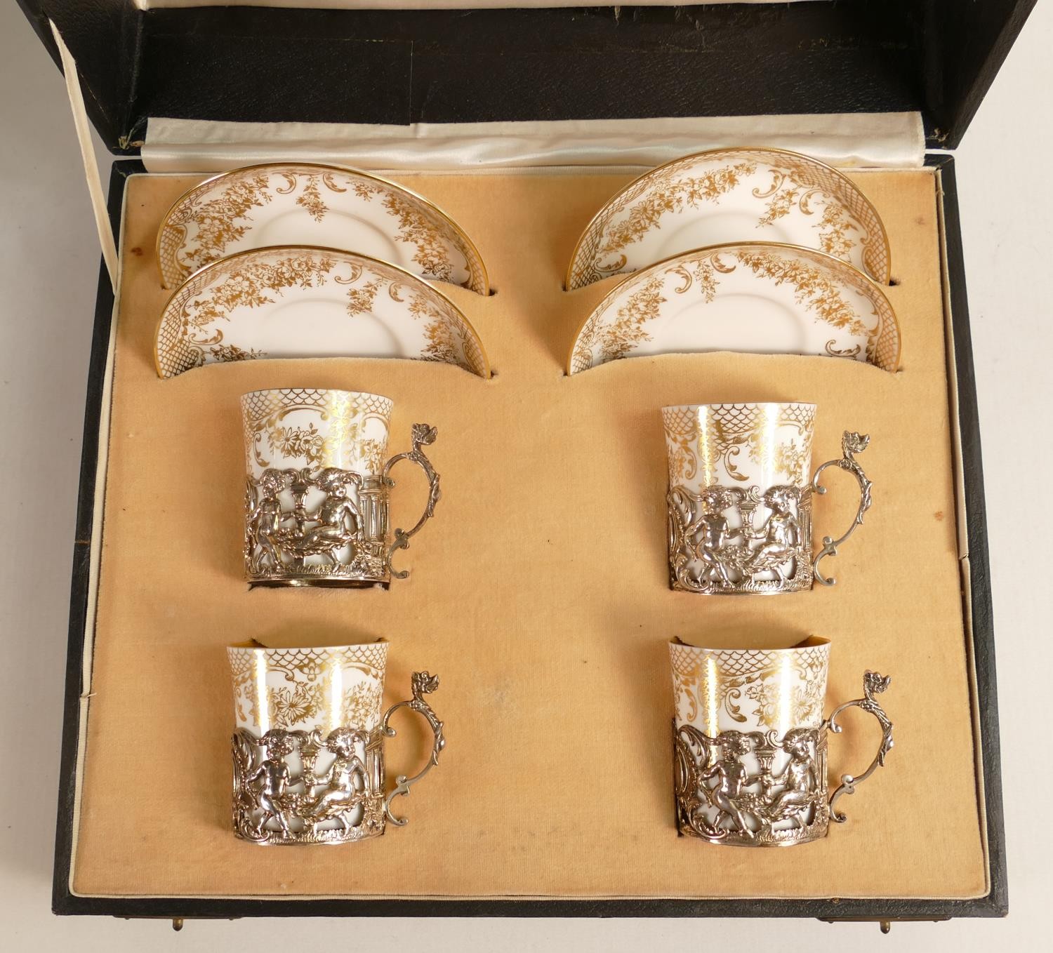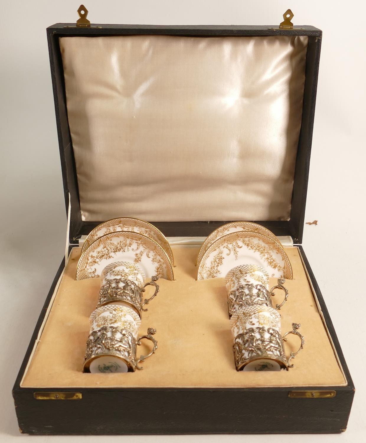 A Crown Staffordshire gilded chocolate cup and saucer set, with hallmarked ornate cupid silver handles, 104g in original case. (12)