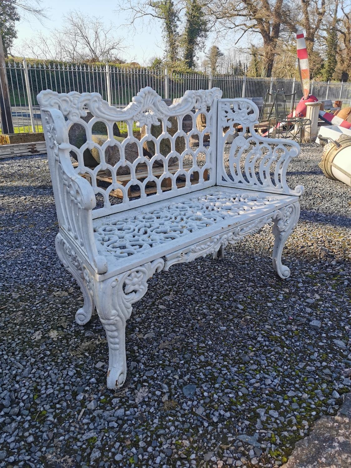 Decorative cast iron two seater garden bench {88 cm H x 107 cm W x 47 cm D}.