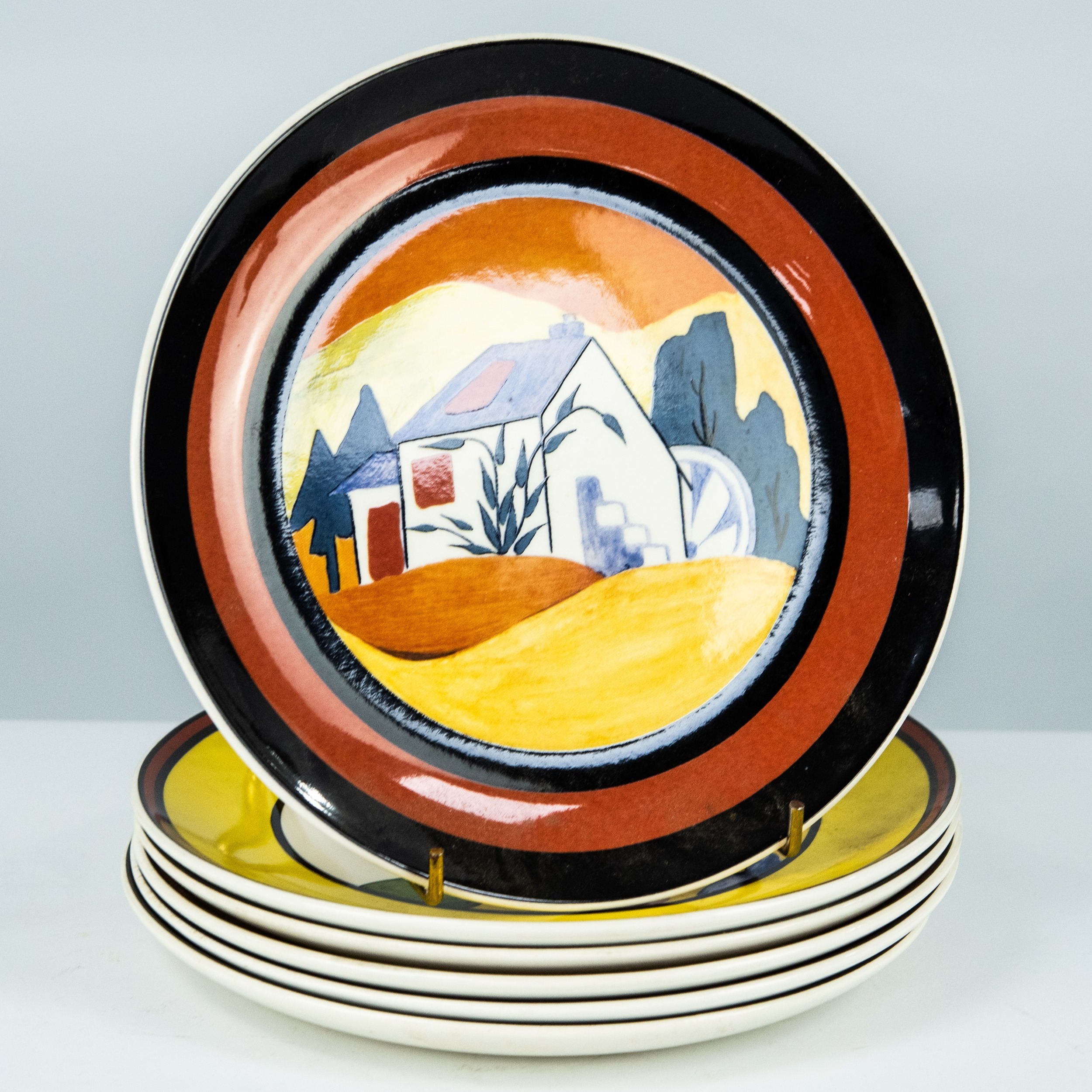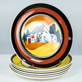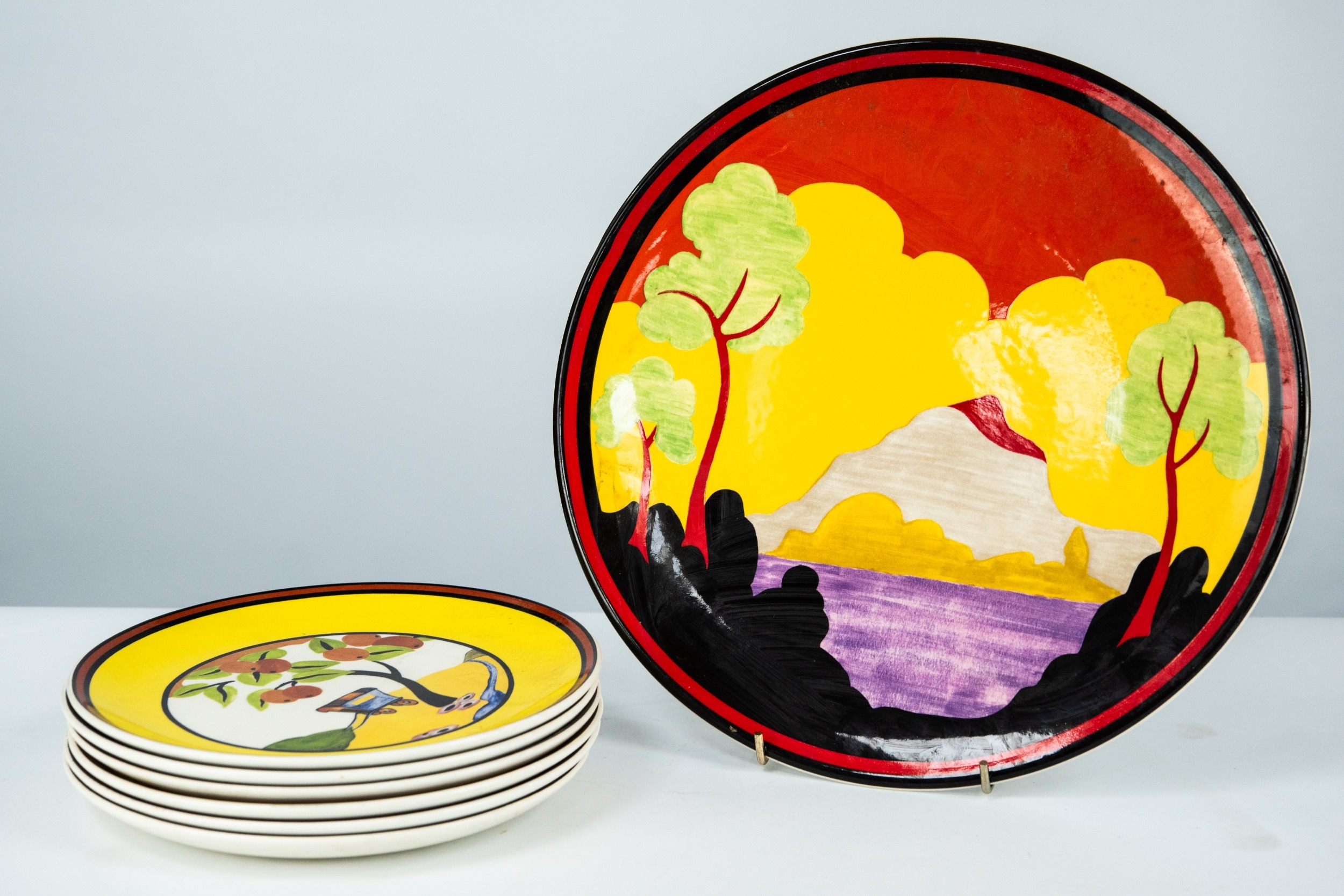 WEDGWOOD FOR THE BRADFORD EXCHANGE, MODERN LIMITED EDITION CLARICE CLIFF ETNA PATTERN POTTERY PLAQUE, 12” (30.5cm) diameter, together with a SIMILAR SET OF SIX ‘APPLIQUE’ PLATES: Palermo, Lugano, Caravan, Windmill, Avignon and Eden, 8” (20.3cm) diameter, printed marks, (7)