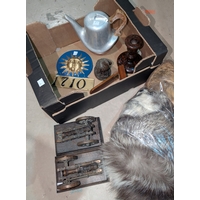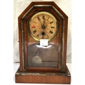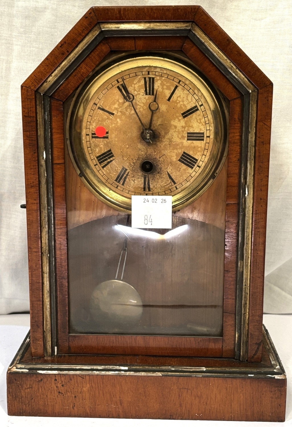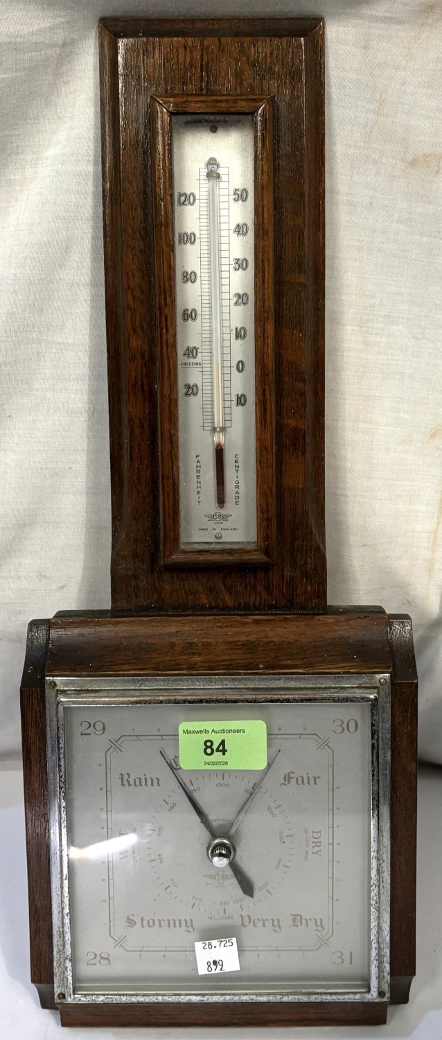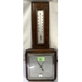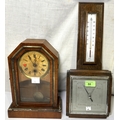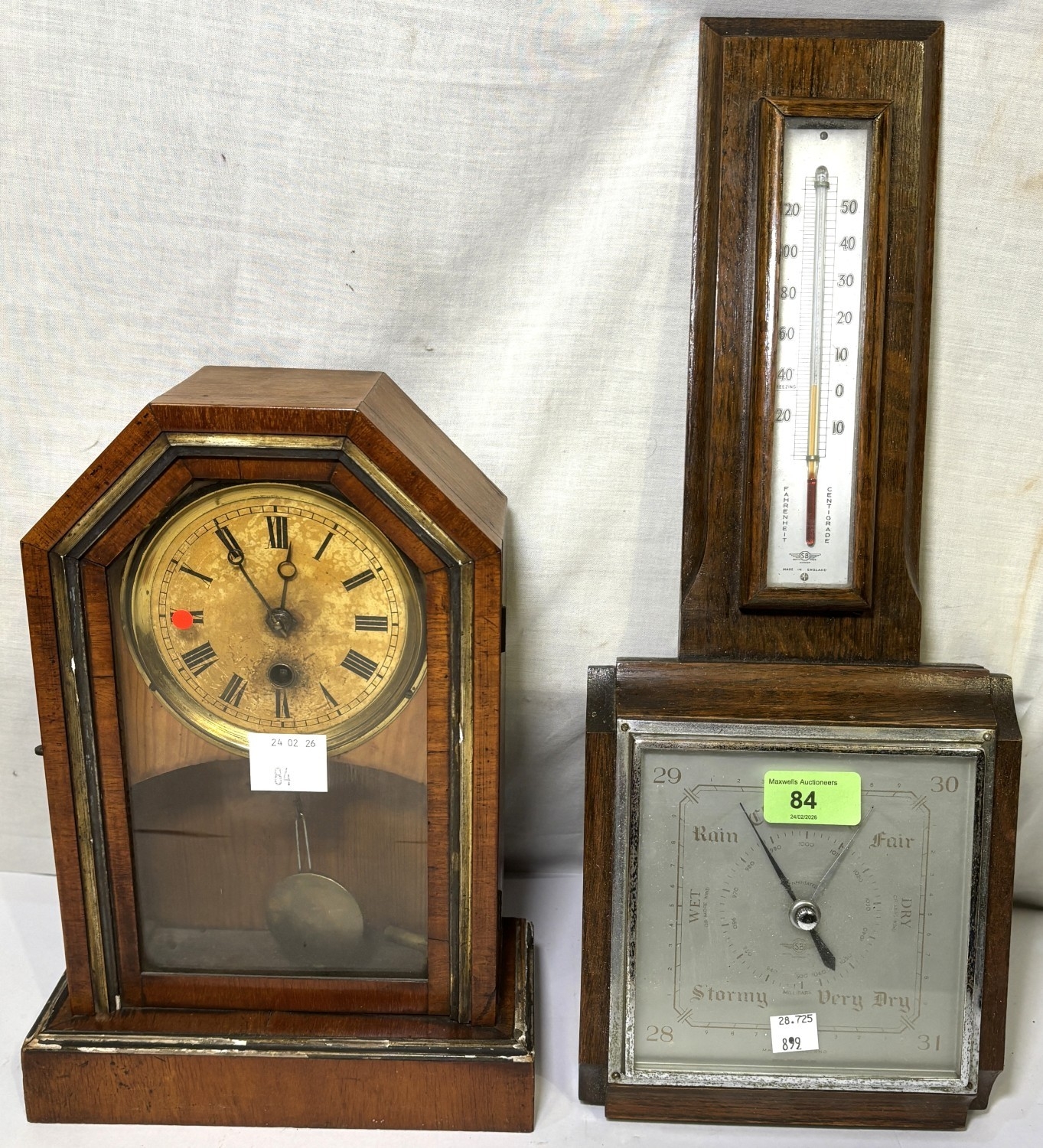 A 1930's oak wall hanging barometer with thermometer; a late 19th century stained wood mantel clock
