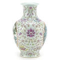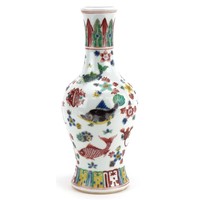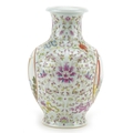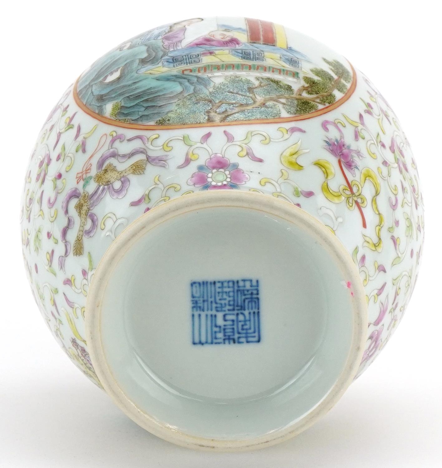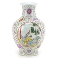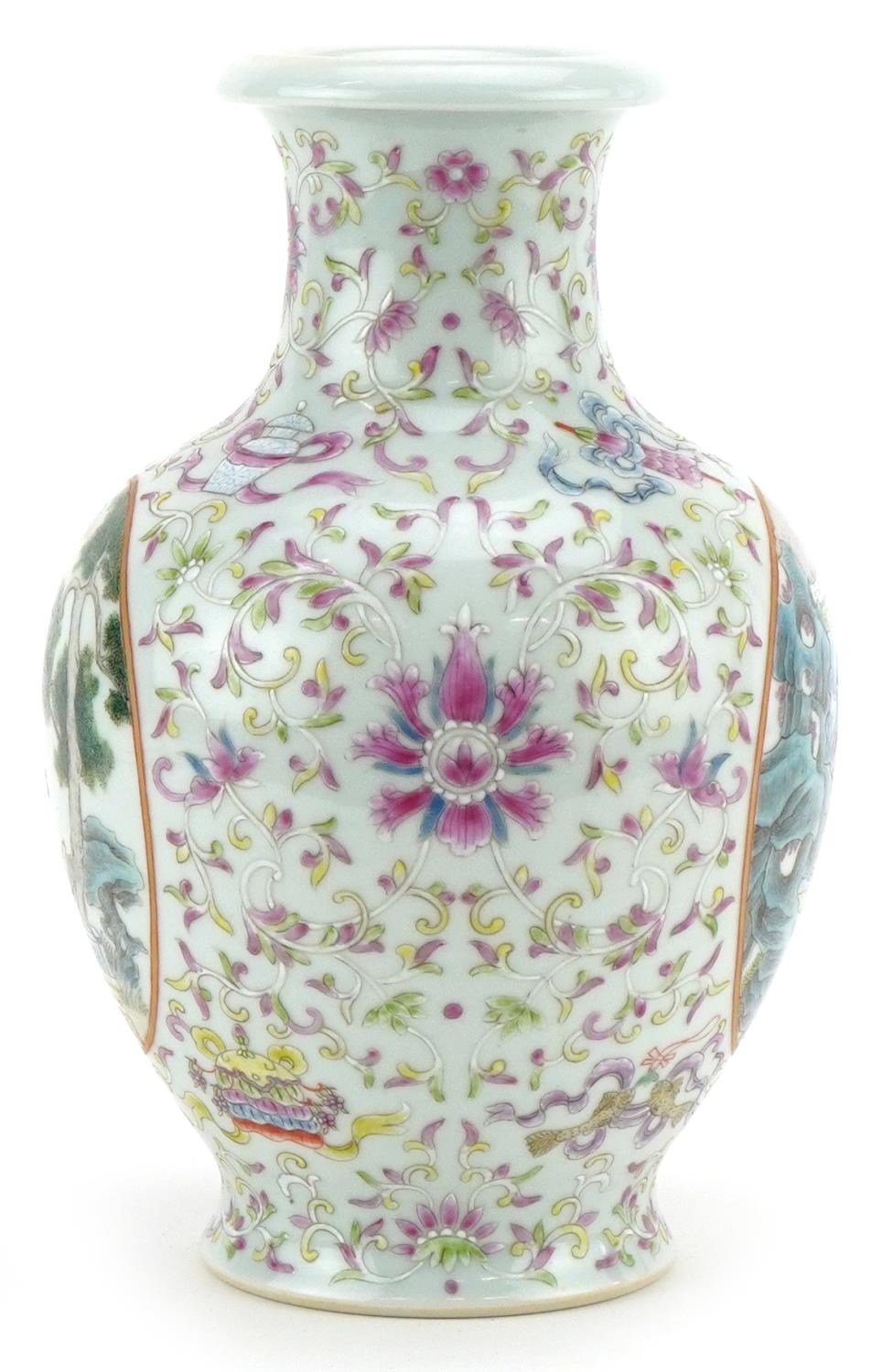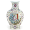A Chinese porcelain vase hand painted with panels of figures amongst foliage, character marks to the base, 20cm high.