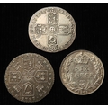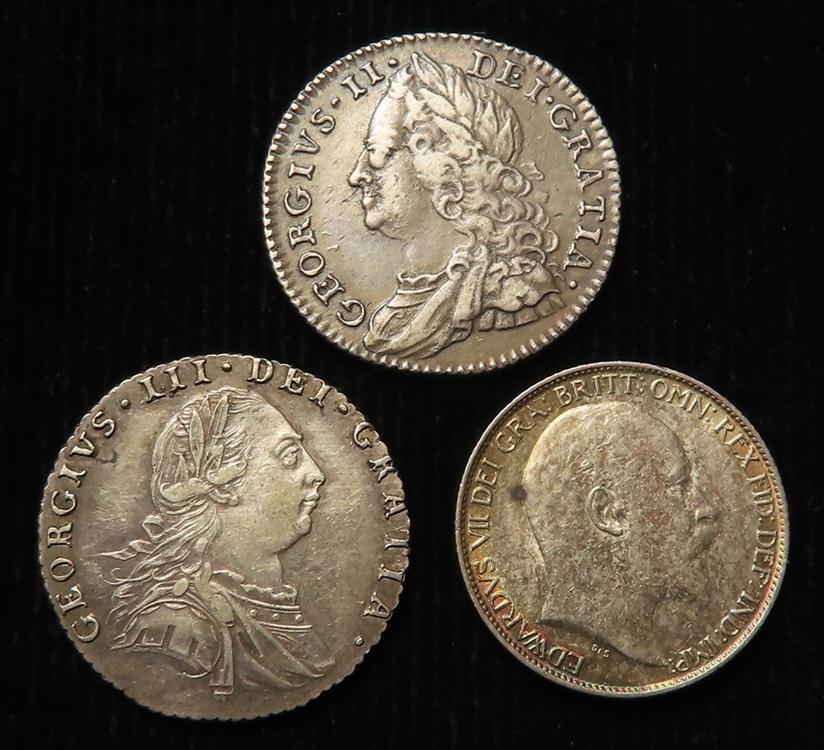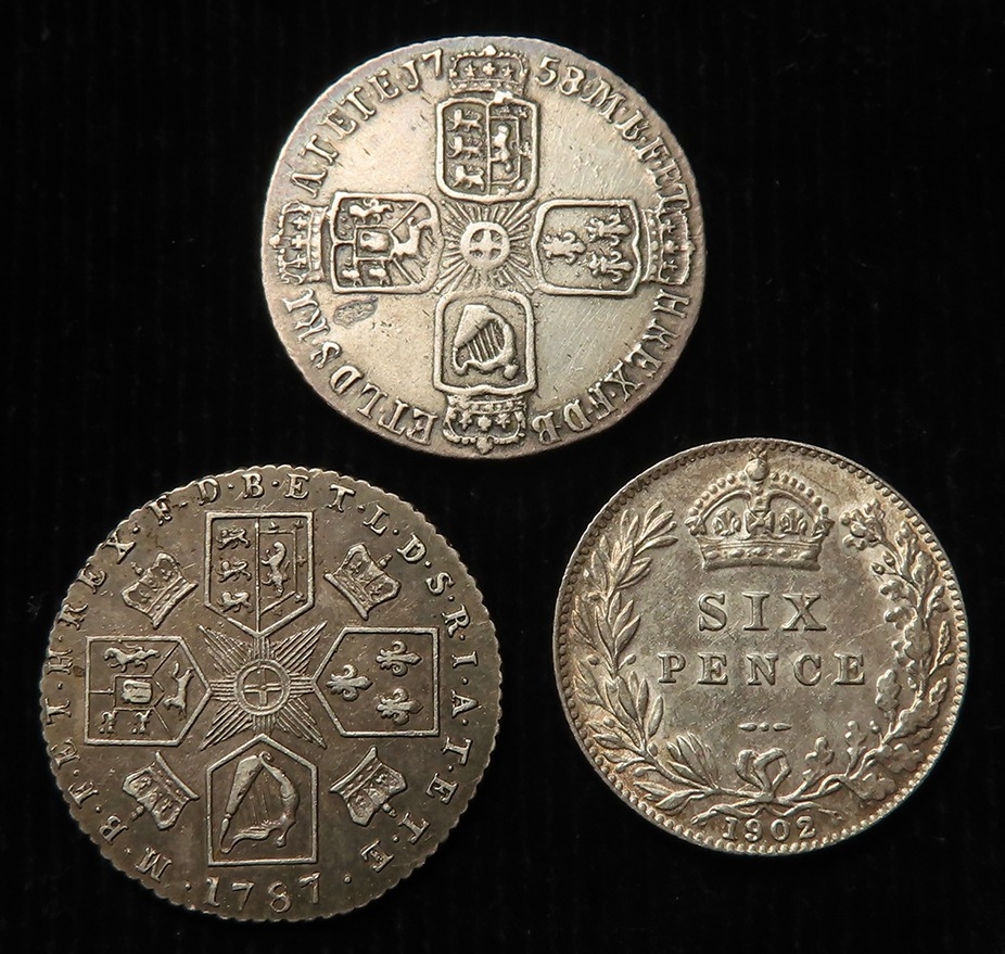 Sixpences (3): 1758 VF, 1787 no hearts, VF, and 1902 nEF spot behind head.
