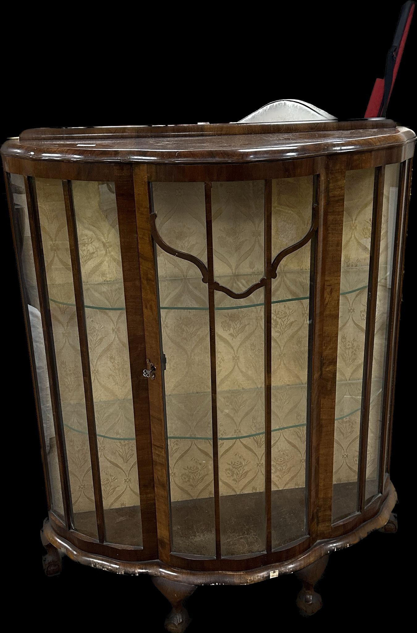 China cabinet with ball and claw feet, veneer missing, measures approximately 48 inches tall x 39 inches wide and 15 deep