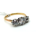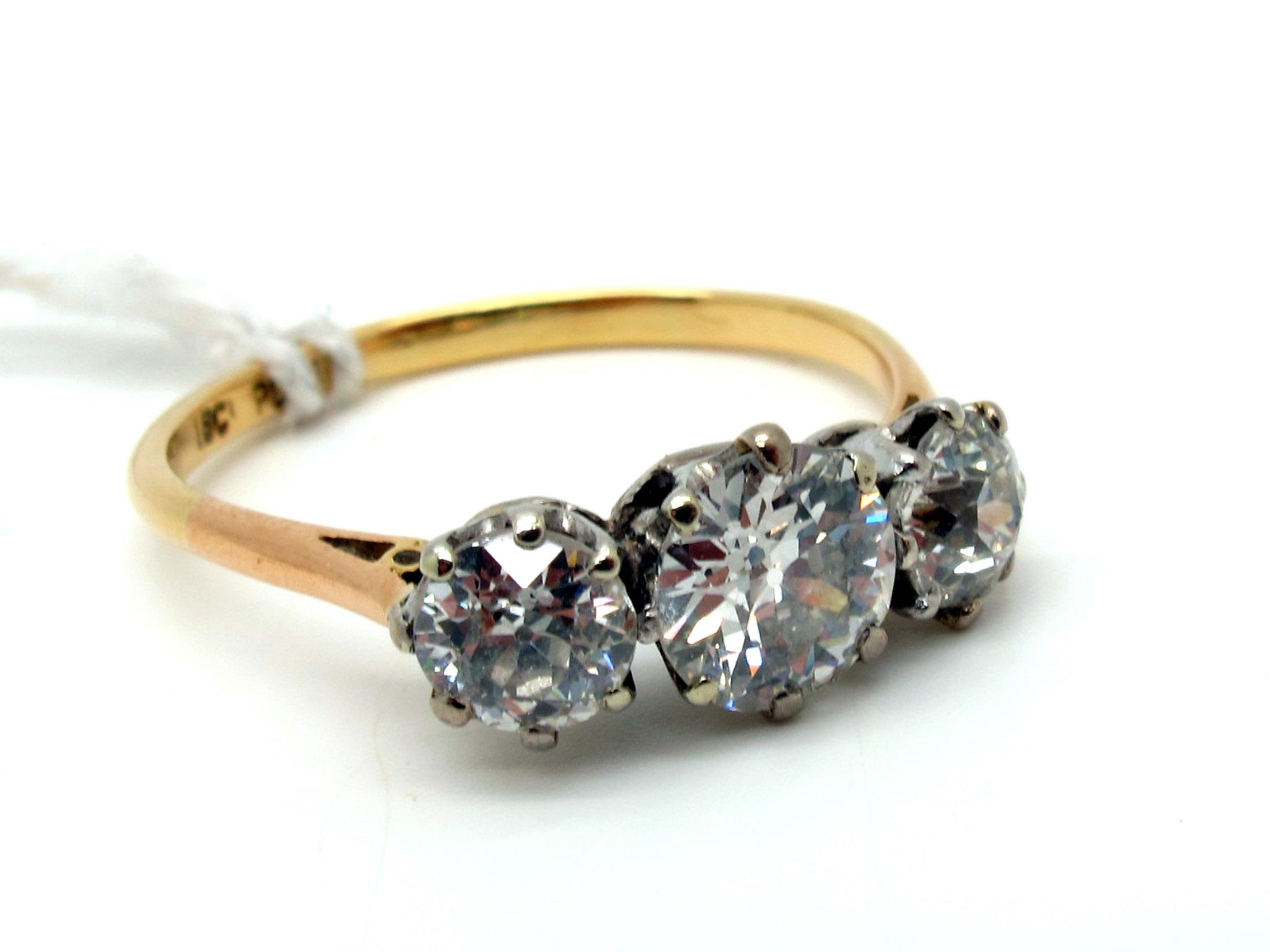 A Large Three Stone Diamond Ring, the graduated old cut stones claw set, between plain shoulders, stamped "18ct Plat" (finger size T).