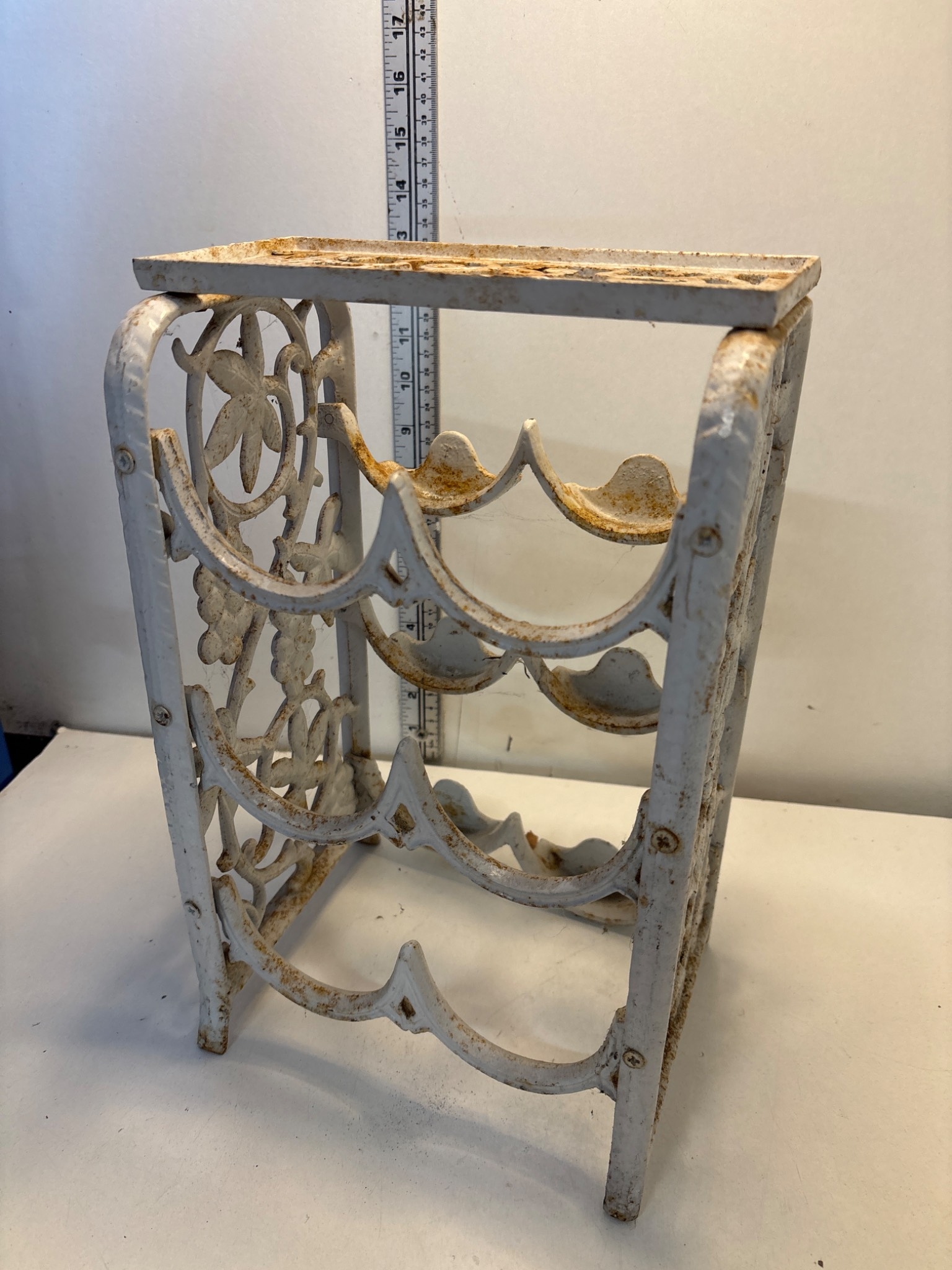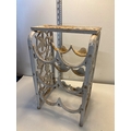 White-painted metal wine rack with decorative floral side panels, holds up to 6 bottles, measures approximately 12 inches in height.