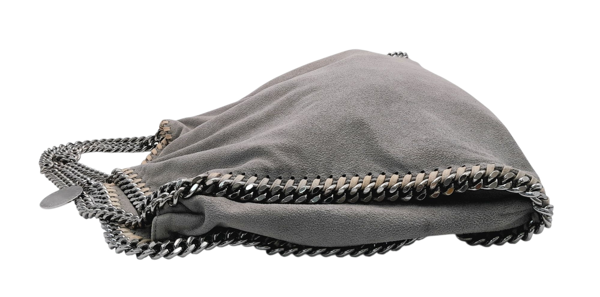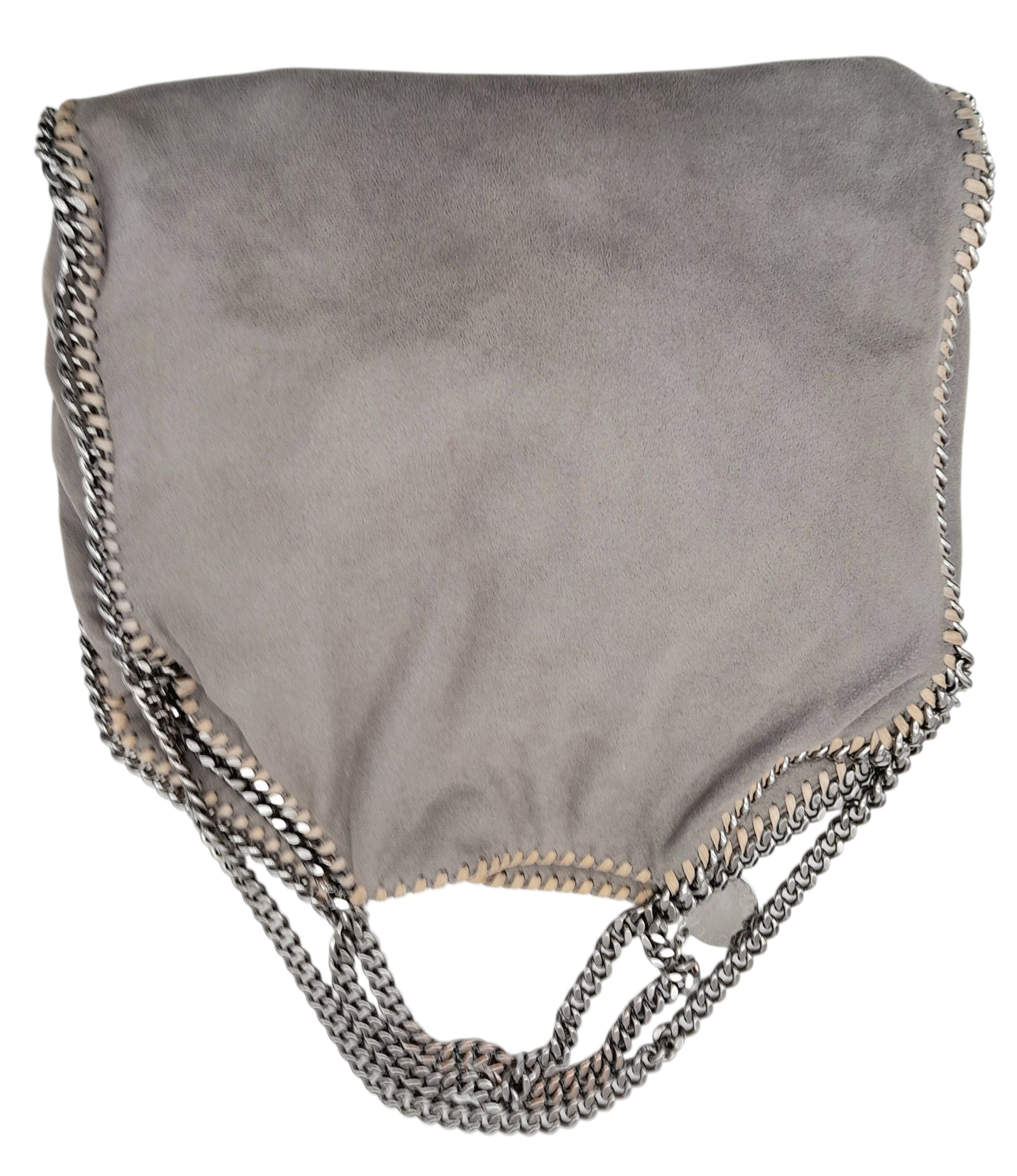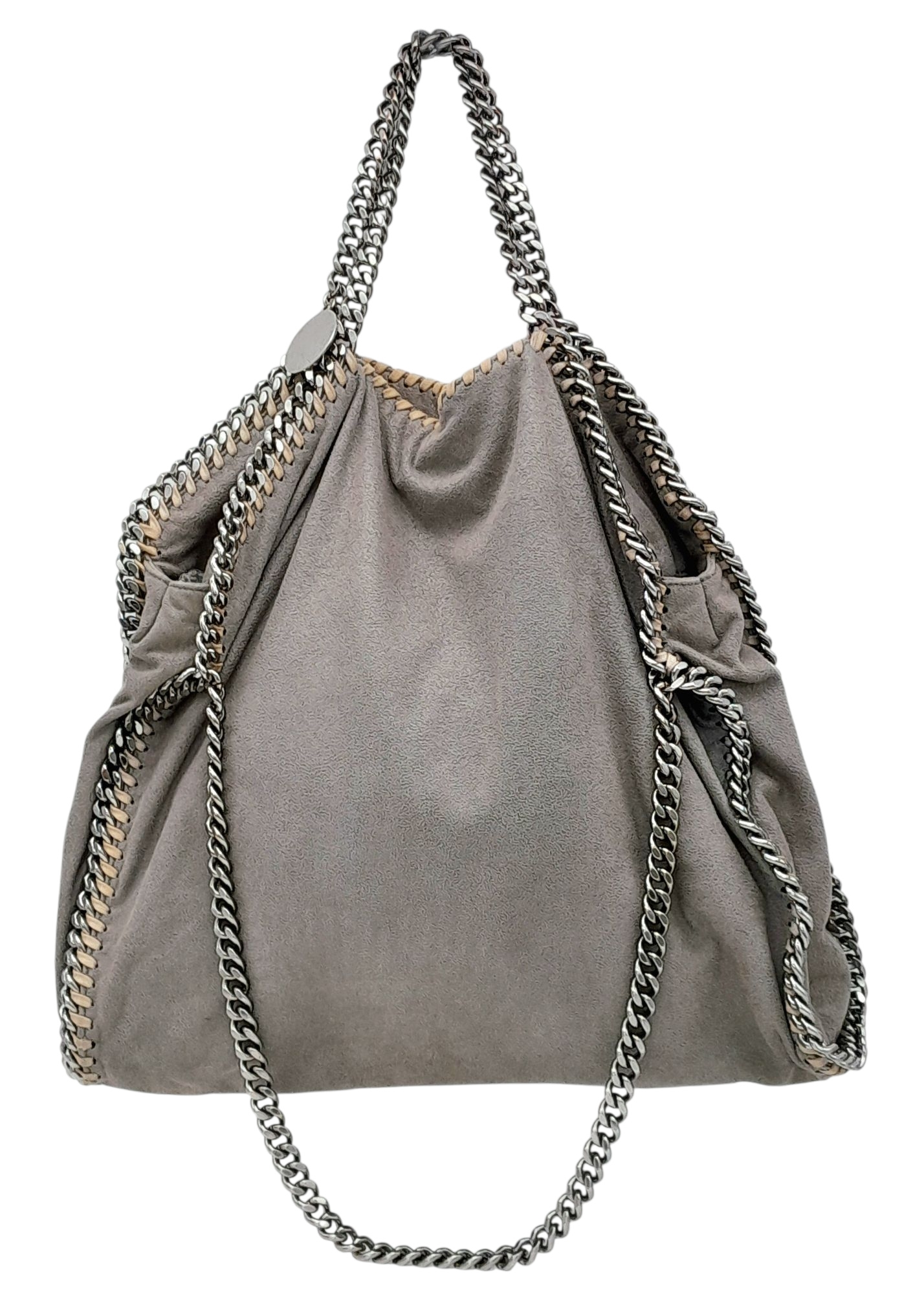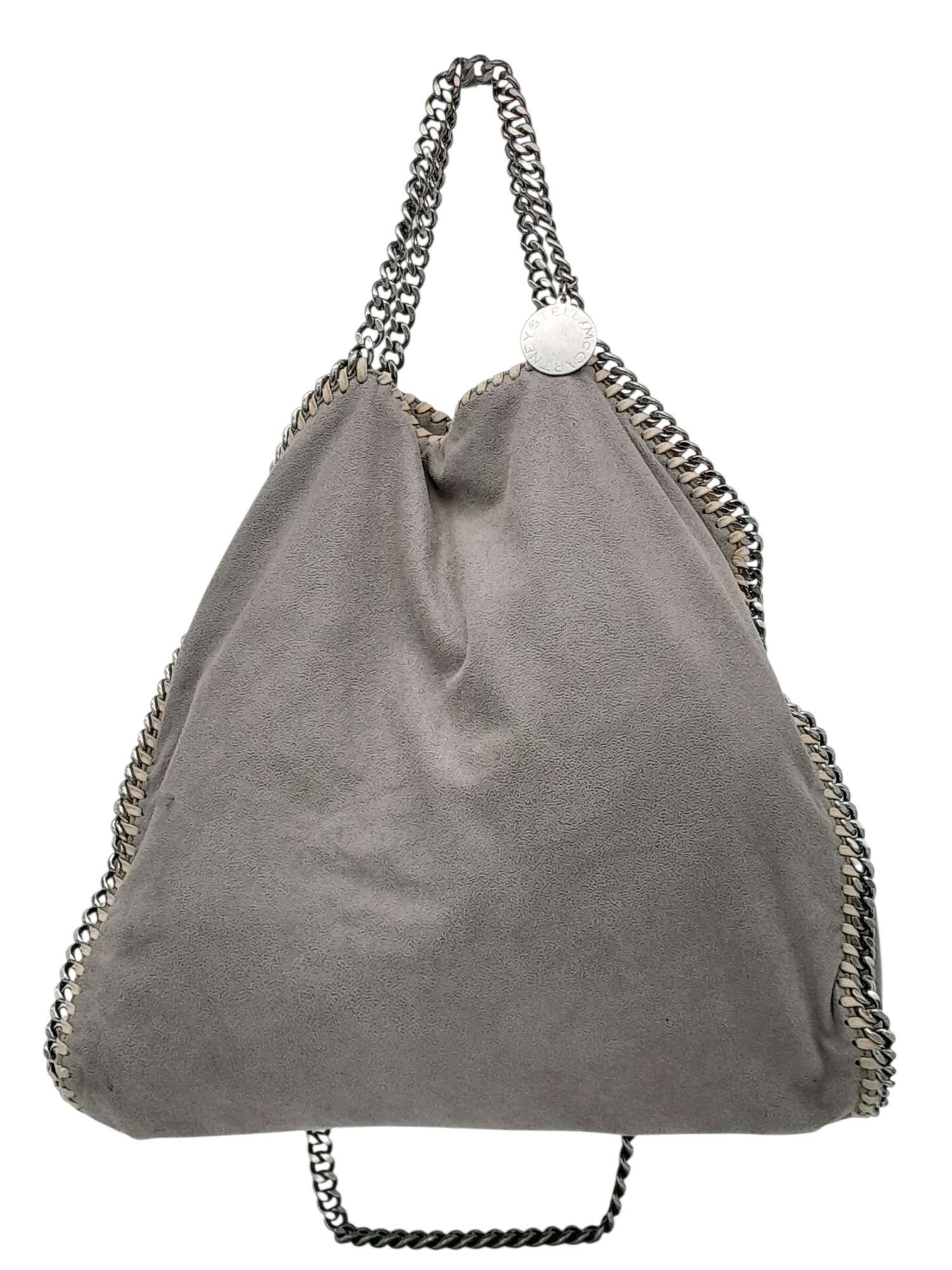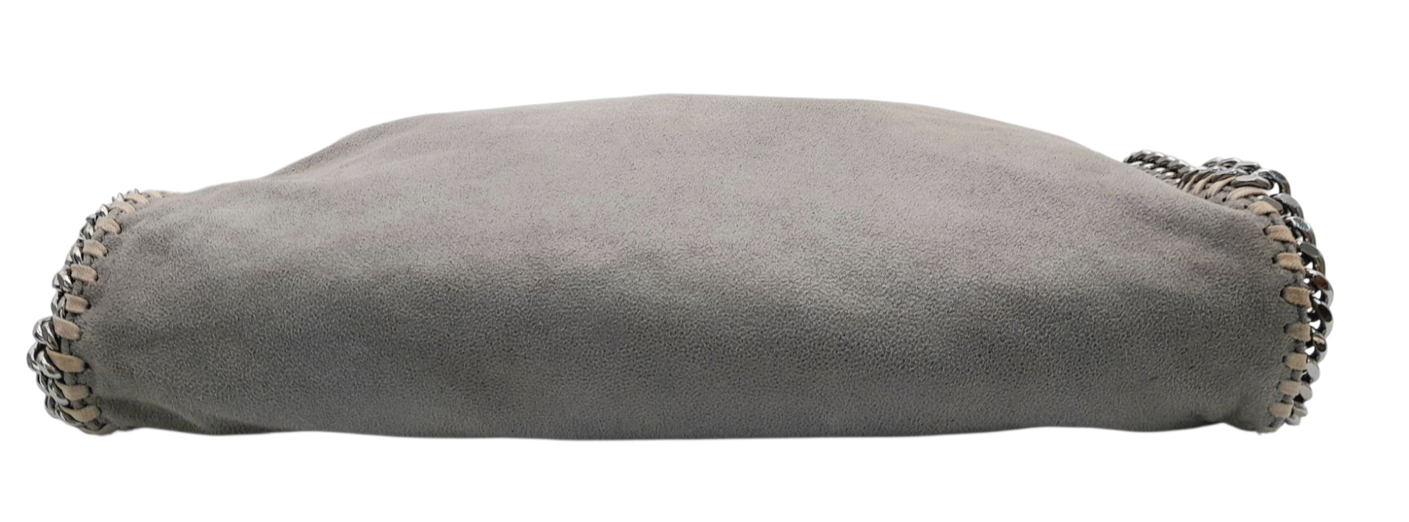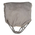 A Stella McCartney Falabella Fold-Over Tote Bag. Grey faux suede exterior with silver-toned hardware, shoulder strap, and magnetic snap closure. Pink logo-embossed textile interior with one main compartment and a zipped side pocket. Approx 38cm length x 26cm height x 10cm depth. Some signs of wear and creasing exterior, few stains interior. Please see photos or request a condition report. Ref: STK022894