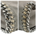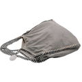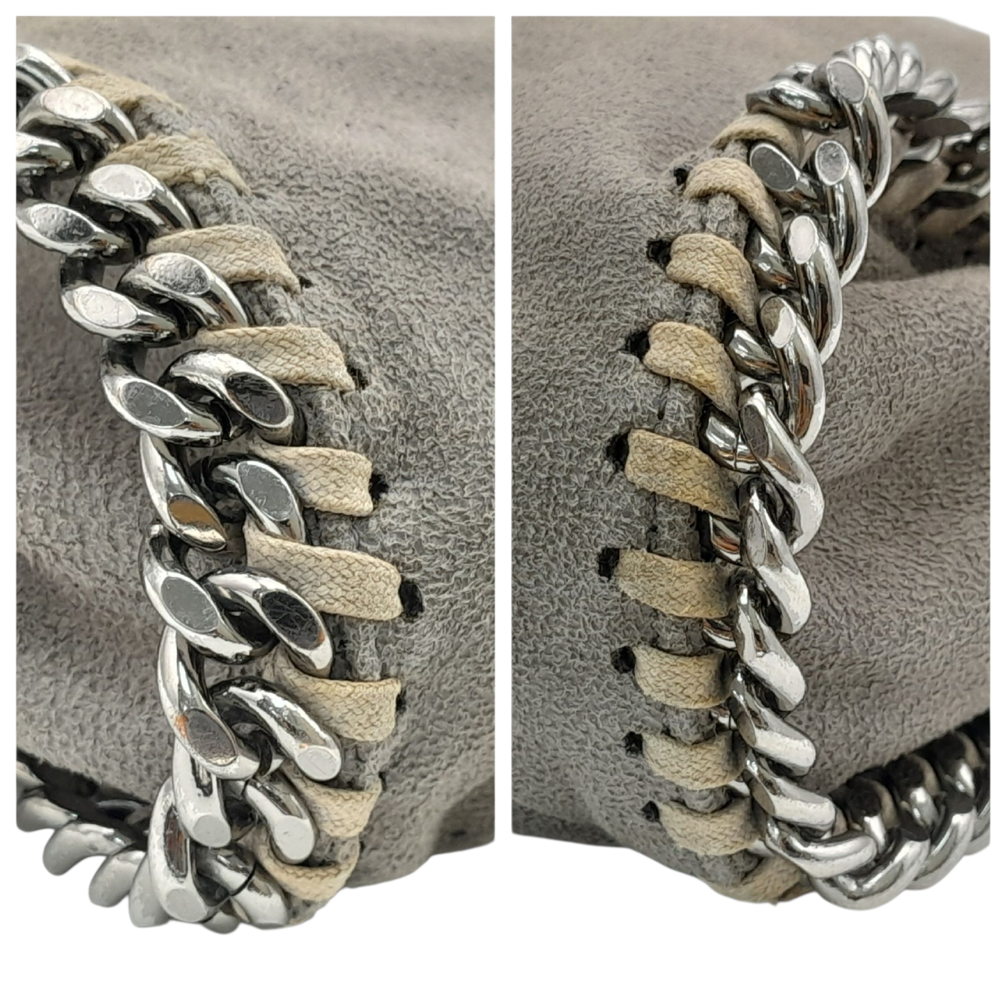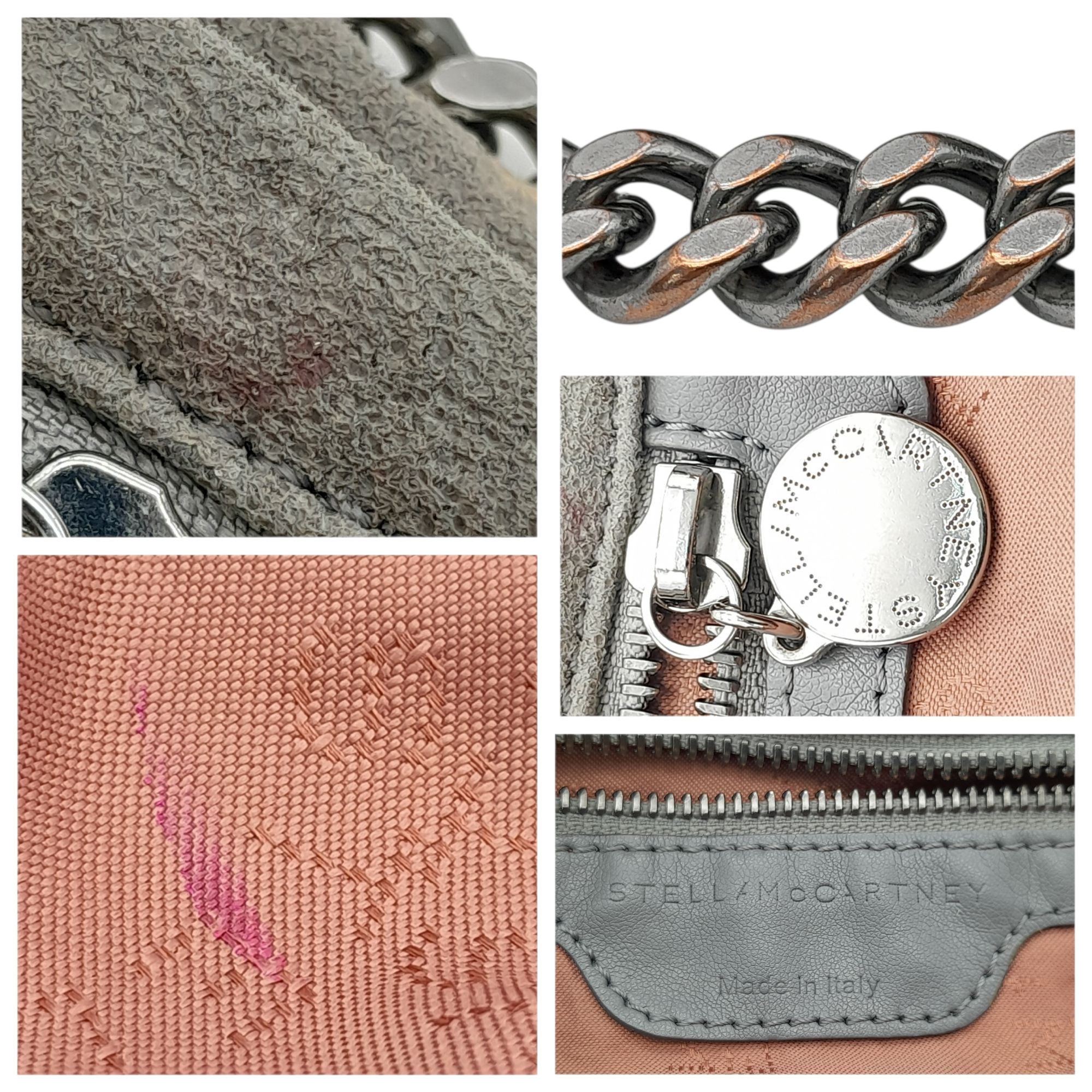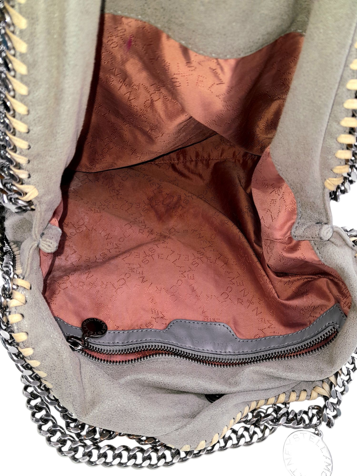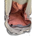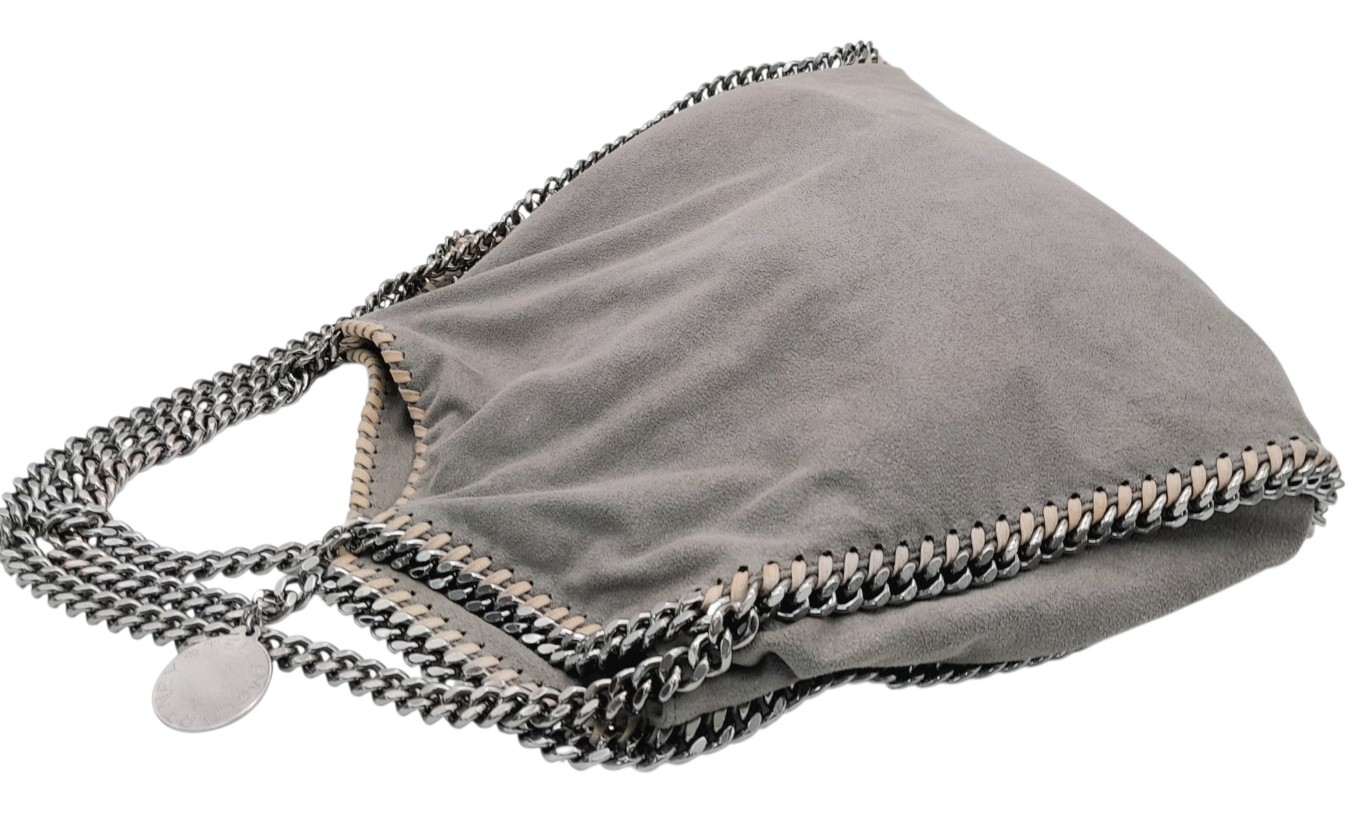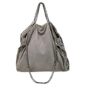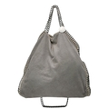 A Stella McCartney Falabella Fold-Over Tote Bag. Grey faux suede exterior with silver-toned hardware, shoulder strap, and magnetic snap closure. Pink logo-embossed textile interior with one main compartment and a zipped side pocket. Approx 38cm length x 26cm height x 10cm depth. Some signs of wear and creasing exterior, few stains interior. Please see photos or request a condition report. Ref: STK022894