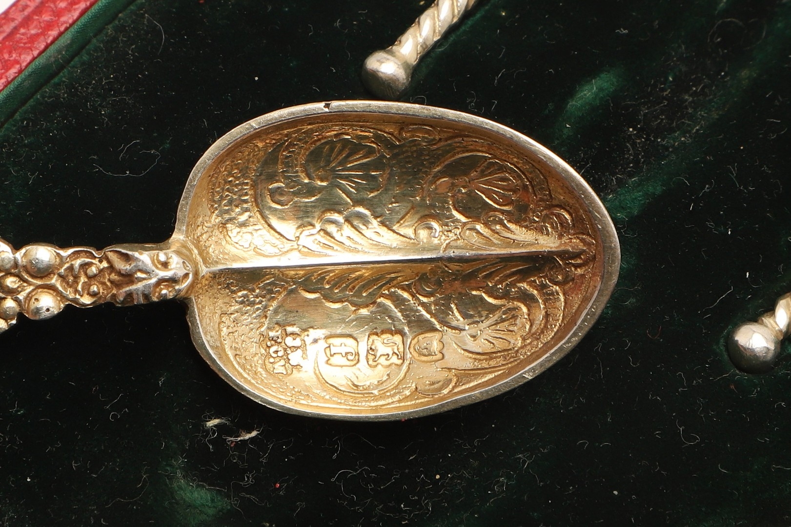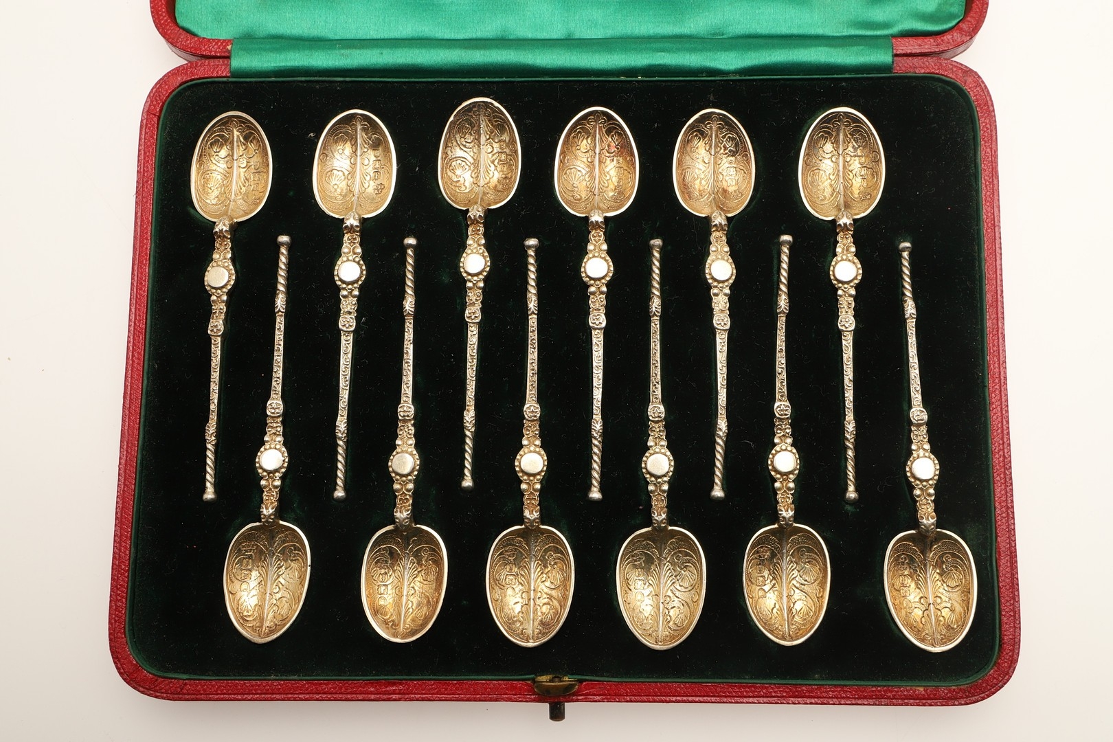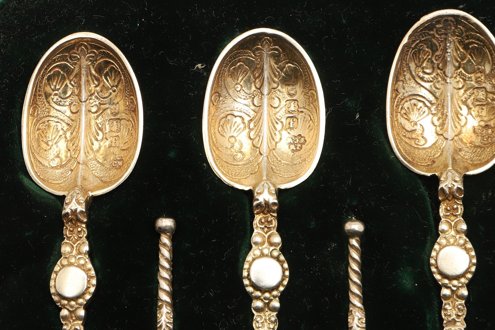 General age and handling wear, case has marks and scuffs, spoons have loss to the gilding in places.