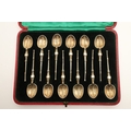 A CASED SET OF TWELVE EDWARD VII SILVER GILT CORONATION ANOINTING SPOONS. Of decorative design, each spoon 10.5cm in length, case measures 23cm x 17cm. Hallmarked Wakely & Wheeler (James Wakely & Frank Clarke Wheeler), London, 1901. Total silver weight 4.2ozt. Includes literature card.