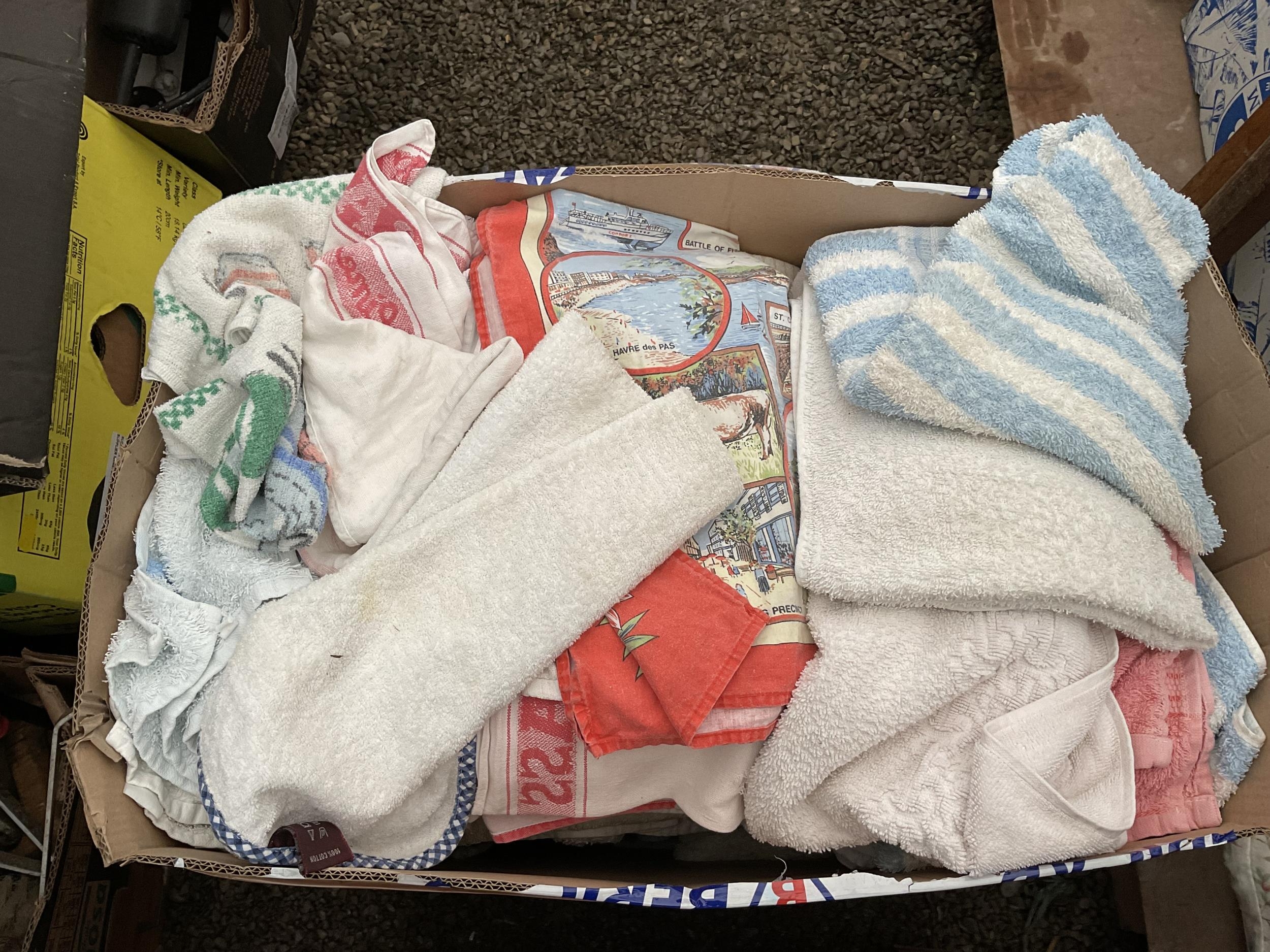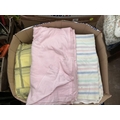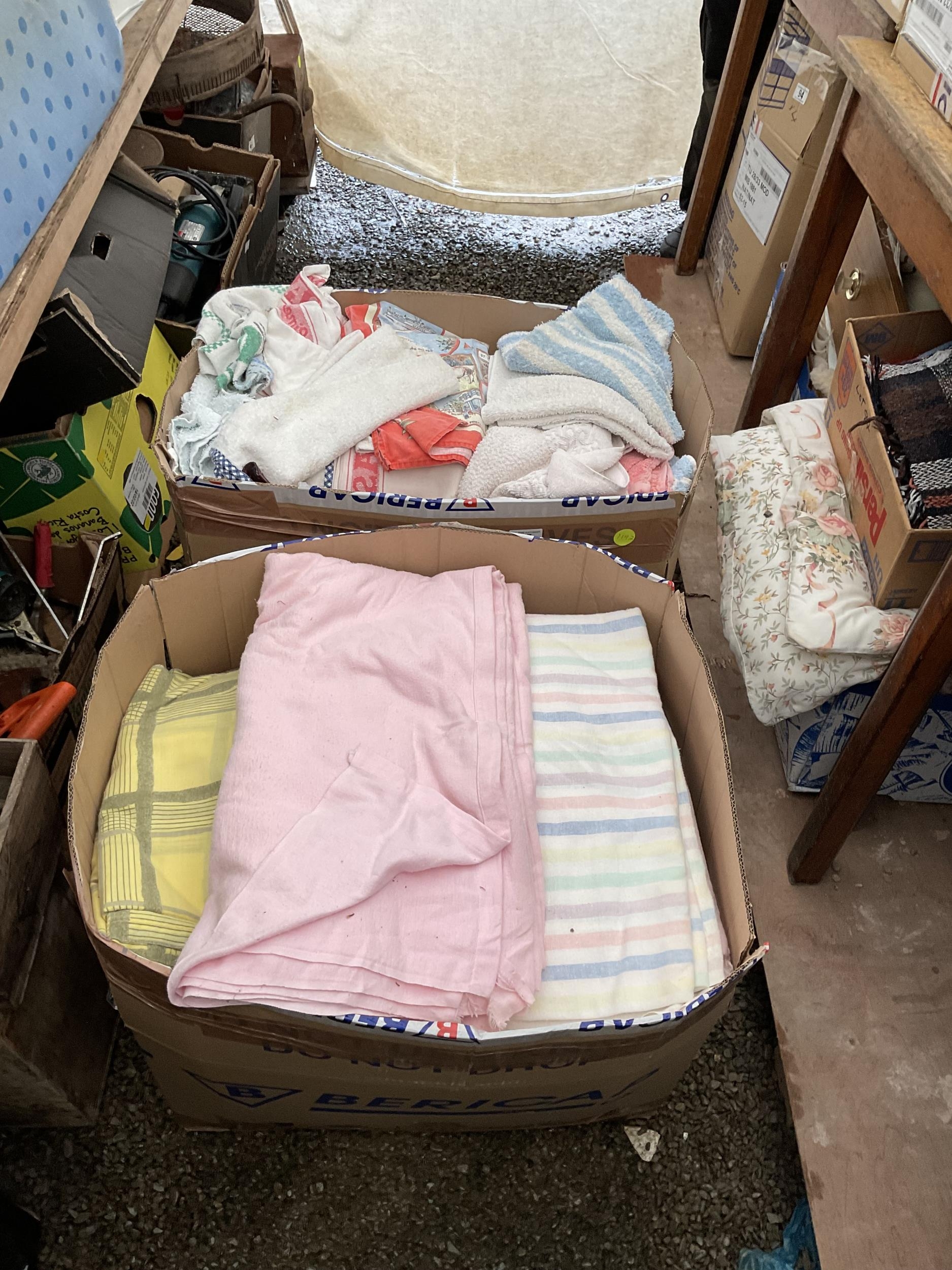 2 BOXES OF TOWELS SHEETS ETC
