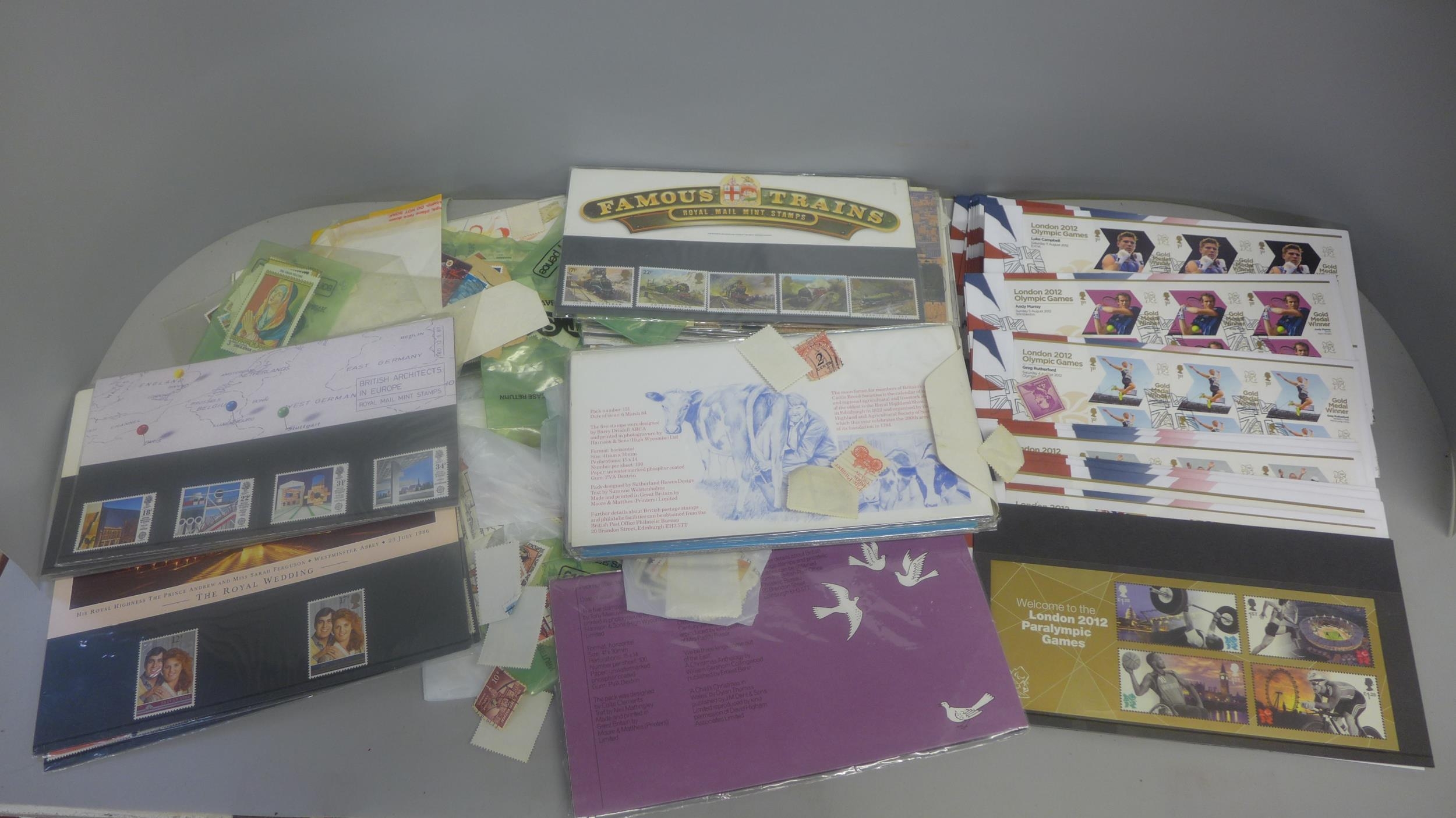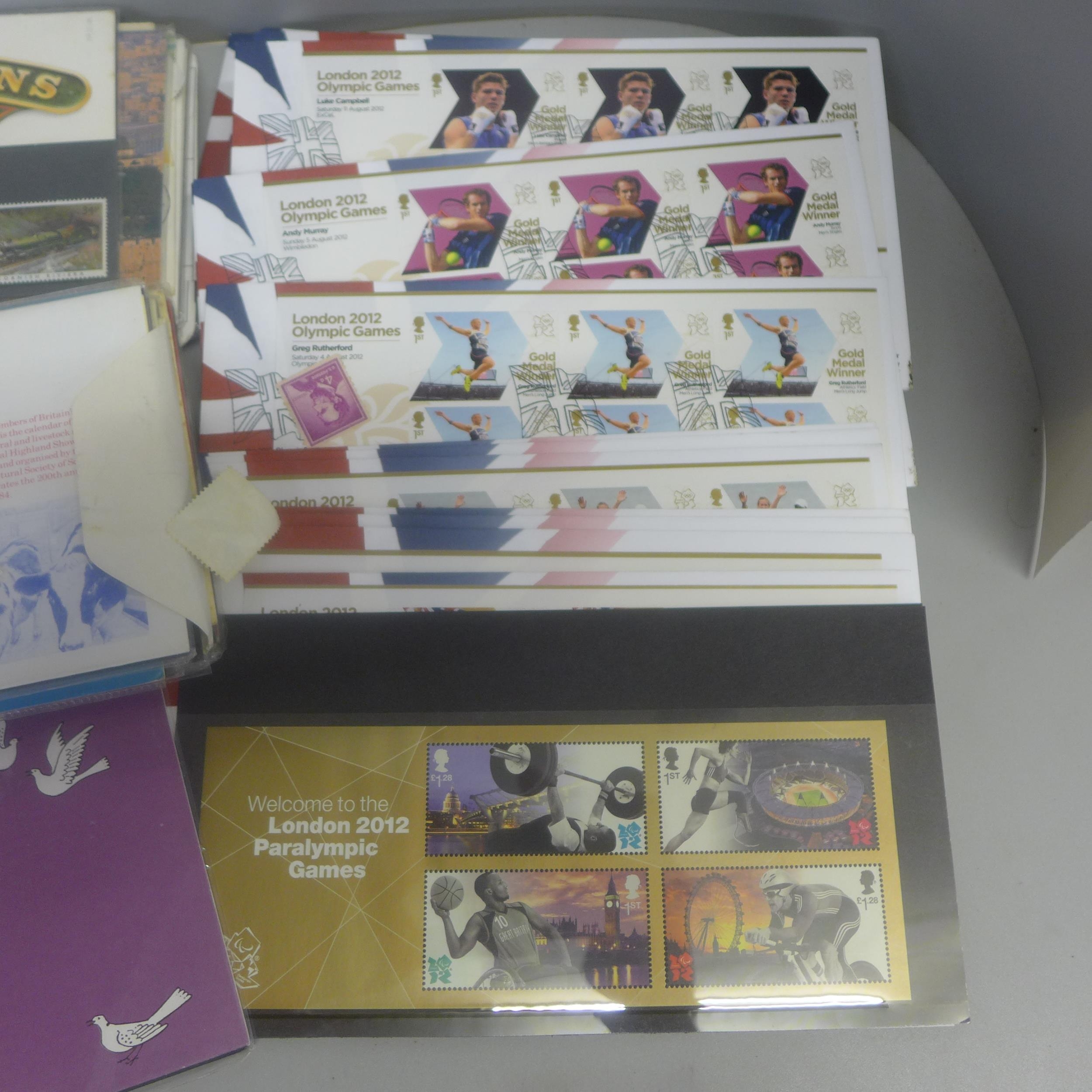 A collection of Olympic first day covers, Royal Mint stamp packs and other loose stamps