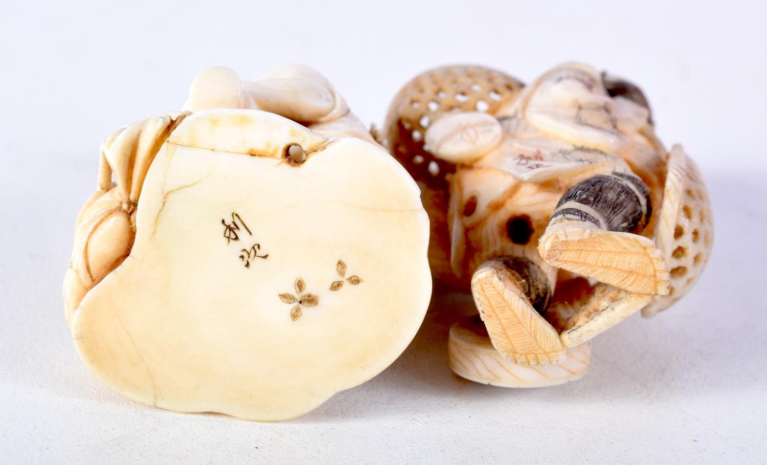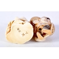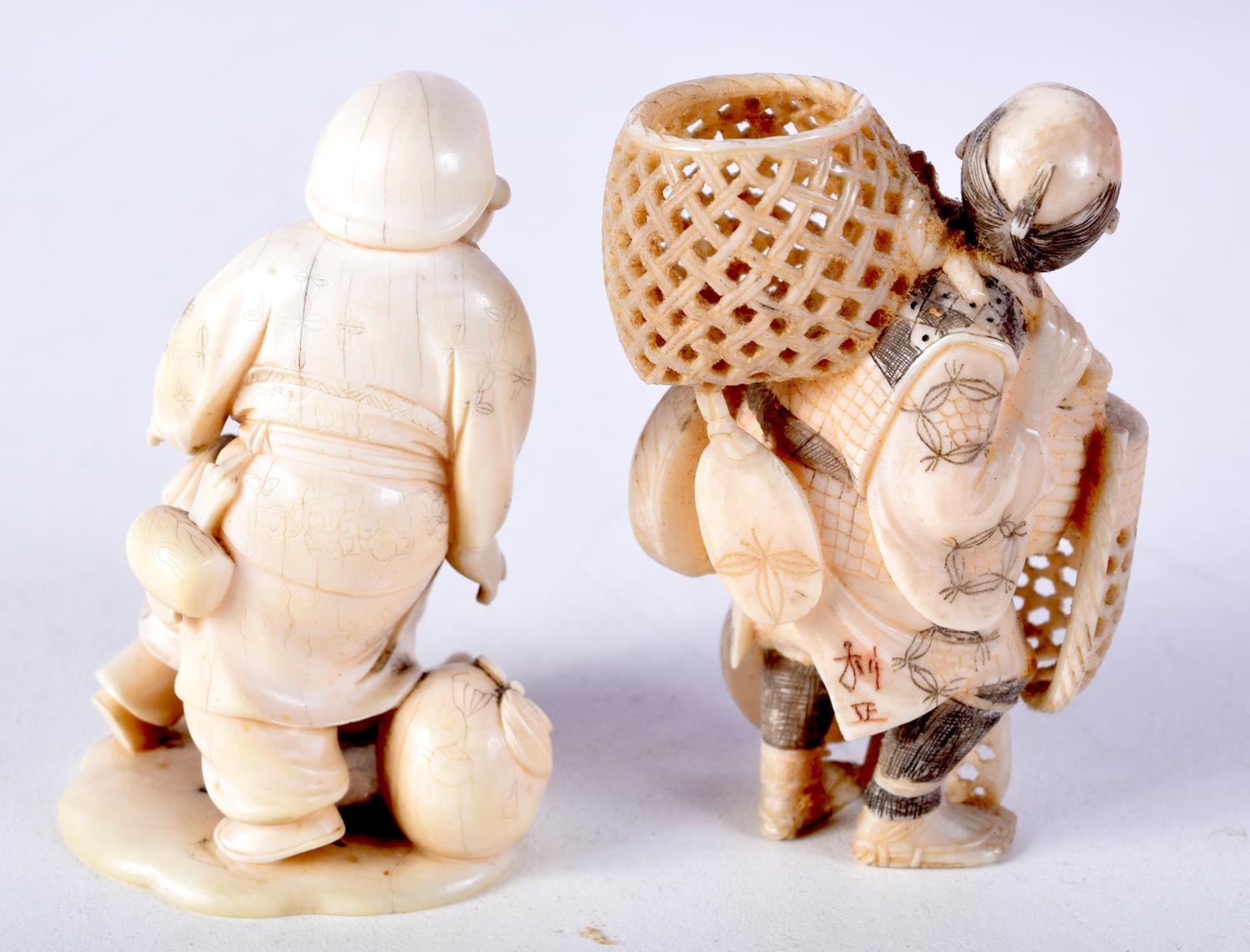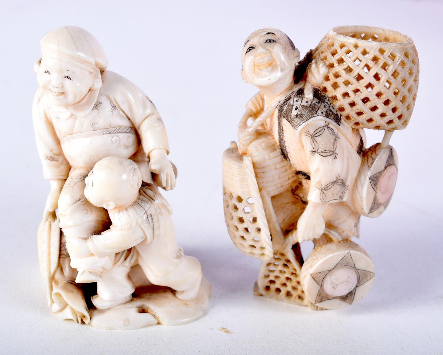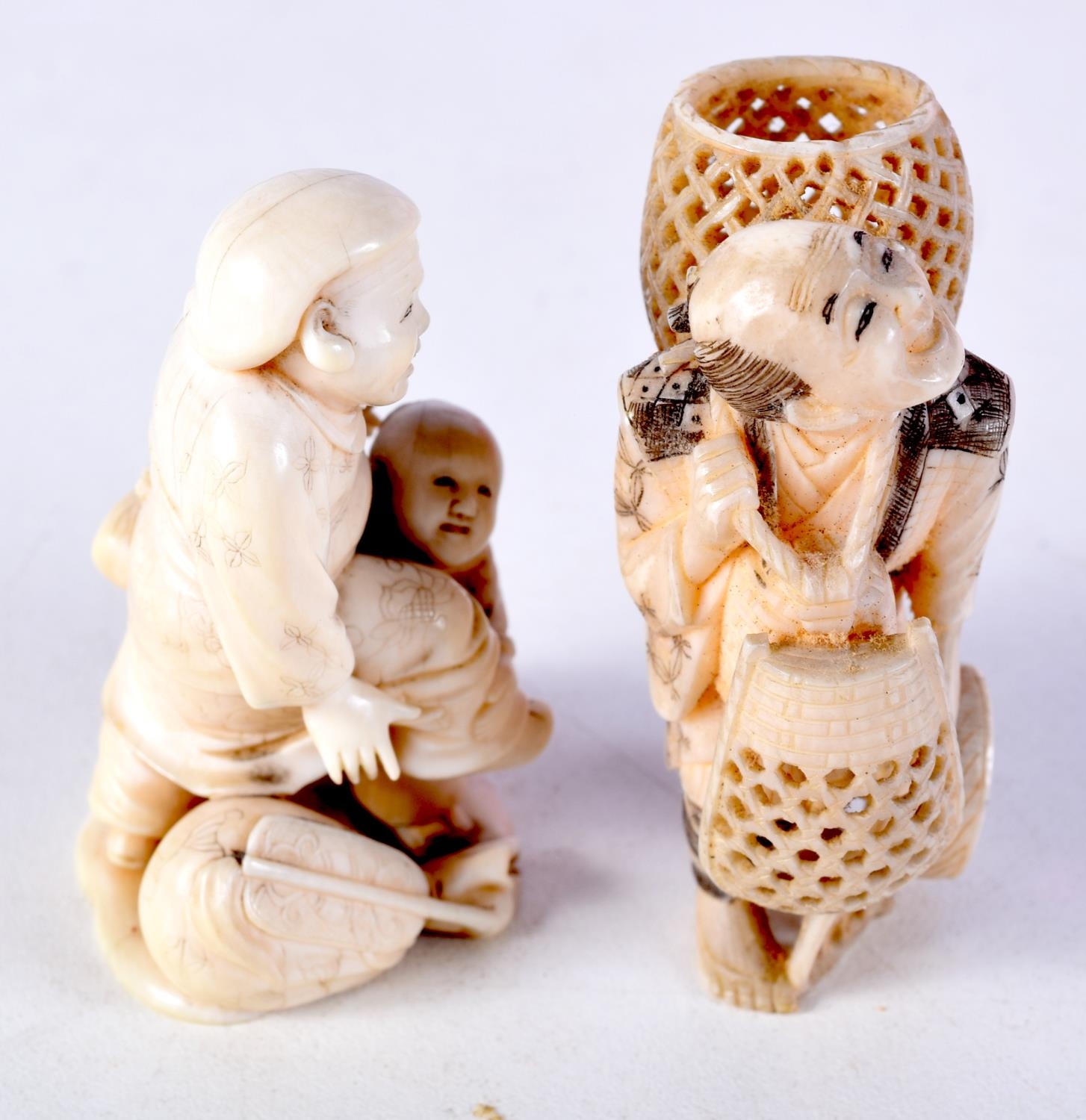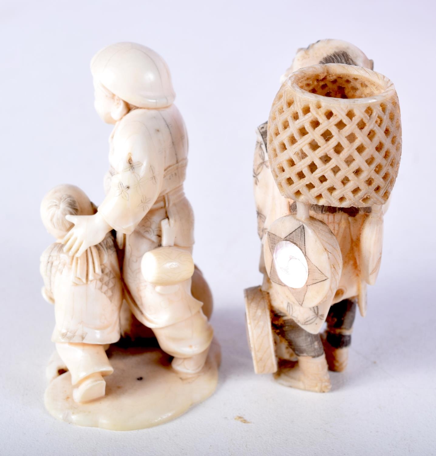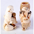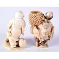 TWO 19TH CENTURY JAPANESE MEIJI PERIOD CARVED IVORY OKIMONO one modelled as a basket seller. Largest 6 cm x 3 cm. (2)