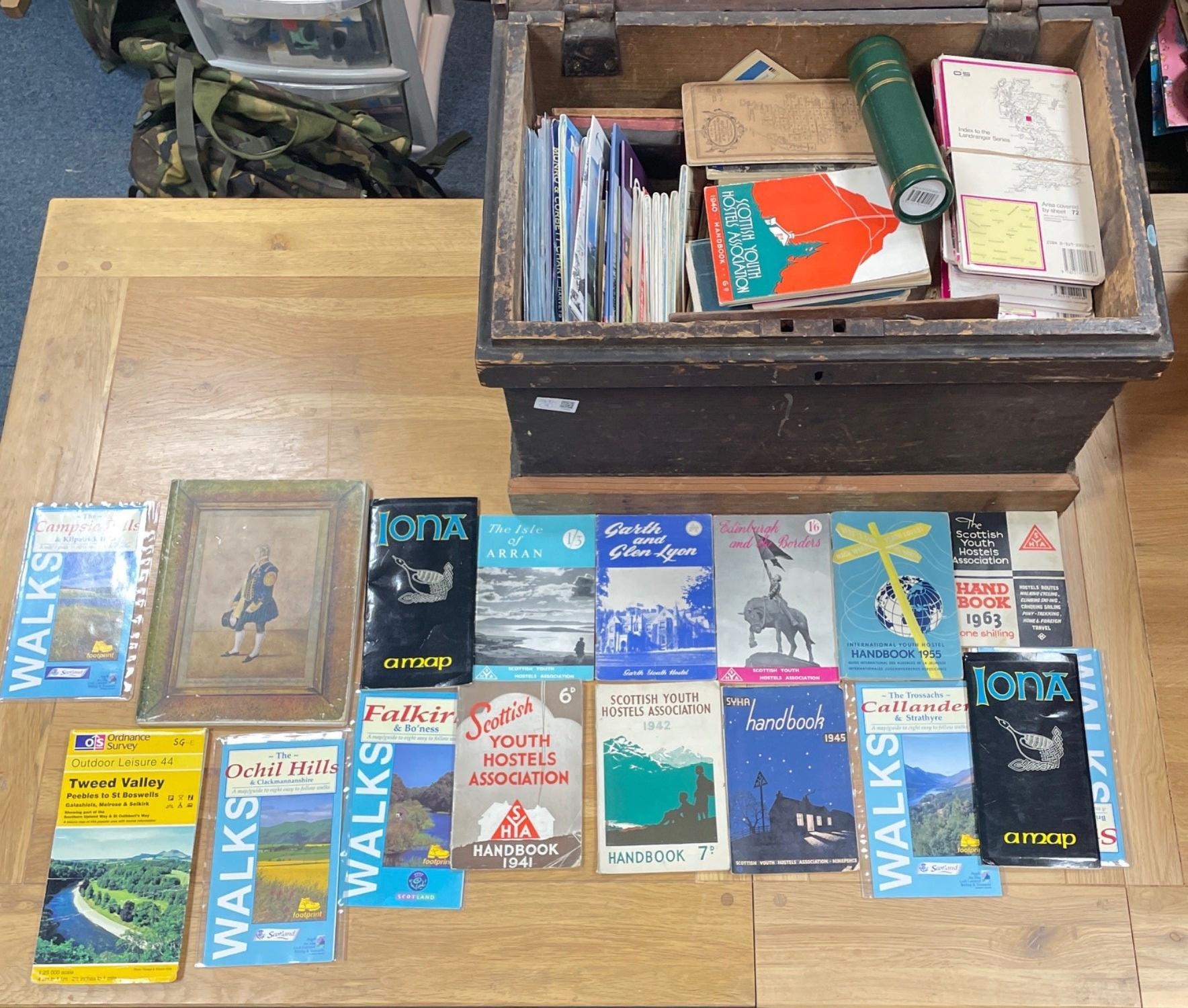 Ready for a voyage of exploration - a wooden twin-handled chest (58x36x33cm approx) plus a bundle of Youth Hostels Association booklets including Scottish Hill Tracks - North and South as well as the SYHA handbook for 1947. Also vintage geography school books including "GEOGRAPHY FOR CHILDREN on a perfectly easy plan adapted for the use of schools and private families" by John Guy published 1874 and a COMPENDIUM OF GEOGRAPHY published 1860