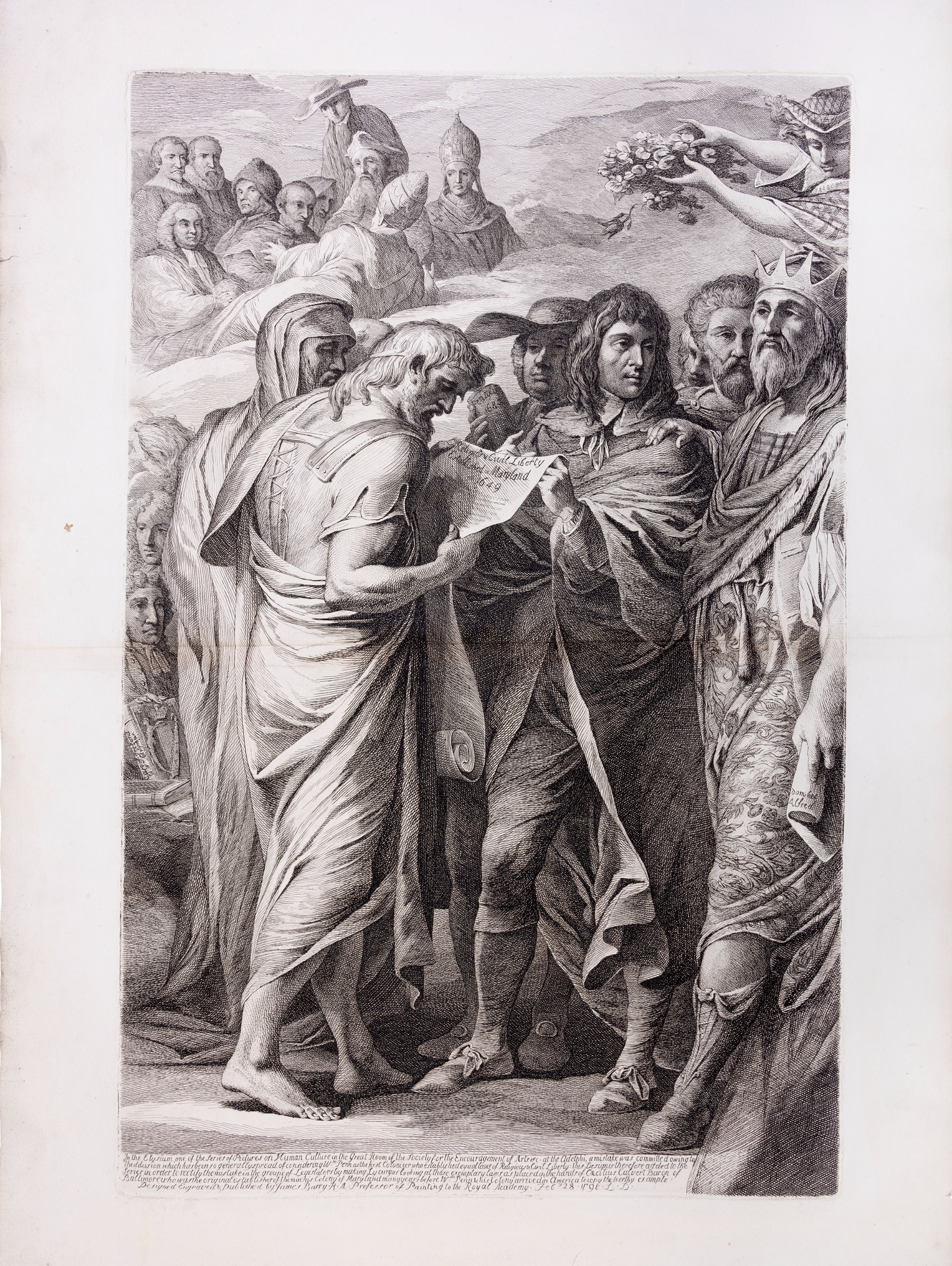 JAMES BARRY RA (1741-1806) Lord Baltimore and the Group of Legislators Etching and engraving, Pressly 1981.24, II/II, 74.5 x 47cm (plate); 84 x 62.5cm (sheet) First published by James Barry 1793; 1808 impression Inscription: Lettered below the image In the Elysium one of the Series of Pictures on Human Culture in the Great Room of the Society for the Encouragement of Arts &c. at the Adelphi, a mistake was committed owing to the delusion which has been so generally spread of considering Wm. Penn as the first Colonizer who established laws of Religious & Civil Liberty: this Design is therefore added to the Series in order to rectify the mistake in the groupe of Legislators by making Lycurgus looking at those exemplary laws as placed in the hands of Cacilius Cavert Baron of Baltimore who was the original establisher of thm in his Colony of Maryland many years before Wm. Penn & his Colony arrived in America to copy the worthy example. / Designed Engraved & Published by James Barry R.A. Professor of Painting to the Royal Academy. Feby. 28. 1793. L. D..