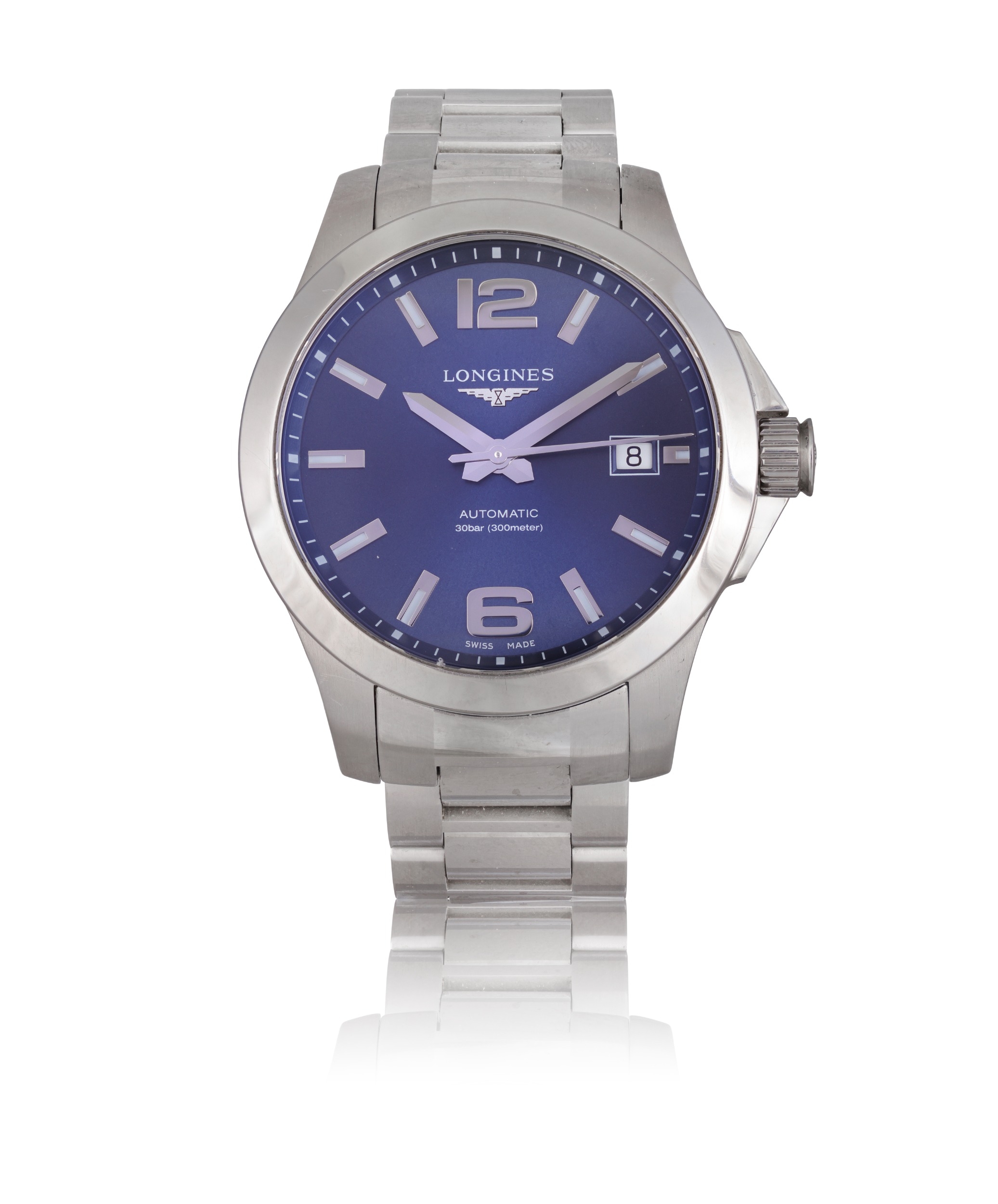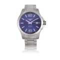 LONGINES CONQUEST AUTOMATIC WRISTWATCH, REF. L3.776.4 A stainless steel automatic wristwatch by Longines. Circa: 2010s Dial: Blue sunburst dial with applied baton hour markers and Arabic numerals at 12 and 6, outer minute track, date aperture at 3 o'clock, signed Longines Automatic 30 bar (300 meter) Movement: Automatic, Longines calibre L.888.2, ETA-based, movement no. 47840952 Case: Stainless steel case, screw-down caseback, ref. L3.776.4 Size: 38 mm diameter approx. Bracelet/Strap: Longines stainless steel bracelet with folding clasp, approximately 175 mm Gross Weight: 155 g approx. Signature: Dial, case and movement signed