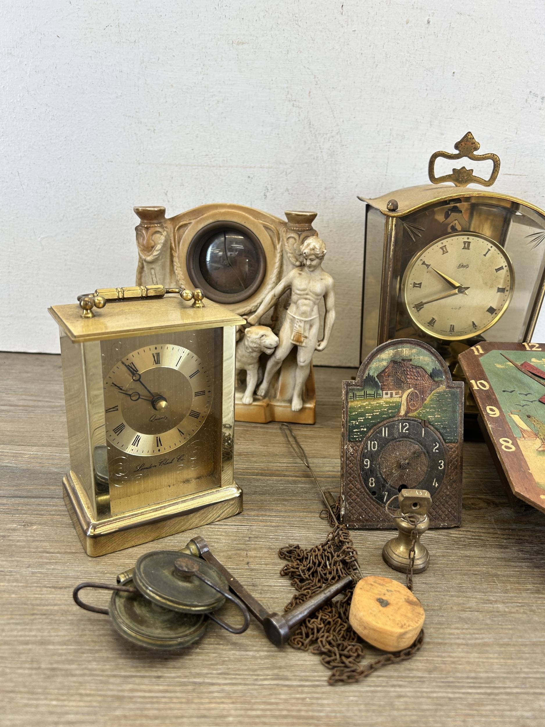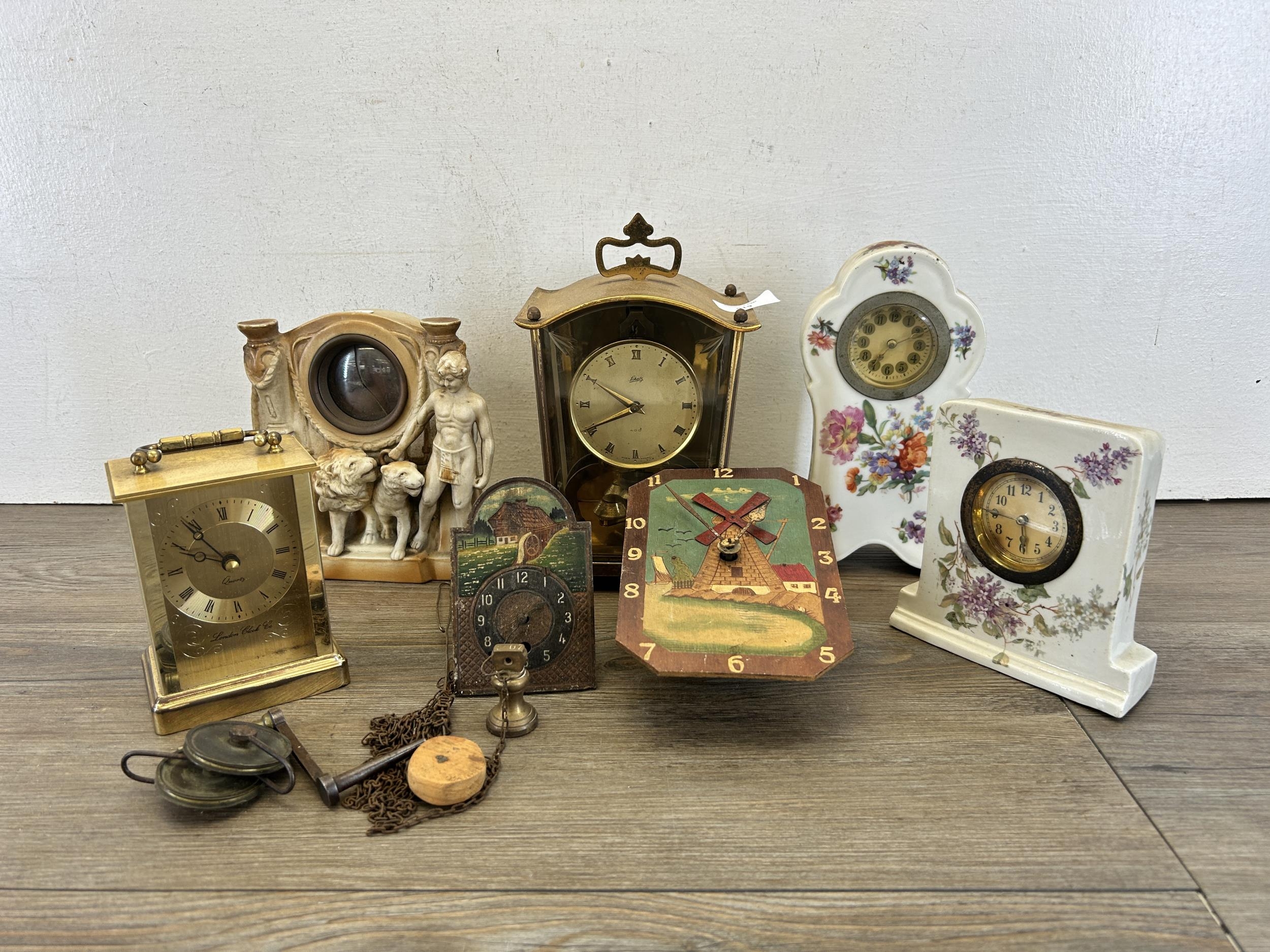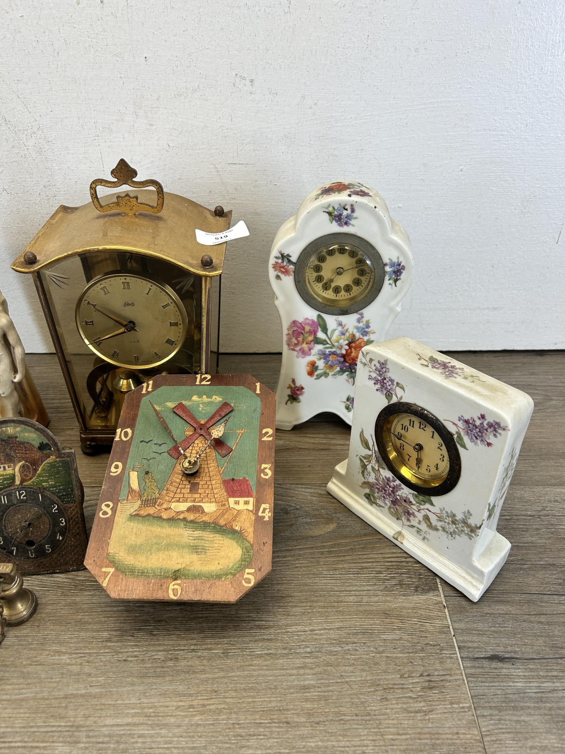 A collection of early/mid 20th century clocks to include German hand painted porcelain, Schatz 400 etc.