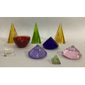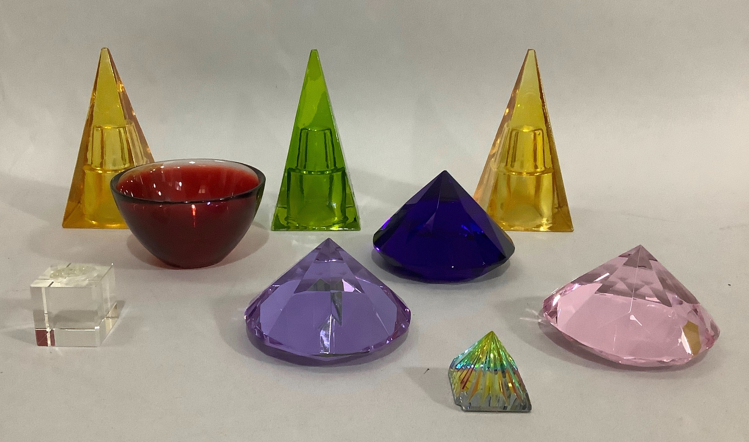 An Orrefors Fuga ruby glass dish together with three glass pyramids and various crystals