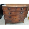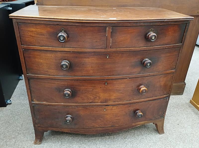 19TH CENTURY MAHOGANY BOW FRONT CHEST OF 2 SHORT OVER 3 LONG DRAWERS ON SPLAYED SUPPORTS - 101 CM TALL X 112 CM WIDE