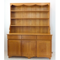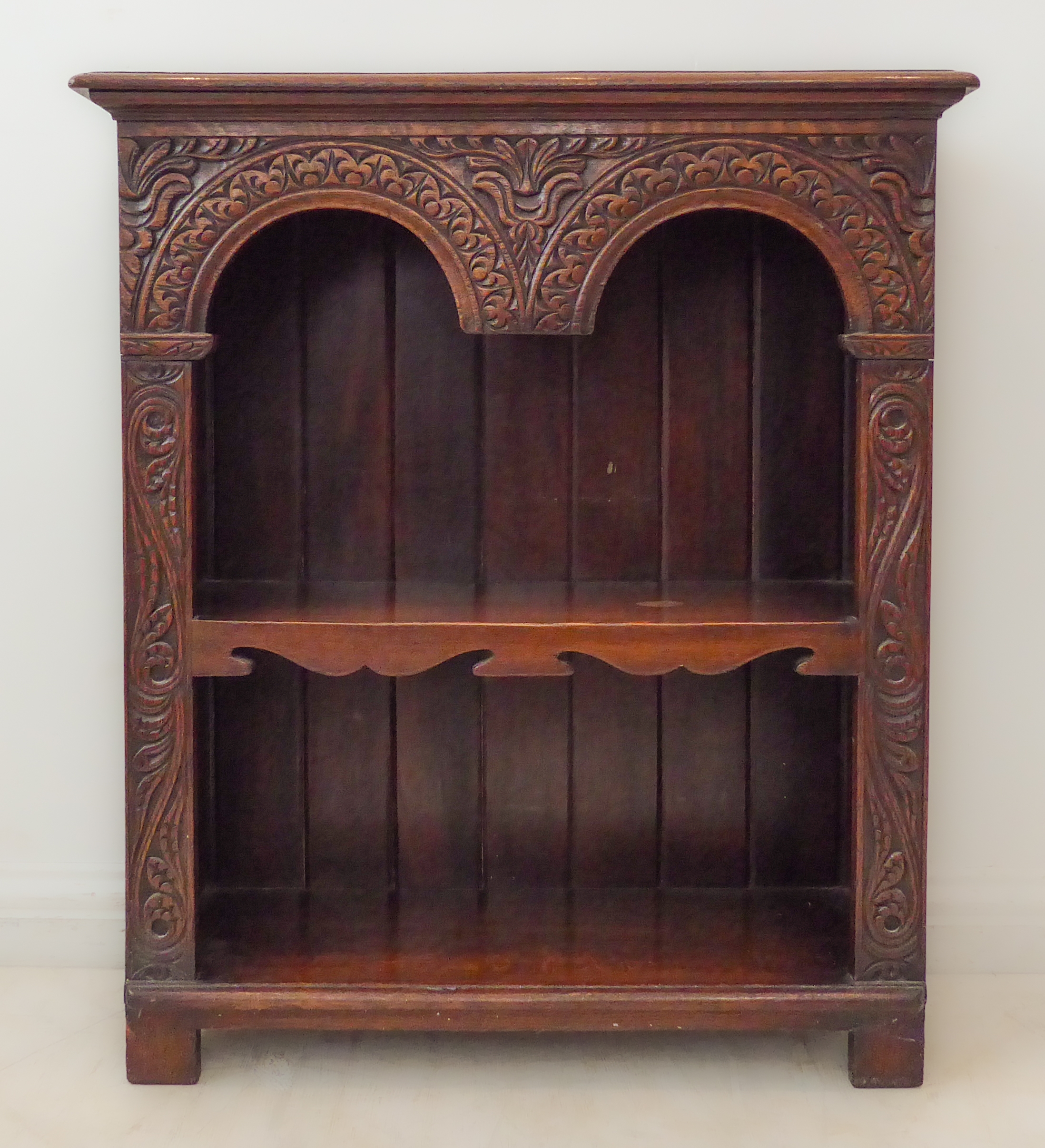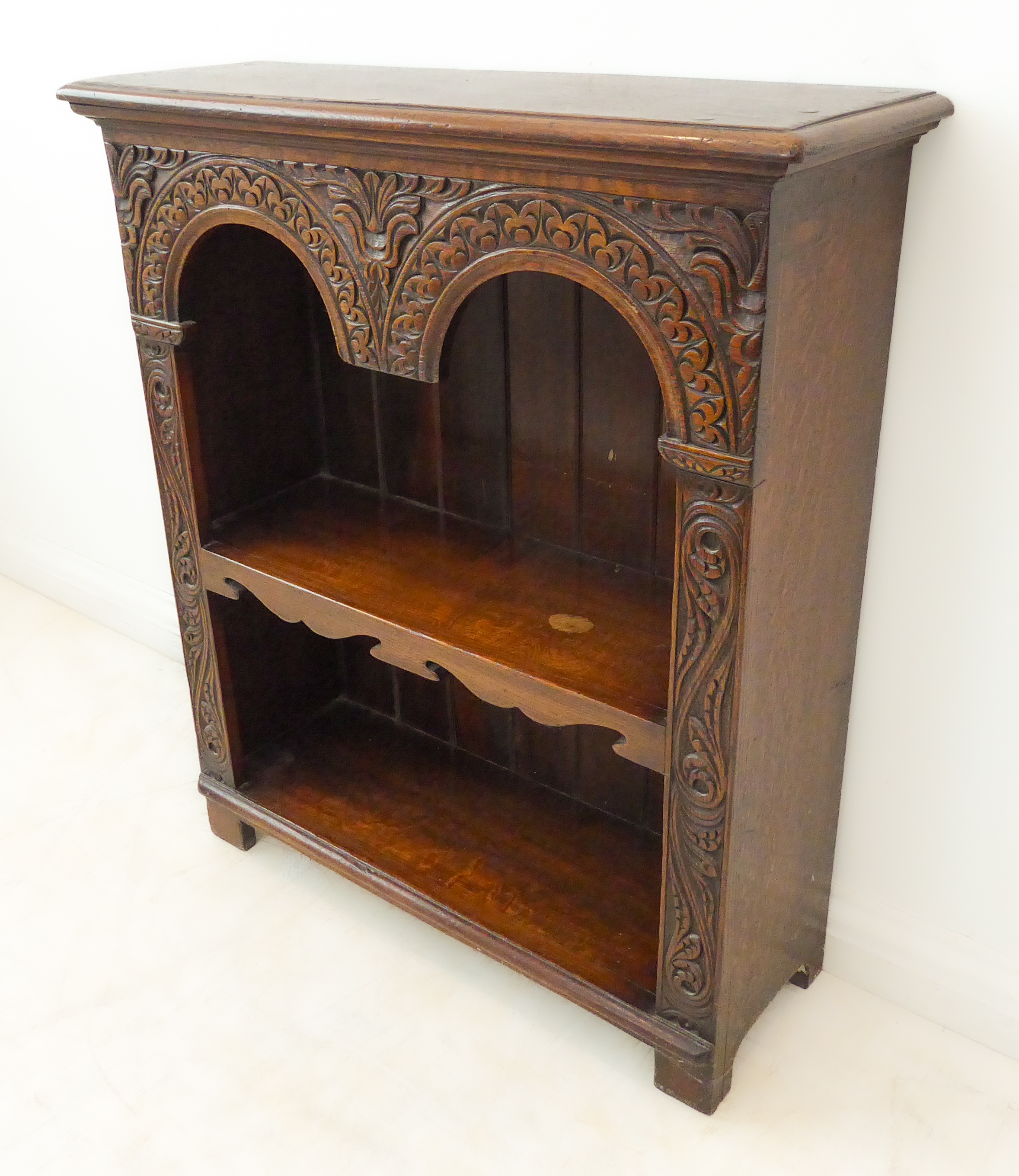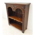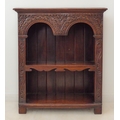 A fine quality solid oak reproduction open bookcase: the thumbnail moulded top above double arcading carved with stylised foliate designs and with further 17th century style carving to the uprights, single shaped shelf and on stile feet (76.5cm wide x 26cm deep x 88cm)