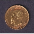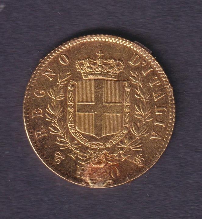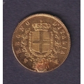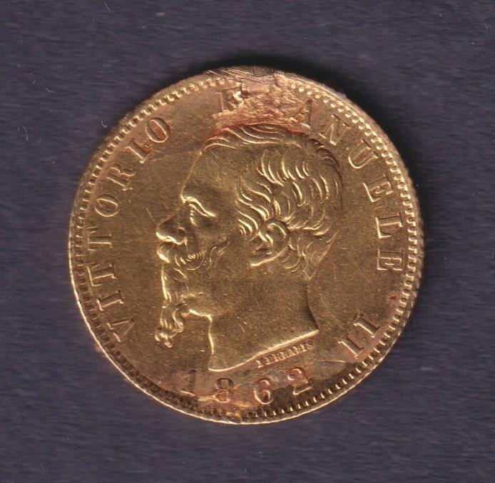 Italy 1862 gold 20L, with remnants of jewellery mount on edge and marks on front.