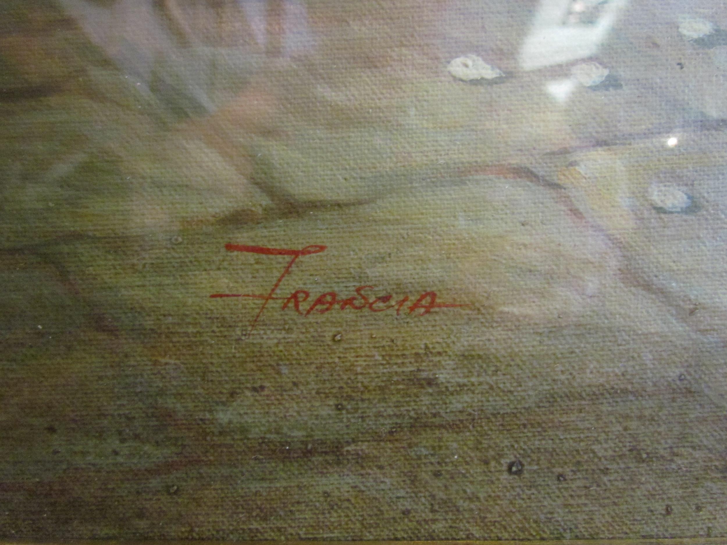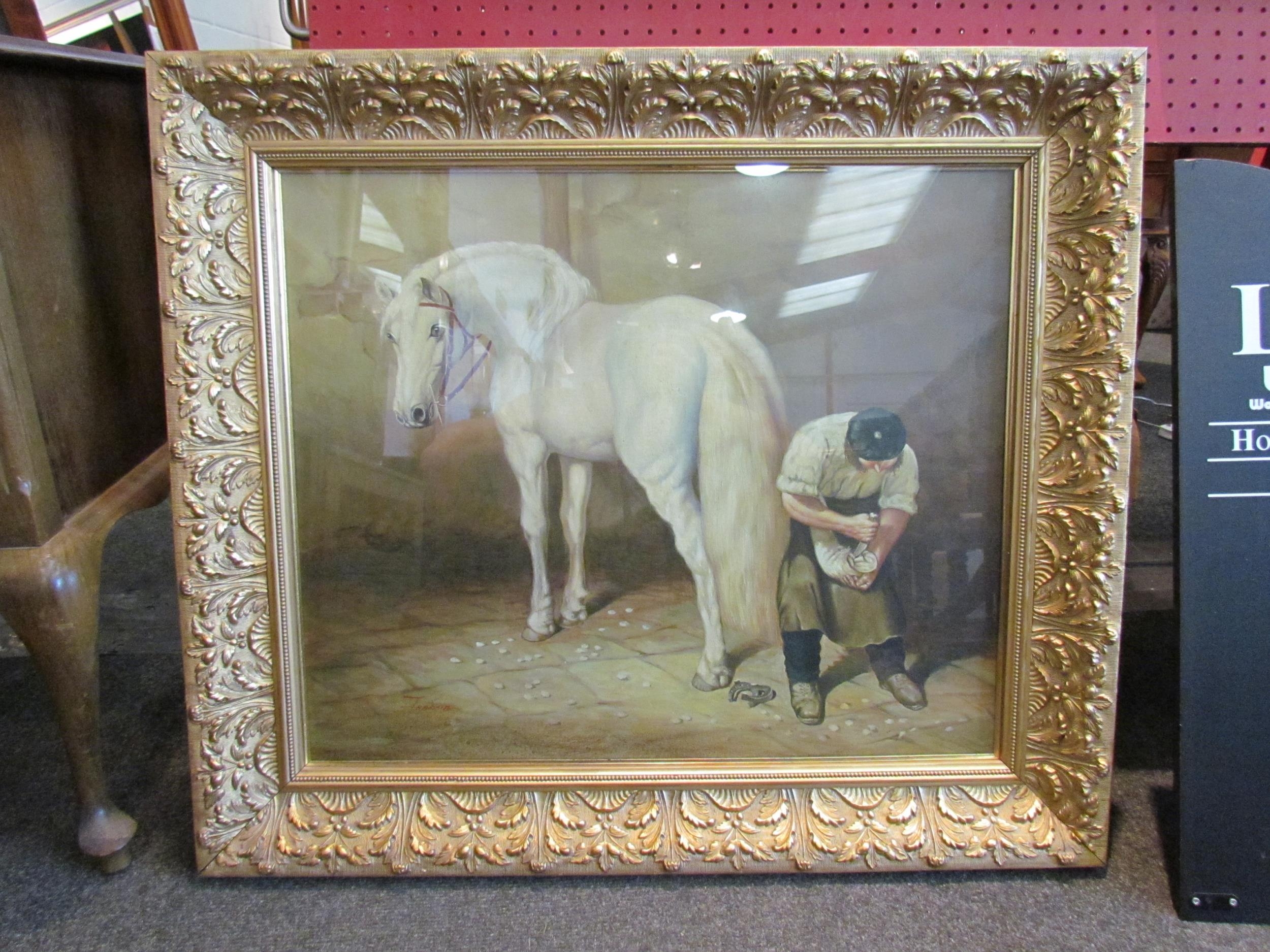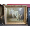 FRASCIA (XX): An oil on canvas of farrier tending to white horse, ornate gilt frame, 48.5cm x 68.5cm image size