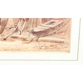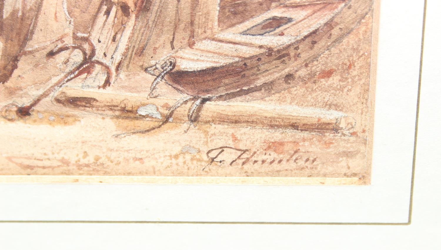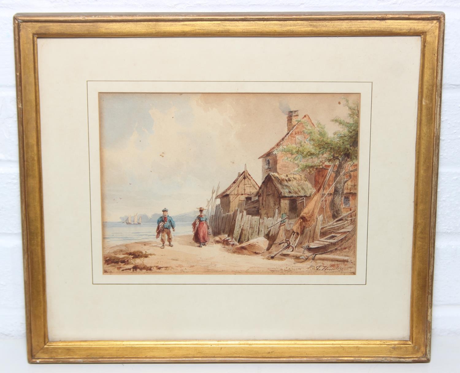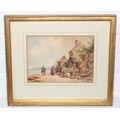 An antique watercolour of coastal cottages with figures, indistinctly signed lower right, in vintage gilt frame 39cm x 33cm